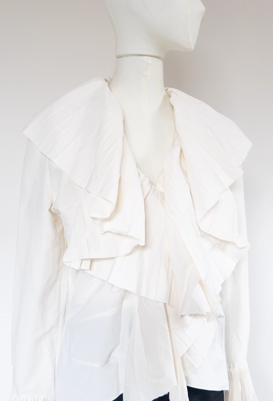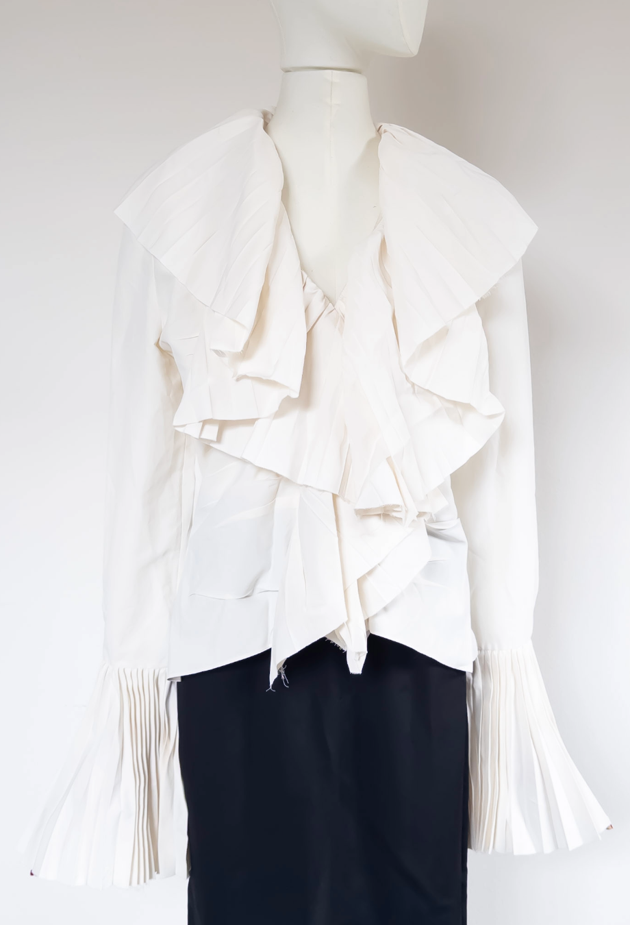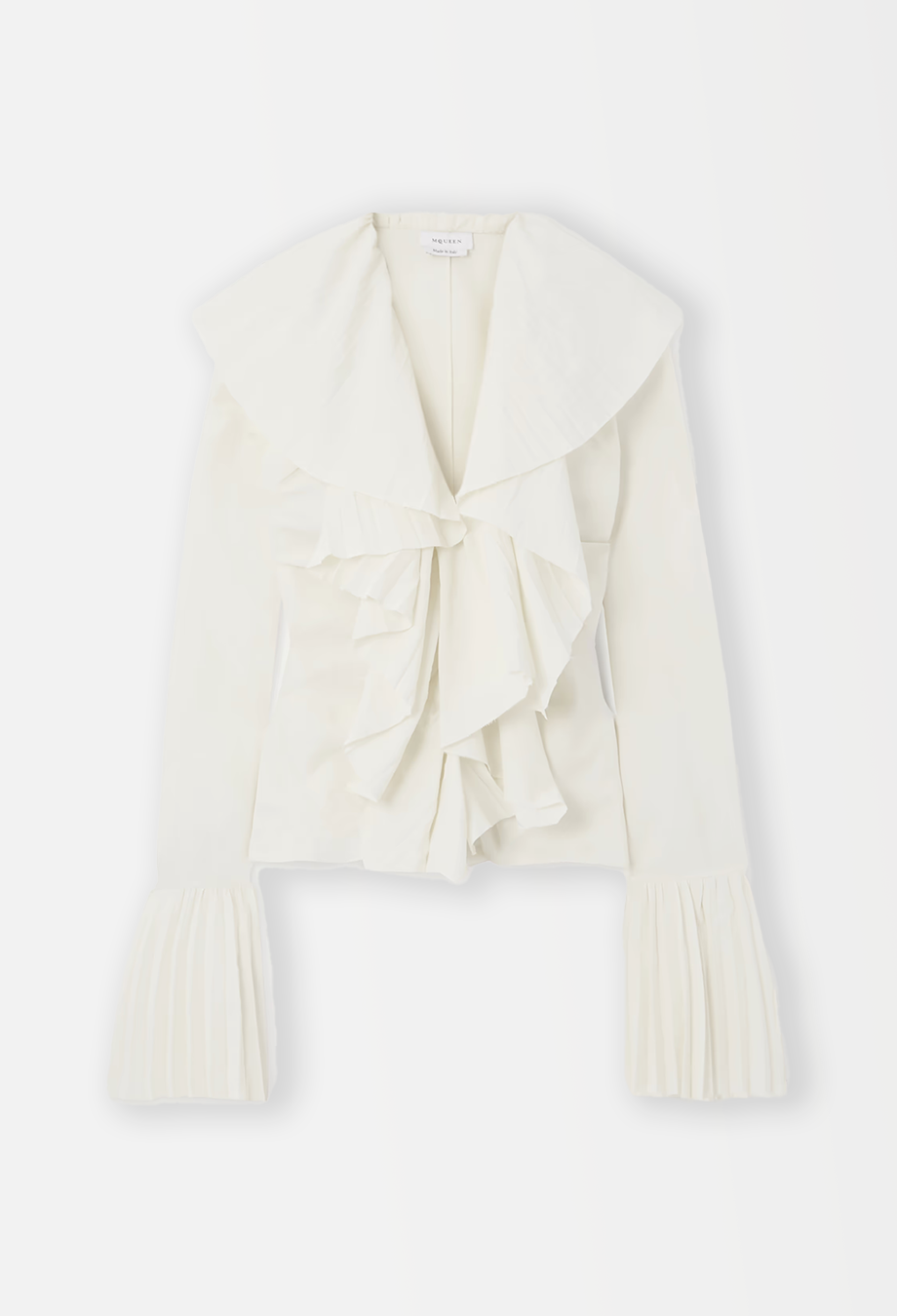 This absolutely stunning piece from Alexander McQueen Resort ’25 collection masterfully captures the house’s poetic tension between softness and structure. Crafted in Italy from an innovative blend of viscose and paper, it features an exaggerated open neckline framed by cascading, precisely pleated ruffles that sculpt the silhouette with theatrical volume. The same architectural pleating reappears at the elongated cuffs, flaring dramatically past the wrist. A piece that channels McQueen’s signature blend of Victorian drama and modern tailoring, it’s cut for a slightly fitted shape. Style it with high-waisted trousers or structured skirts to balance its sculptural proportions.