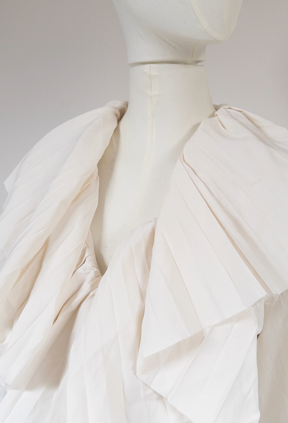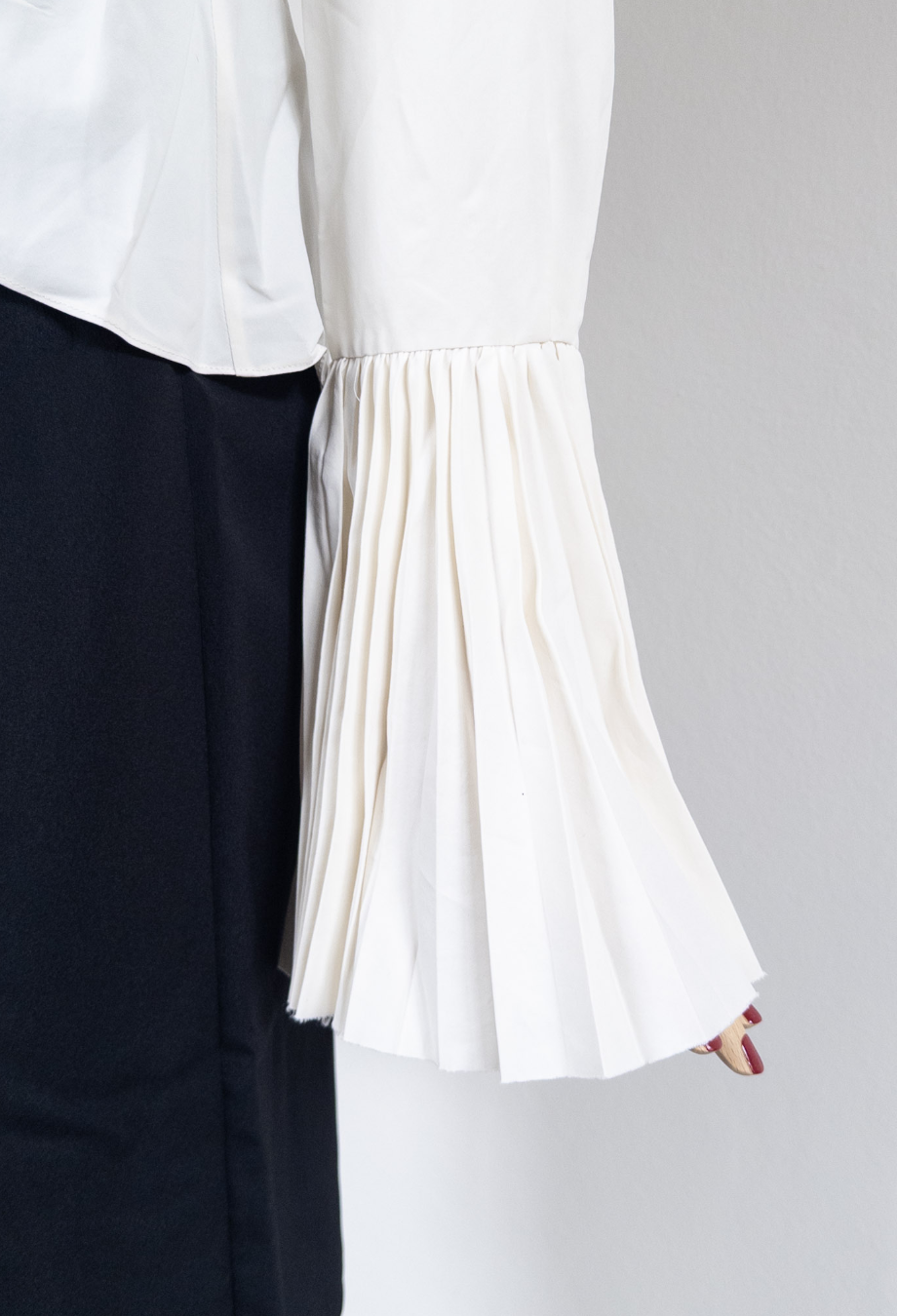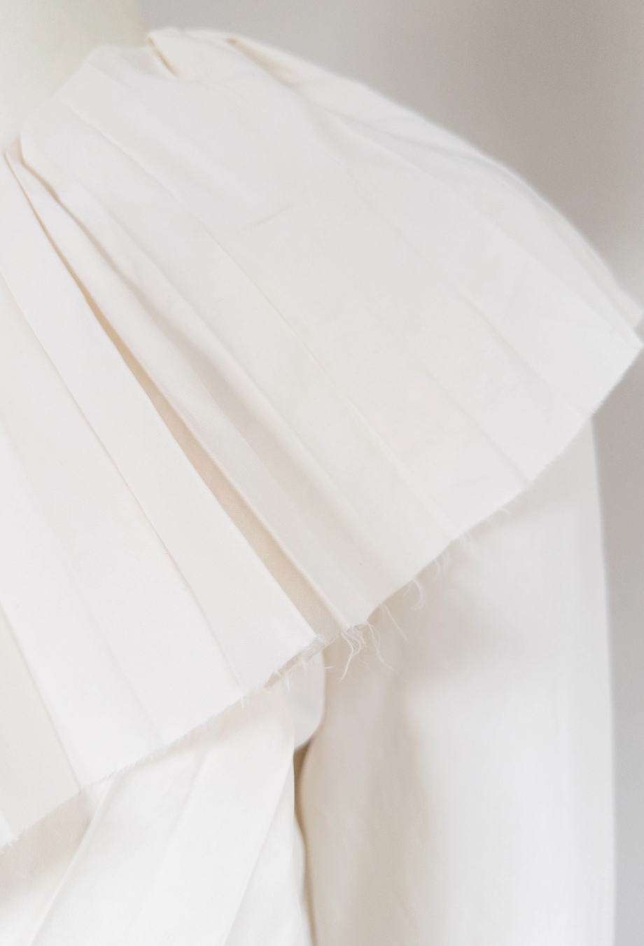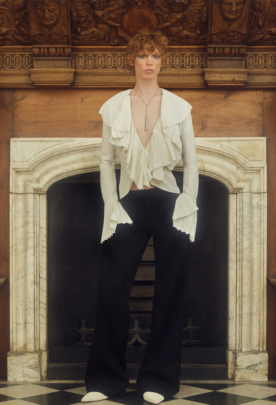 This absolutely stunning piece from Alexander McQueen Resort ’25 collection masterfully captures the house’s poetic tension between softness and structure. Crafted in Italy from an innovative blend of viscose and paper, it features an exaggerated open neckline framed by cascading, precisely pleated ruffles that sculpt the silhouette with theatrical volume. The same architectural pleating reappears at the elongated cuffs, flaring dramatically past the wrist. A piece that channels McQueen’s signature blend of Victorian drama and modern tailoring, it’s cut for a slightly fitted shape. Style it with high-waisted trousers or structured skirts to balance its sculptural proportions.