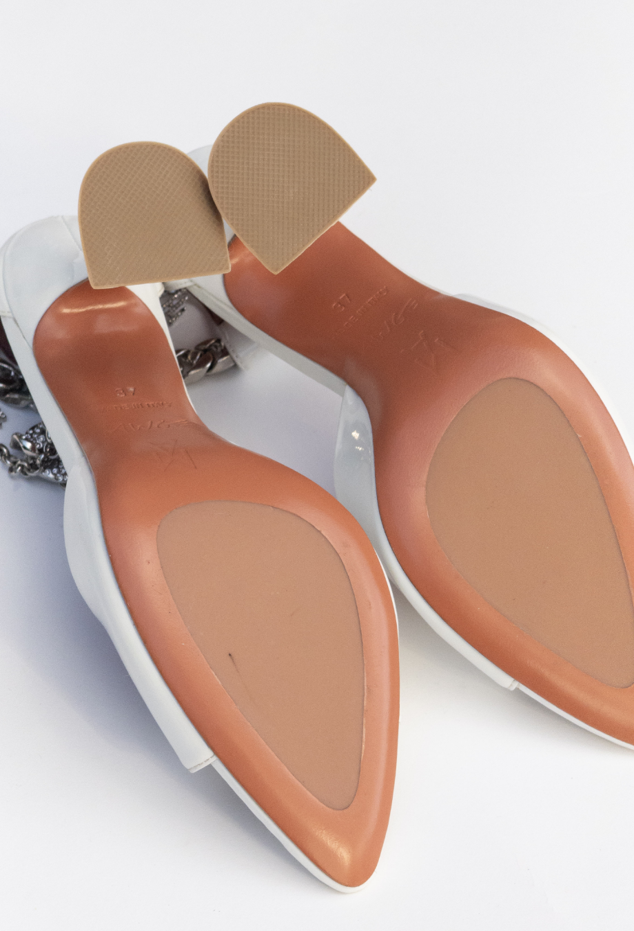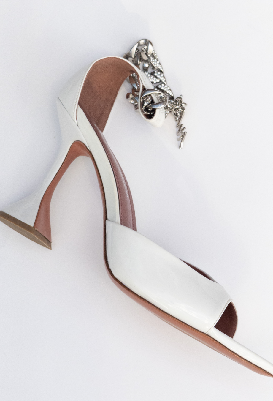 Amina Muaddi’s collaboration with AWGE and A$AP Rocky delivers a high-octane fusion of streetwear attitude and signature glamour. The Flacko heels in white patent leather are anchored by the designer’s iconic flared base and sharply pointed toe, brought into sharper focus with crystal-encrusted chain straps that slink across the foot and ankle. The pavé “AWGE” logo charm adds a bold finishing touch. Style them with anything from oversized tailoring to a micro-mini – these are heels designed to steal the spotlight.
