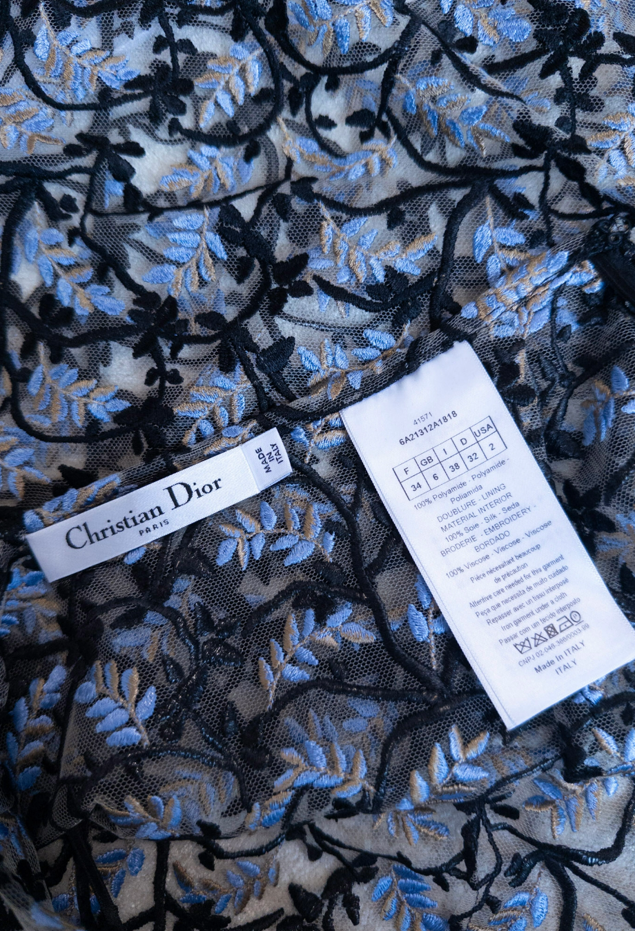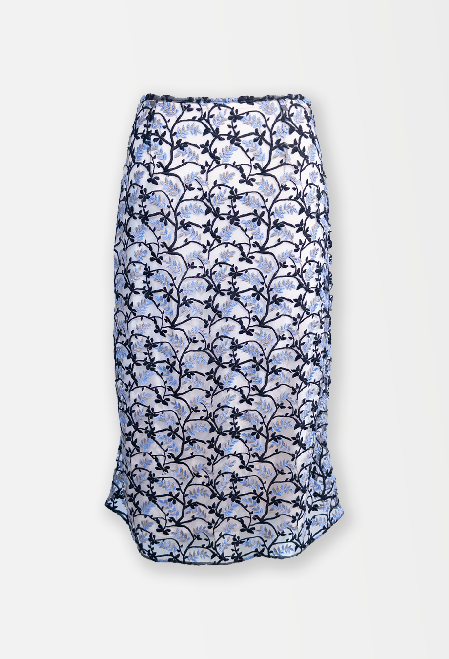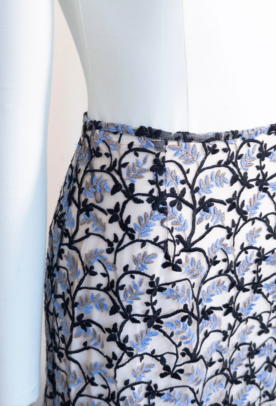 Crafted in Italy from delicate tulle fabric, this Christian Dior midi floral skirt is intricately stitched with soft blue and muted gold floral motifs that feel like a hand-painted porcelain. The silhouette is cut to a slightly a-line profile that grazes mid-calf, with a silk interior lining that tempers the sheerness while preserving the airy, ethereal effect. Style it with a tucked silk blouse or an oversized knit to strike the perfect balance between elegance and ease.