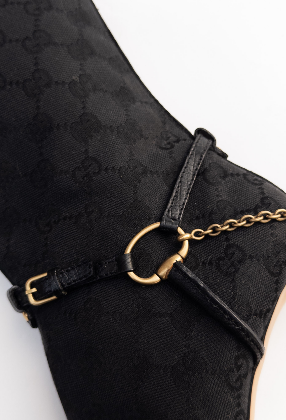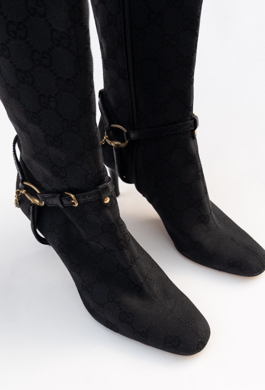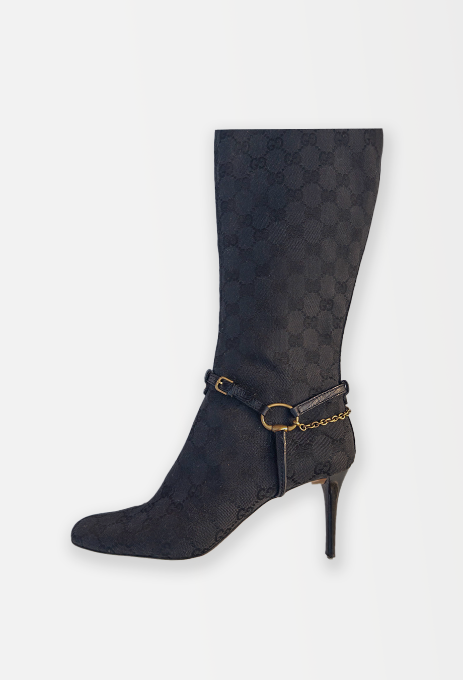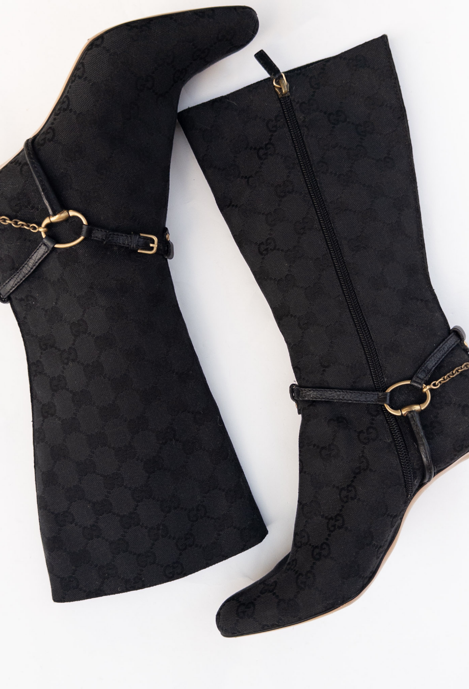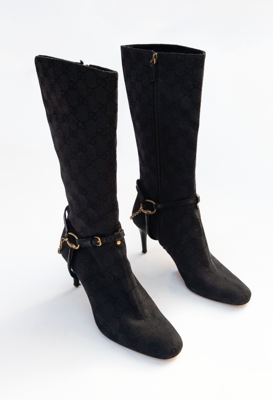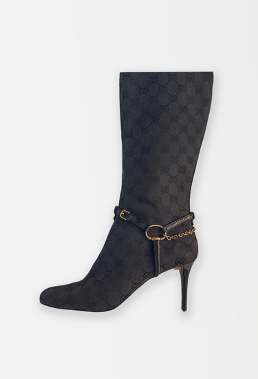 A special piece from Tom Ford’s era at Gucci, these knee-high boots capture the glamour that defined the late '90s and early 2000s. Crafted in Italy from signature GG monogram canvas, the silhouette is sharply contoured with an elongated almond toe and slim stiletto heel—hallmarks of Ford’s razor-sharp aesthetic. The boots are detailed with leather harness straps, anchored by gold-tone horse bit hardware and fine chain links that wrap elegantly around the ankle. Pair with a tailored mini or under long coats for a signature Tom Ford look.