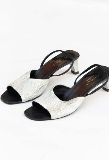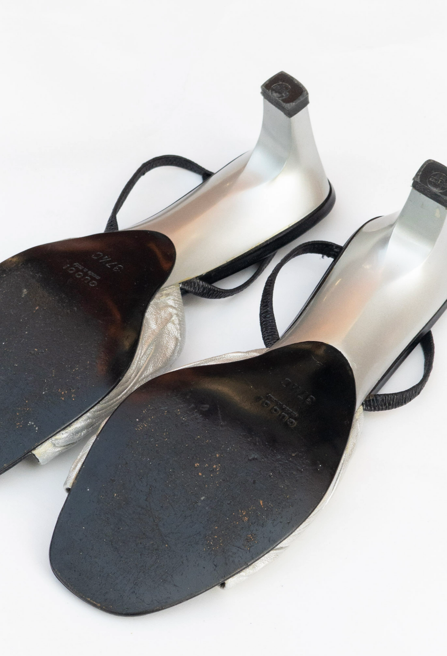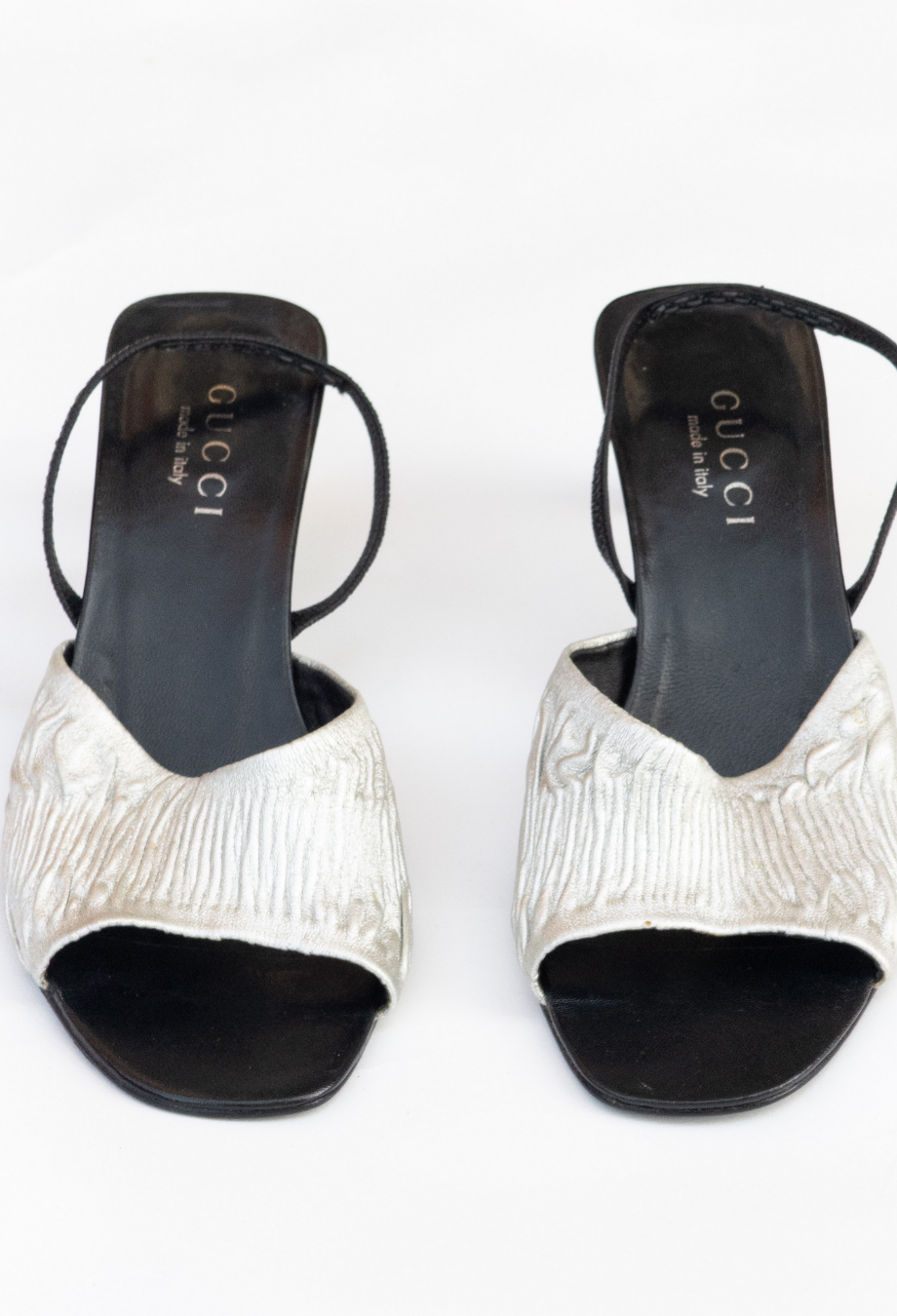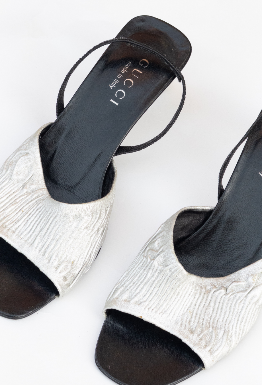Gucci Vintage Slingback Silver Mules - capture the quiet glamour of early 2000s Italian design with a futuristic edge. Made in Italy, they feature softly ruched silver leather that shimmers with a molten finish, contrasted by sleek black leather soles and slender elasticated slingback straps. The architectural heel is shaped with a modern sculptural curve, adding a subtle lift without compromising comfort. Set on a sharply squared toe, this pair offers an effortless fusion of evening polish and off-duty cool. Wear them with minimalist tailoring or bias-cut silk for a directional take on vintage sophistication.