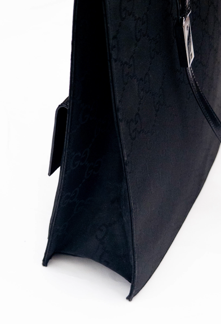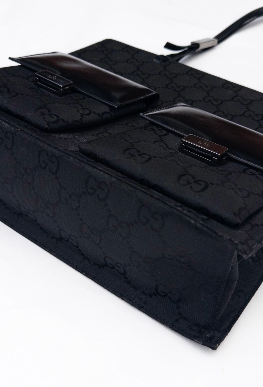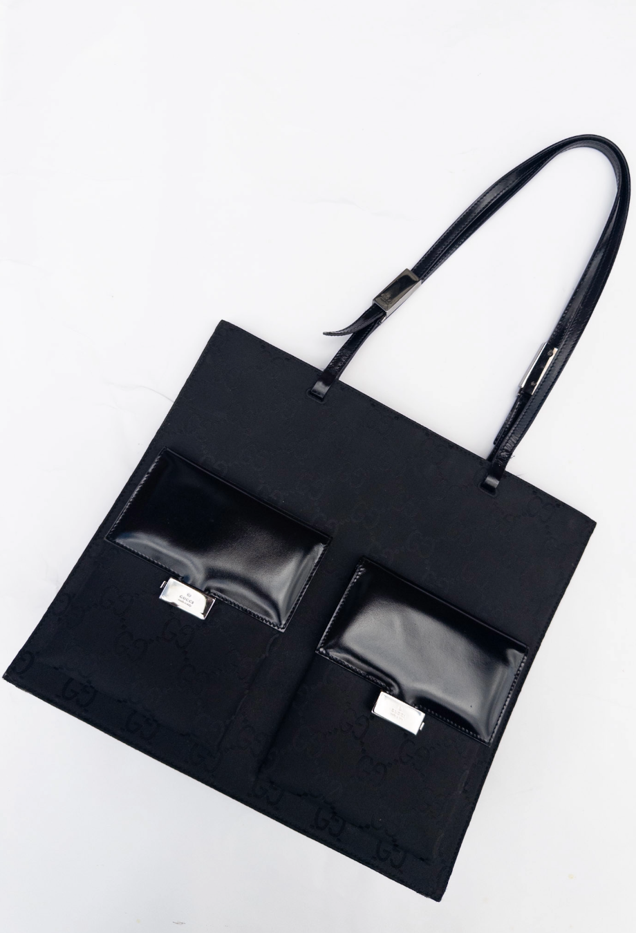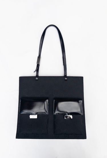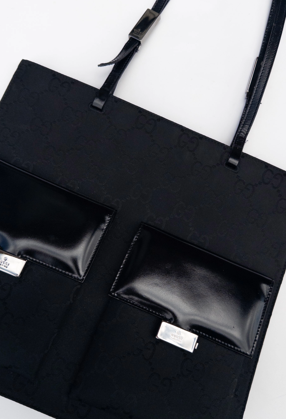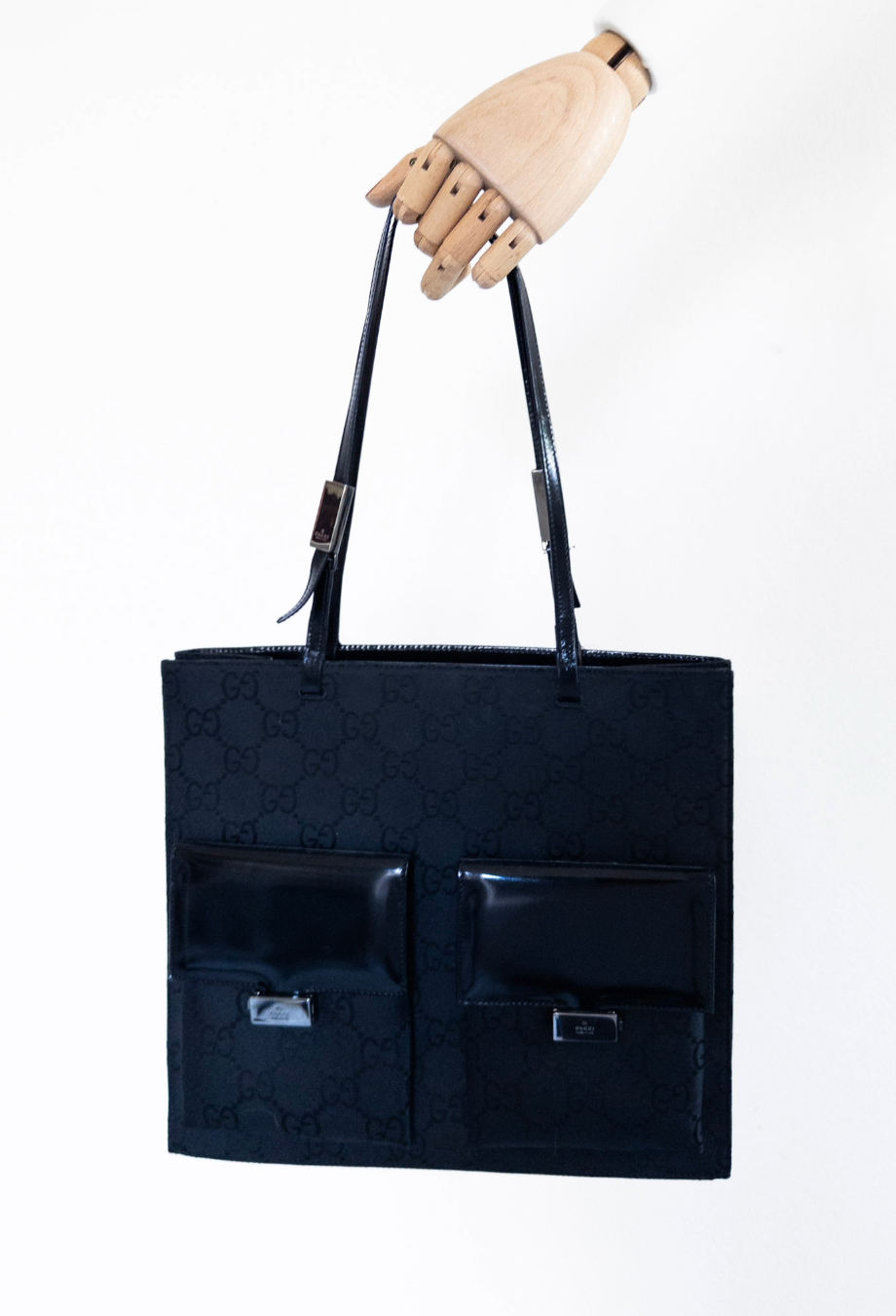 From Tom Ford’s iconic era at Gucci, this GG monogram bag is a beautiful wardrobe staple. Crafted in Italy from jacquard canvas subtly woven with the house’s signature motif, it’s accented with glossy patent leather front pockets and silver-tone logo clasps that. The structured square silhouette and elongated leather straps make it as functional as it is striking.