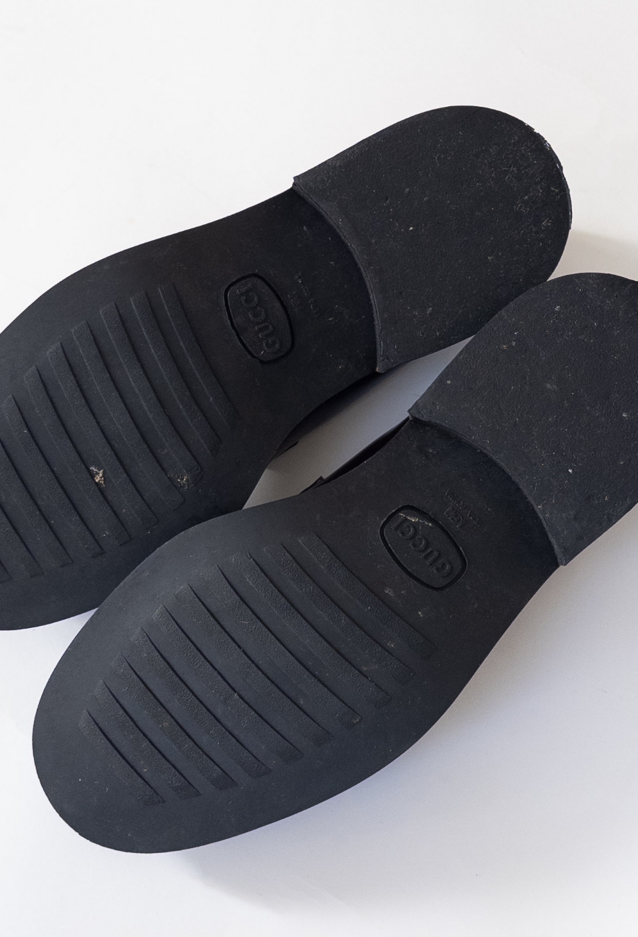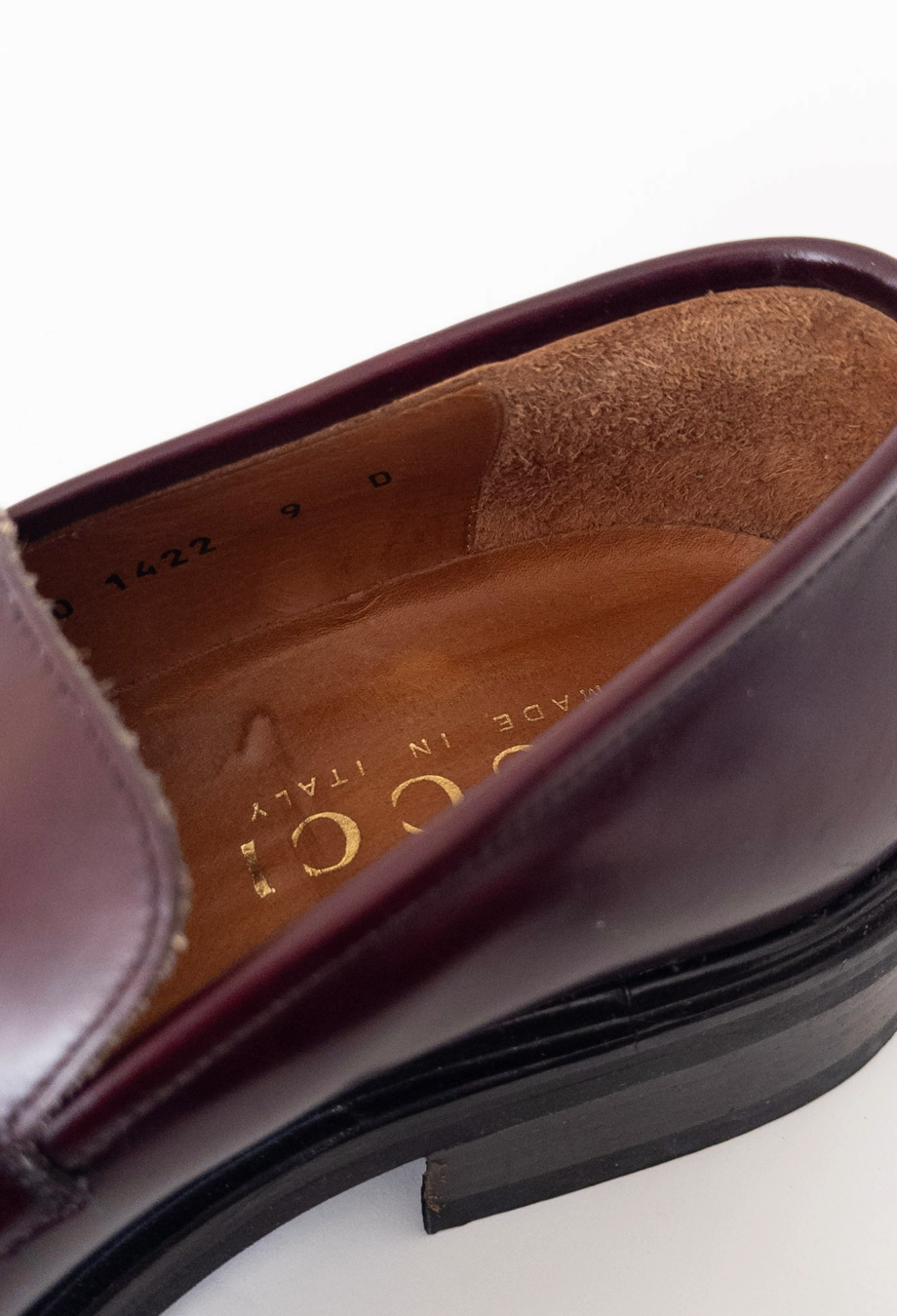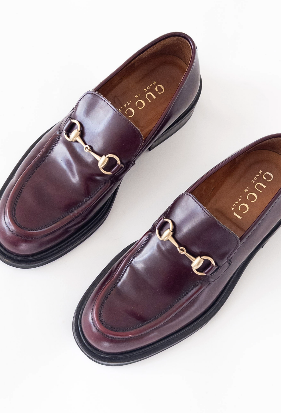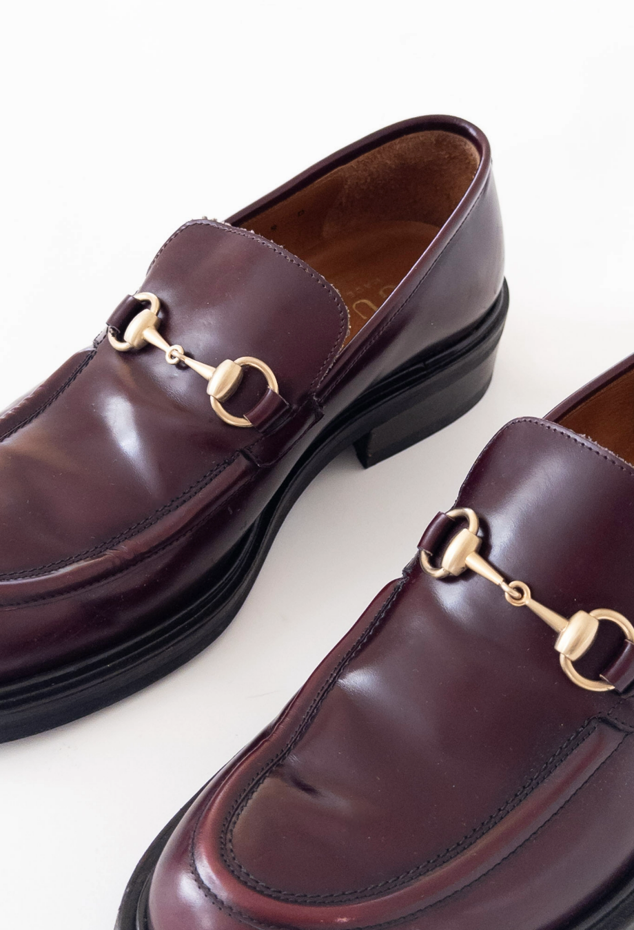 Gucci x Tom Ford in the 1990s and early 2000s, these men’s loafers reinterpret the house’s heritage codes. Crafted in Italy from high-shine burgundy leather, the silhouette is anchored by an exaggerated stacked sole that enhances their sculptural weight and presence. The iconic horse bit hardware in polished gold-tone metal adds a nod to equestrian tradition. Wear them with cuffed trousers or wide-leg tailoring for a look that channels Ford-era confidence.