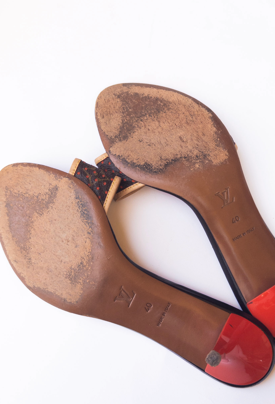 Louis Vuitton’s vintage buckle mules are what shoe lover dreams are made of. Crafted in Italy, the design features slender leather soles in rich cognac orange and a mid kitten heel. The front strap is rendered in the LV's signature monogram canvas, accented with contrasting beige trim and a polished gold buckle, a detail that nods to Louis Vuitton’s heritage in fine craftsmanship and equestrian-inspired hardware. Chic and versatile, these mules are perfect for pairing with tailored trousers or a silk midi skirt.