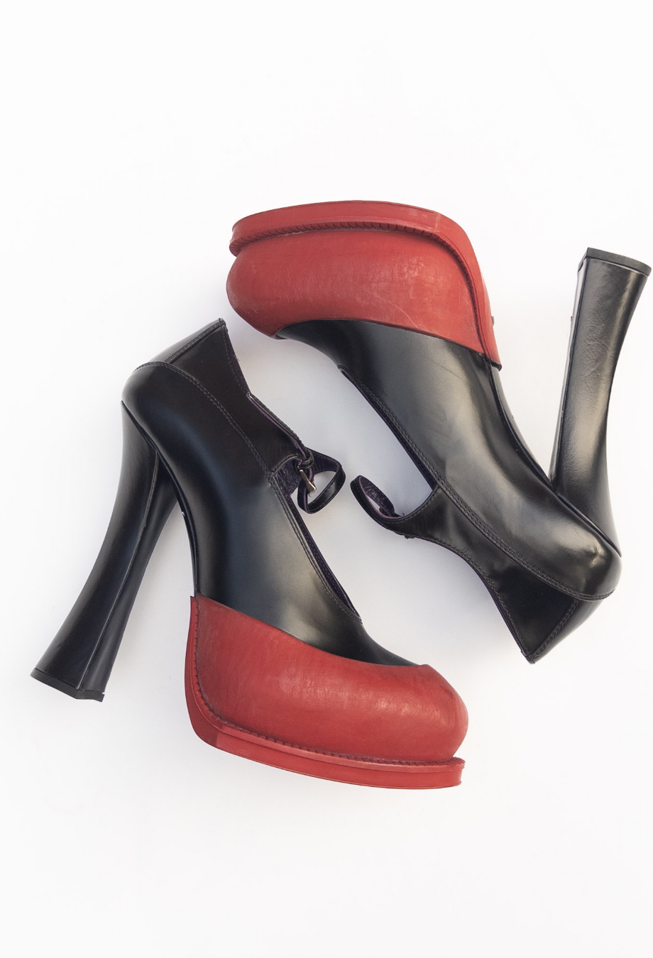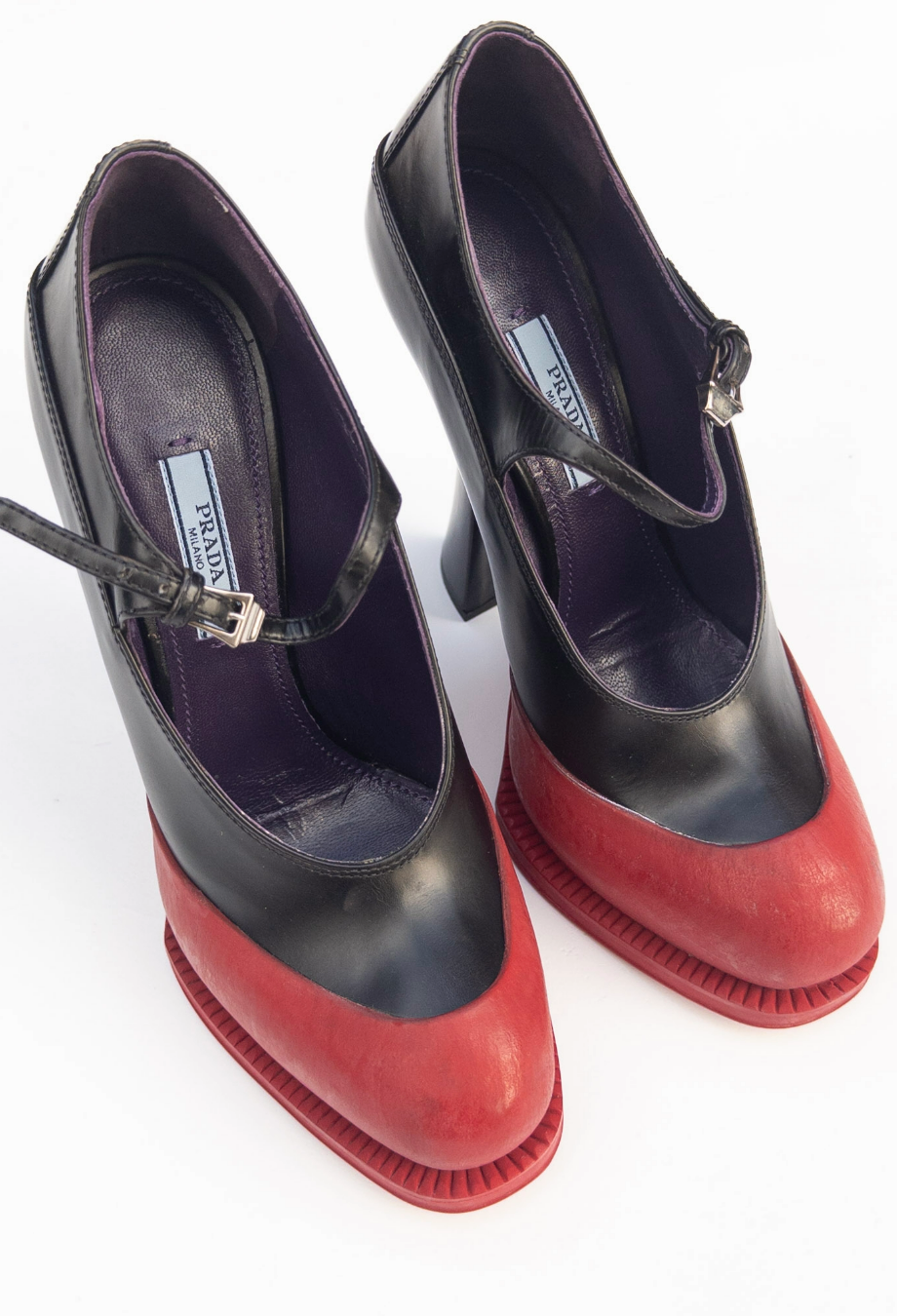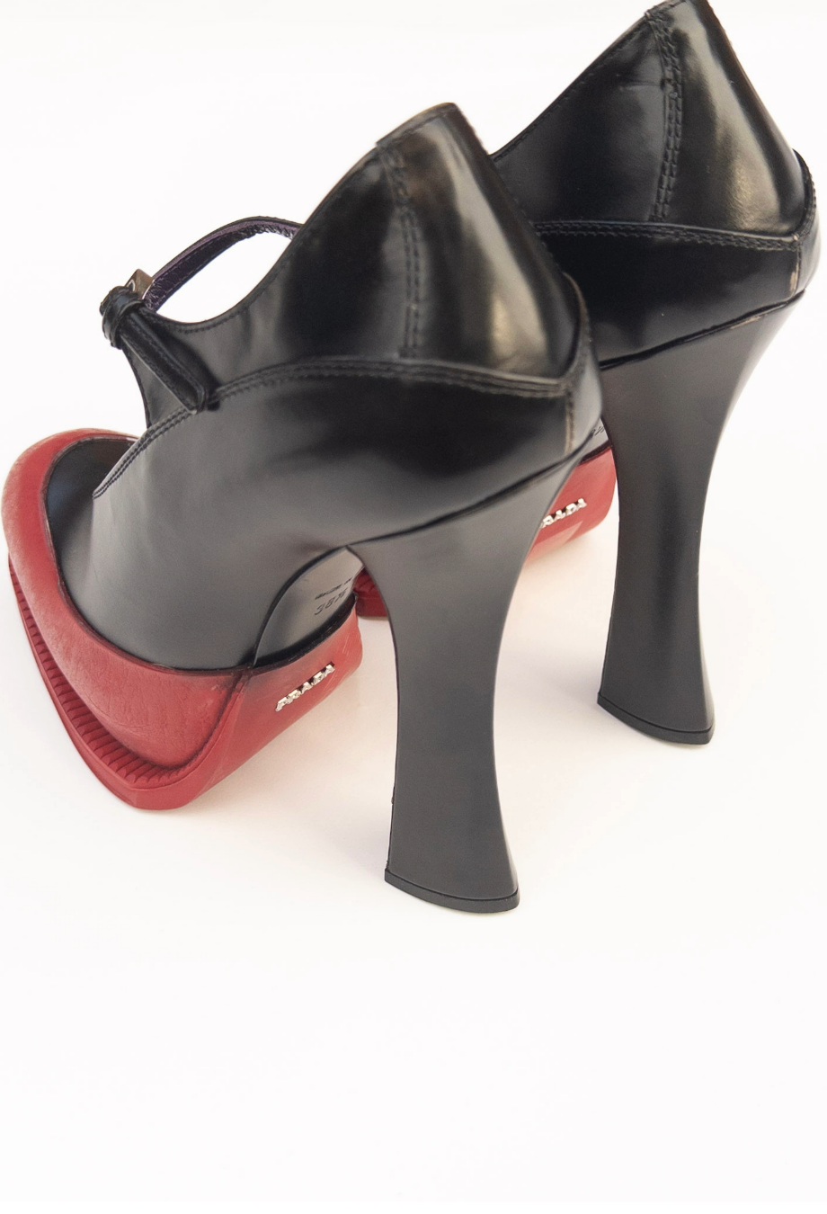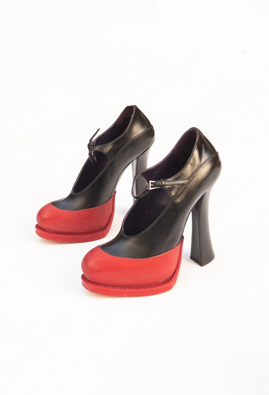 Prada’s Fall/Winter 2012 collection offered a surrealist reimagining of retro classics, and these runway Mary Janes remain one of its most iconic silhouettes. Expertly crafted in Italy from polished black leather, they feature a dramatic two-tone construction with sculptural red dipped-effect rubber uppers that curve upward. The flared heels, a recurring shape in Miuccia Prada’s early 2010s collections, lend exaggerated height and an architectural edge, while the delicate ankle strap maintains the charm of a vintage Mary Jane. As seen on the runway, they’re best paired with sharply tailored minis or bold prints for a playful statement.