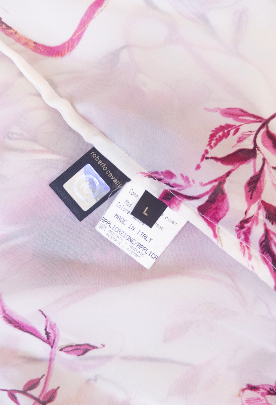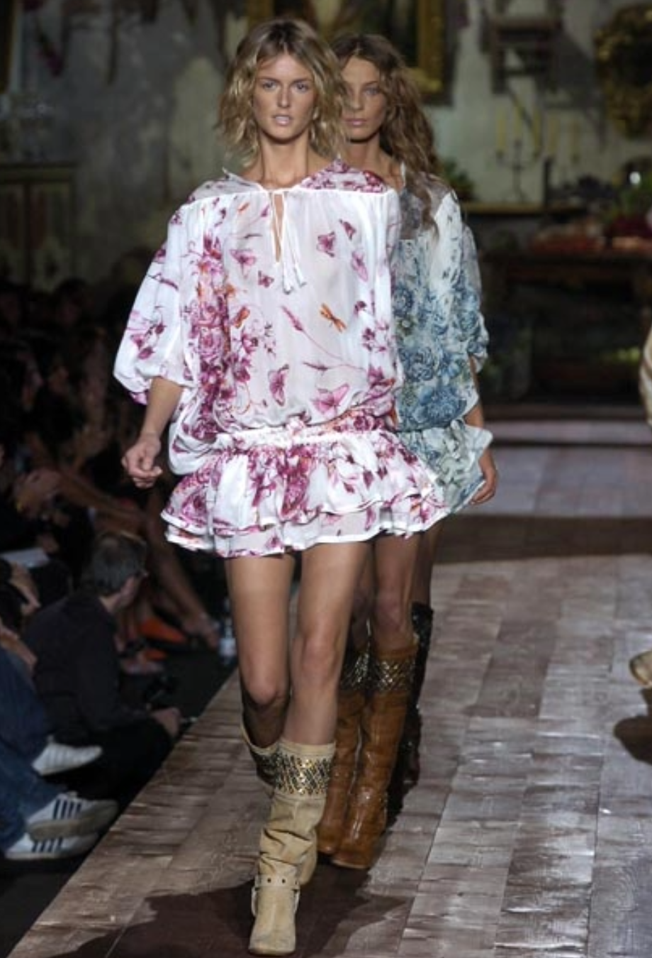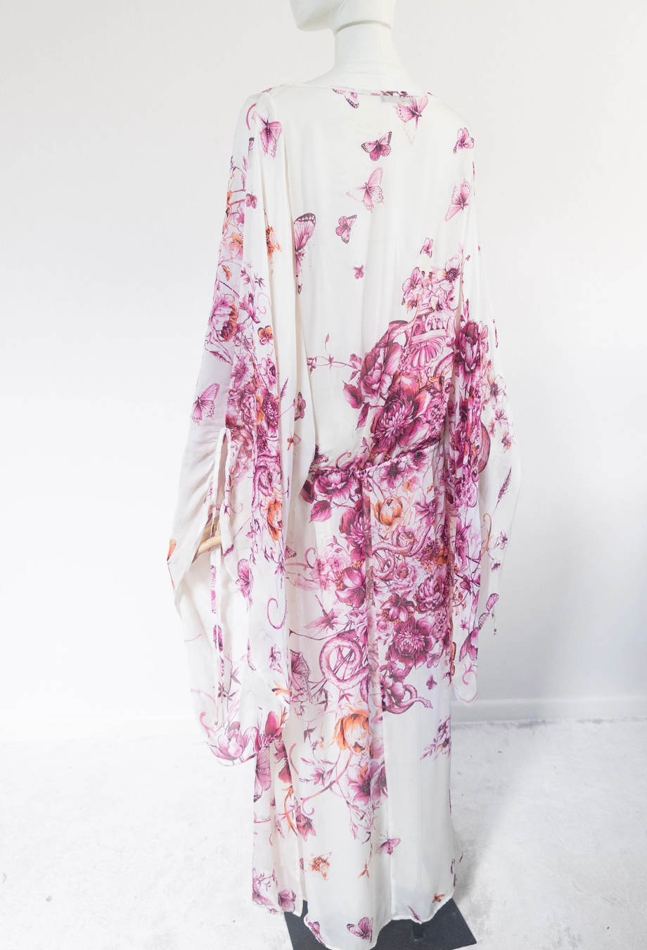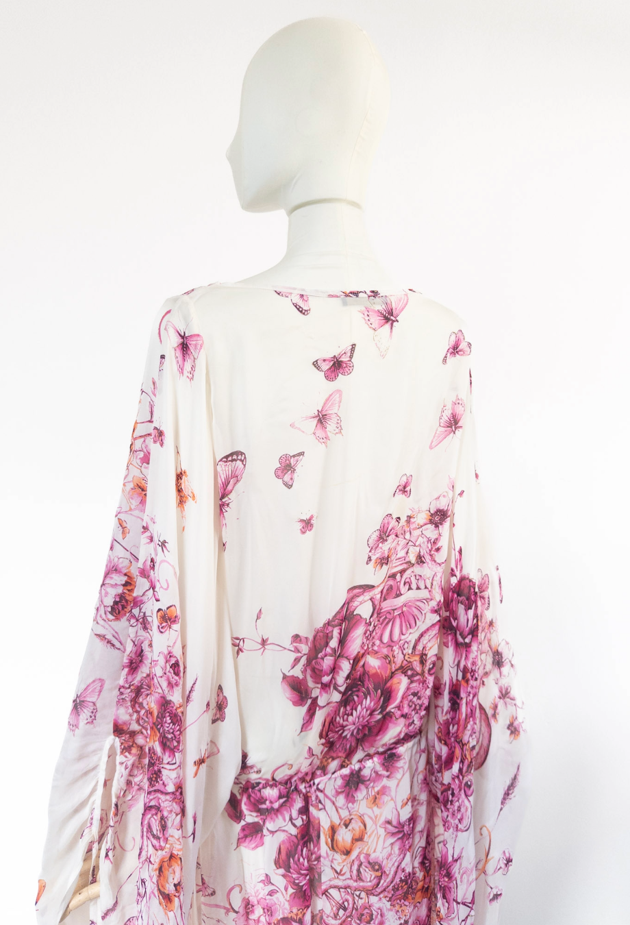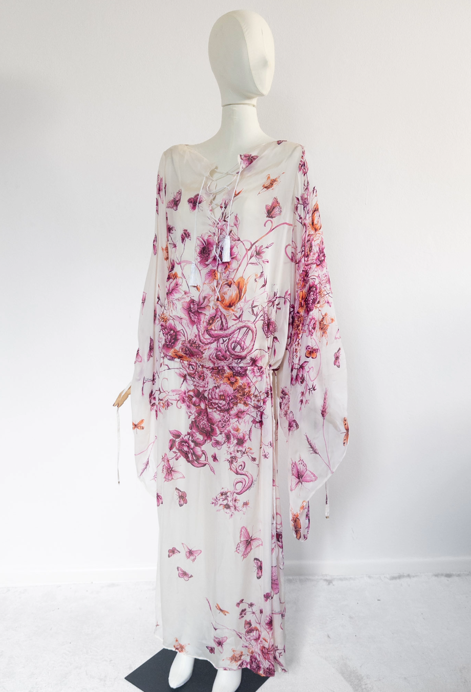 From Roberto Cavalli’s ethereal Spring/Summer 2005 collection, this butterfly dress captures the house’s romantic, bohemian glamour at its peak. Cut from whisper-light silk, it drapes fluidly over the body, featuring a vivid butterfly and floral print rendered in shades of fuchsia, rose, and soft orange. It was one of the season’s signature motifs with a mini version of this dress presented on the runway. The billowing sleeves, finished with delicate ties, add dramatic volume. This rare archival piece makes a striking statement for resort escapes, warm-weather events, or collectors of iconic runway designs.