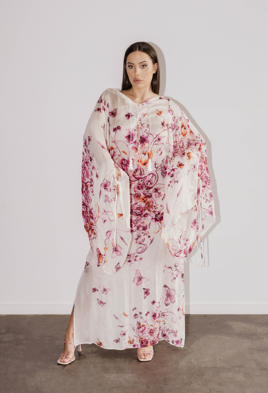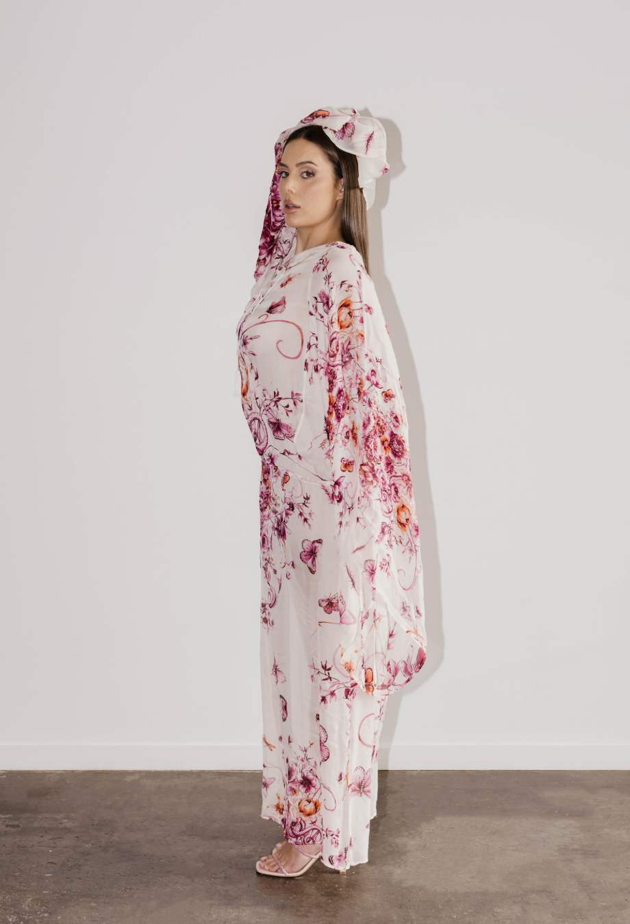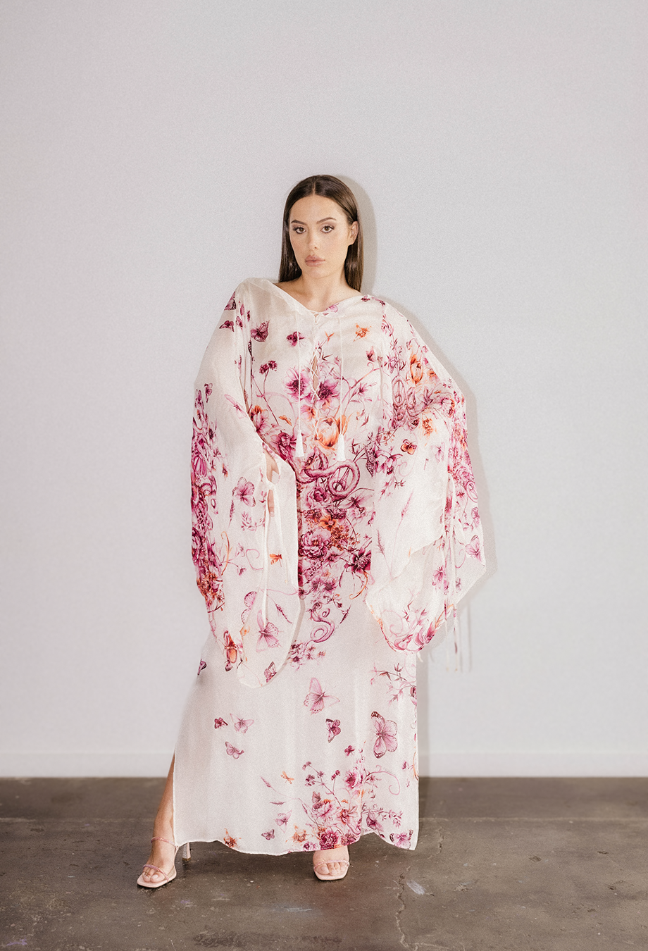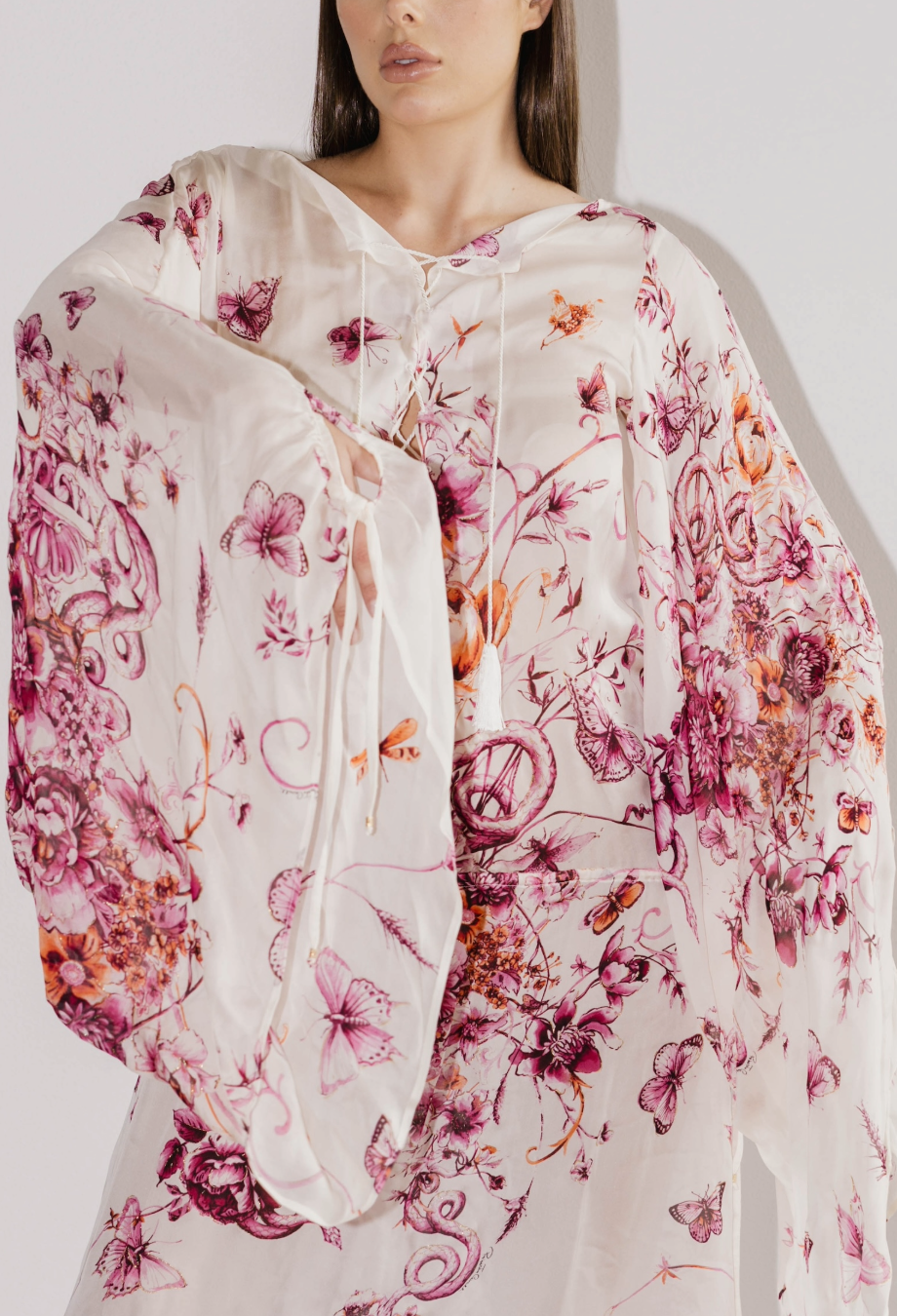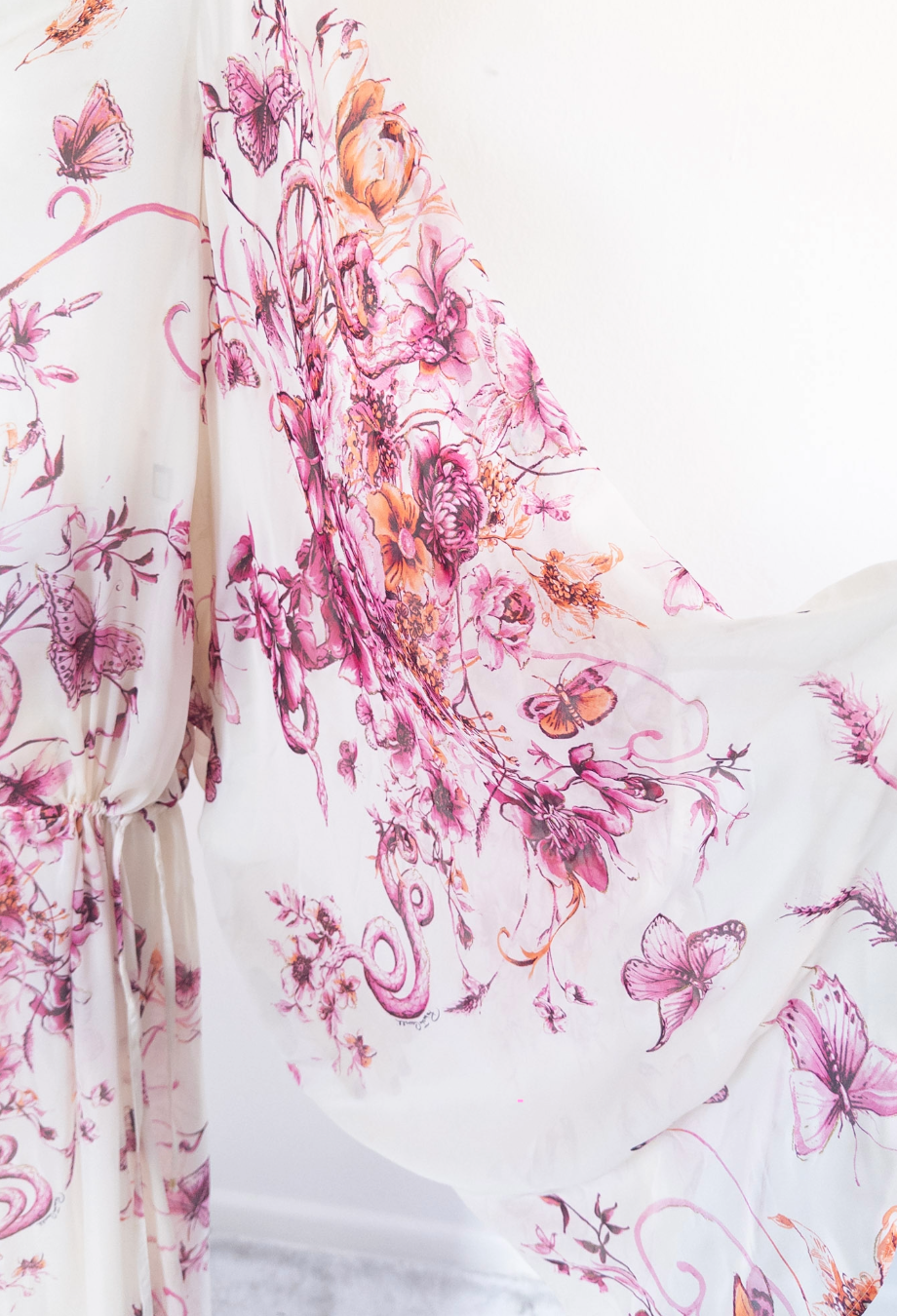 From Roberto Cavalli’s ethereal Spring/Summer 2005 collection, this butterfly dress captures the house’s romantic, bohemian glamour at its peak. Cut from whisper-light silk, it drapes fluidly over the body, featuring a vivid butterfly and floral print rendered in shades of fuchsia, rose, and soft orange. It was one of the season’s signature motifs with a mini version of this dress presented on the runway. The billowing sleeves, finished with delicate ties, add dramatic volume. This rare archival piece makes a striking statement for resort escapes, warm-weather events, or collectors of iconic runway designs.