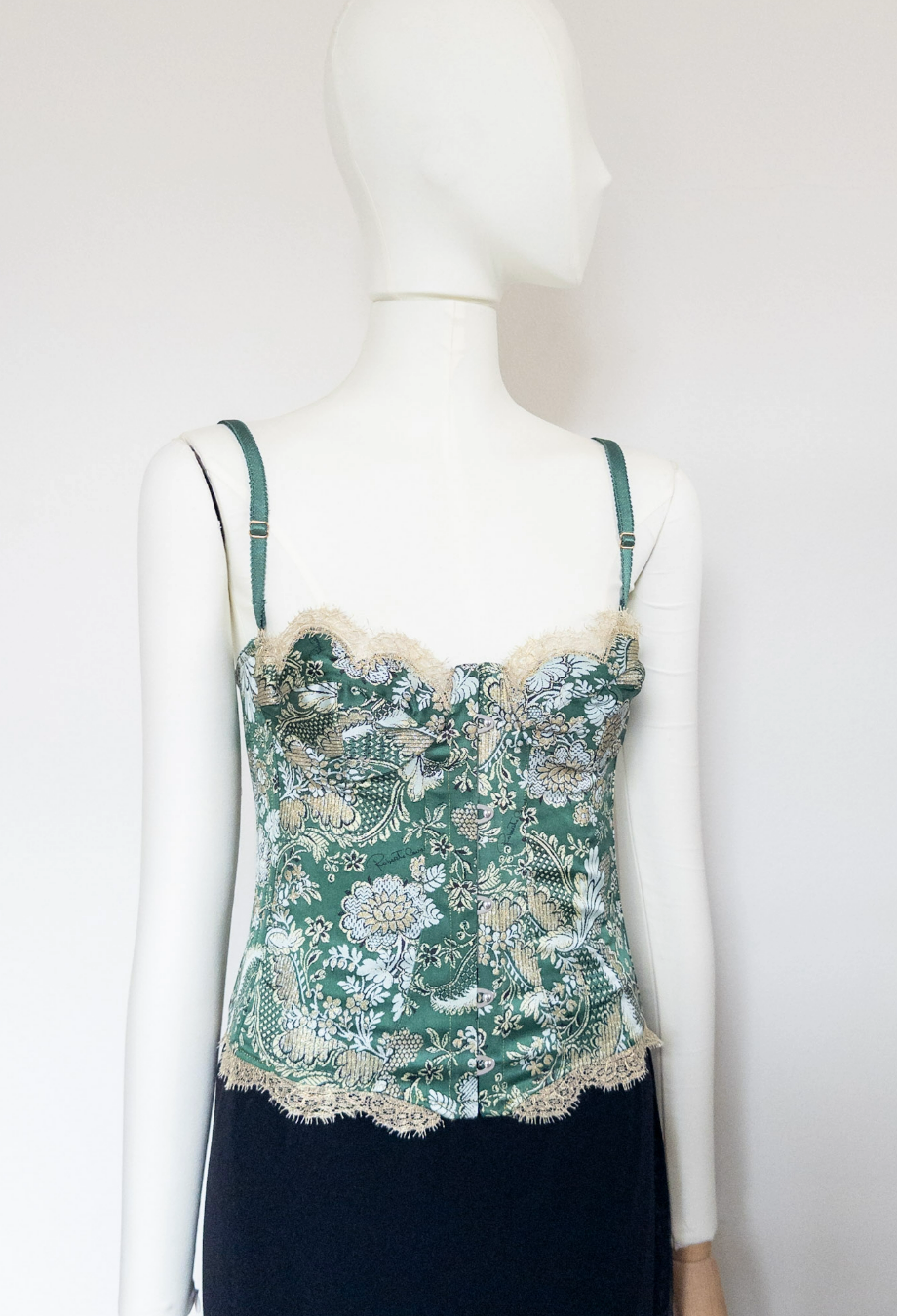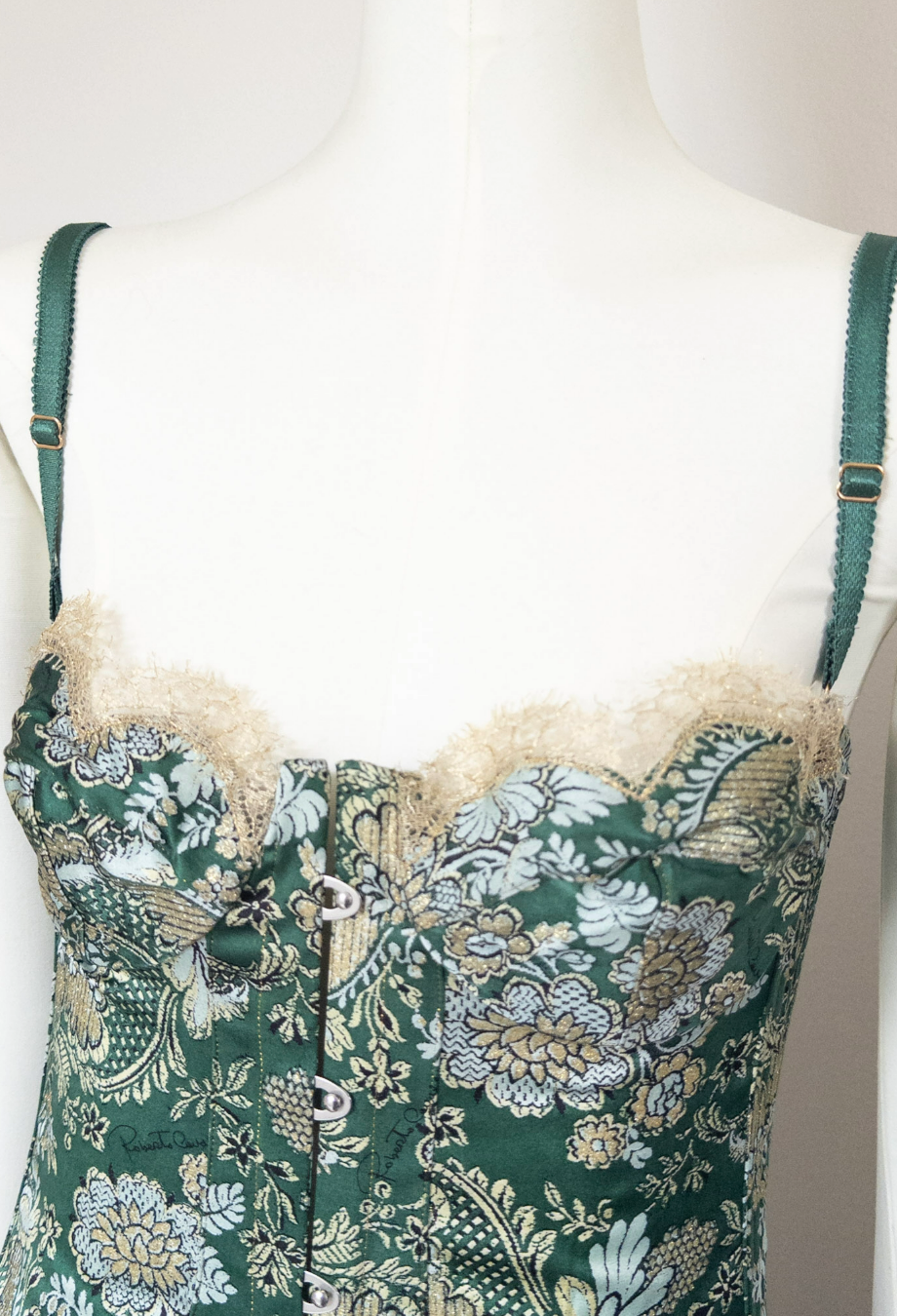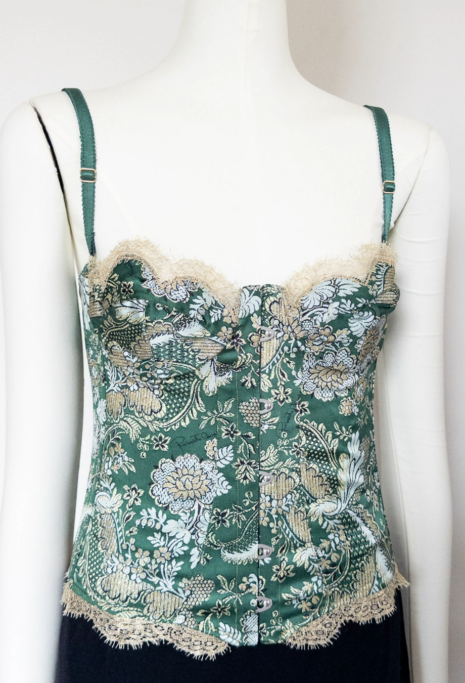 Roberto Cavalli Underwear FW 2001 Green Bustier — this Underwear line bustier channels the brand’s signature bold print with a lingerie-inspired edge. Cut from lustrous green jacquard with intricate floral motifs in gold and silver, it features a structured silhouette with lightly contoured cups and delicate lace trim along the neckline and hem. The back is finished with a dramatic gold rope lace-up, allowing for an adjustable, corset-like fit. Style it with a green maxi skirt for an iconic early 2000s Roberto Cavalli look.