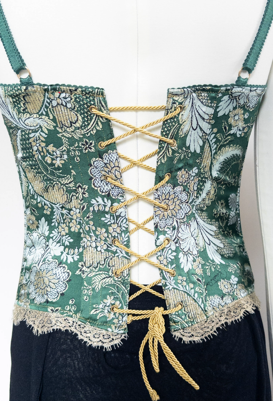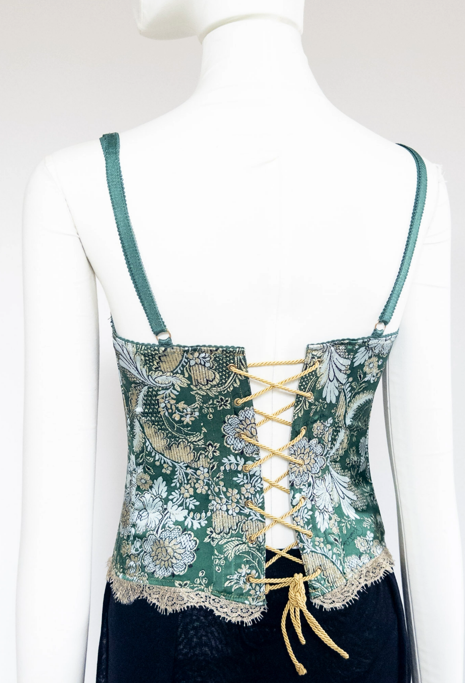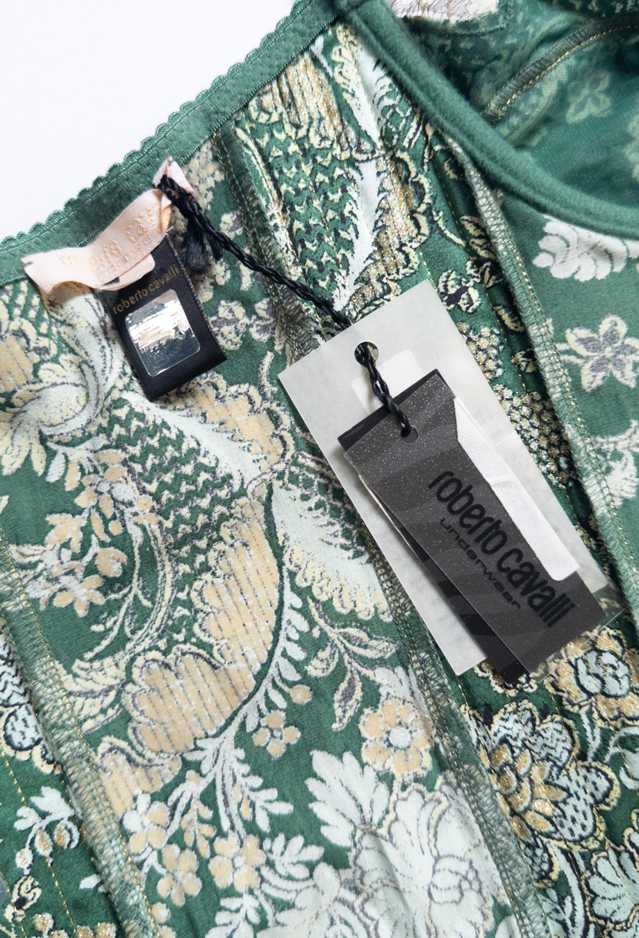 Roberto Cavalli Underwear FW 2001 Green Bustier — this Underwear line bustier channels the brand’s signature bold print with a lingerie-inspired edge. Cut from lustrous green jacquard with intricate floral motifs in gold and silver, it features a structured silhouette with lightly contoured cups and delicate lace trim along the neckline and hem. The back is finished with a dramatic gold rope lace-up, allowing for an adjustable, corset-like fit. Style it with a green maxi skirt for an iconic early 2000s Roberto Cavalli look.