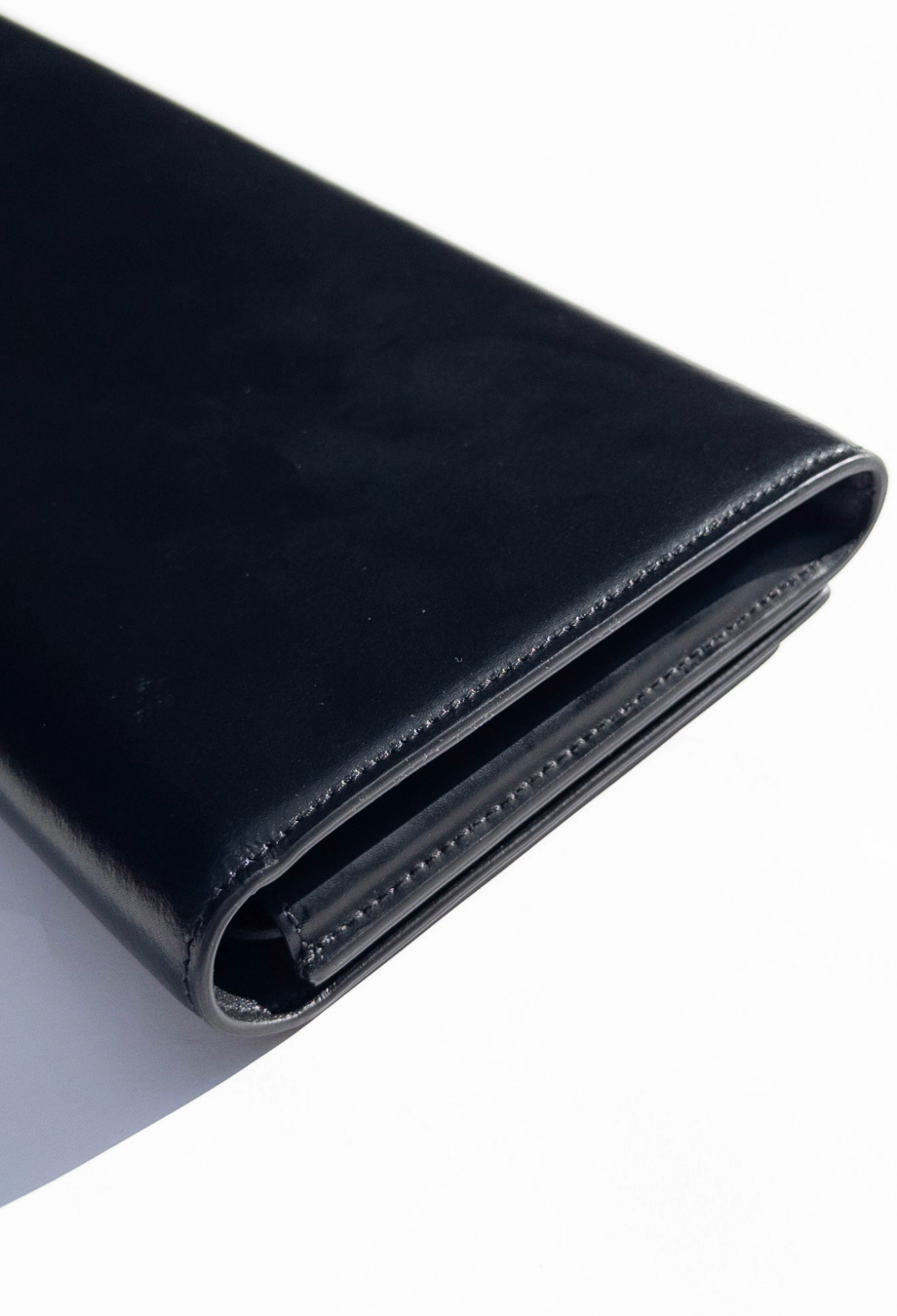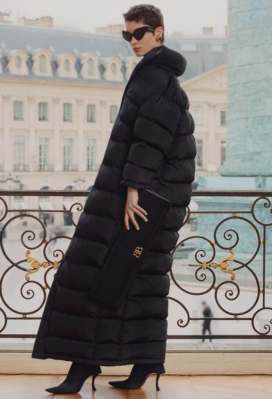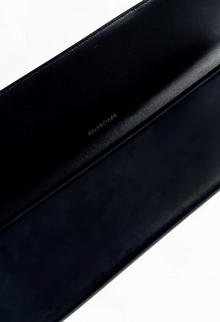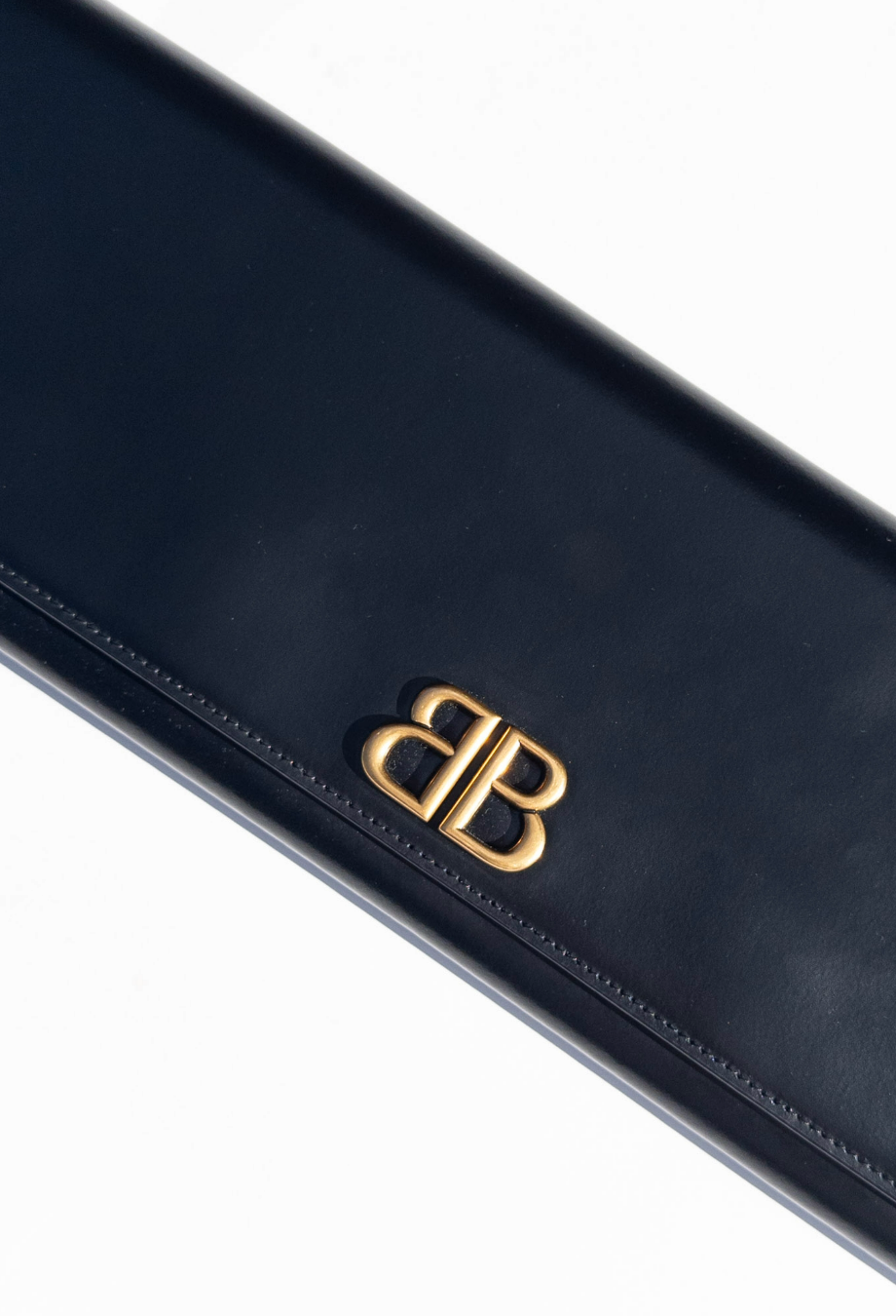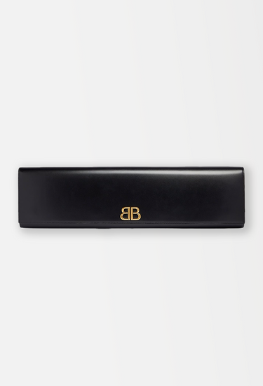 Balenciaga continues to reimagine proportions in its Spring/Summer 2024 accessories line-up—this jumbo clutch being the ultimate example. Crafted in Italy from smooth black leather, its ultra-elongated silhouette is at once minimalist and monumental, creating striking visual impact with a single, sculptural line. The front is adorned only with a polished antique-gold ‘BB’ monogram. Structured to maintain its exaggerated shape, the oversized envelope profile opens to reveal a discreet interior fitted with a zipped compartment and Balenciaga’s gold foil logo. Whether worn under the arm or styled as a handheld objet d’art, this piece speaks to Demna’s ability to balance irony, utility, and couture precision. Style it with everything from evening tailoring to oversized outerwear for a play on scale.