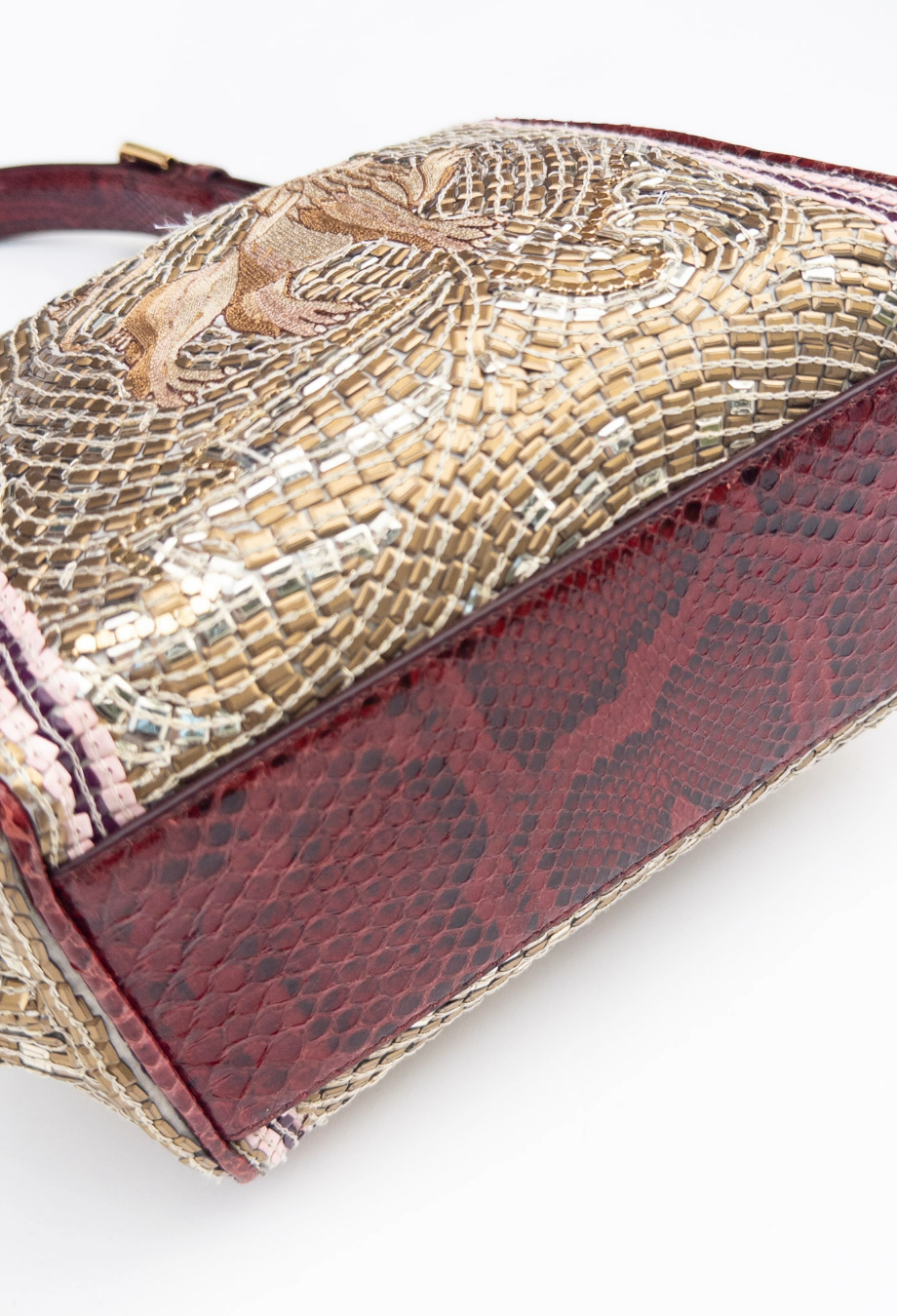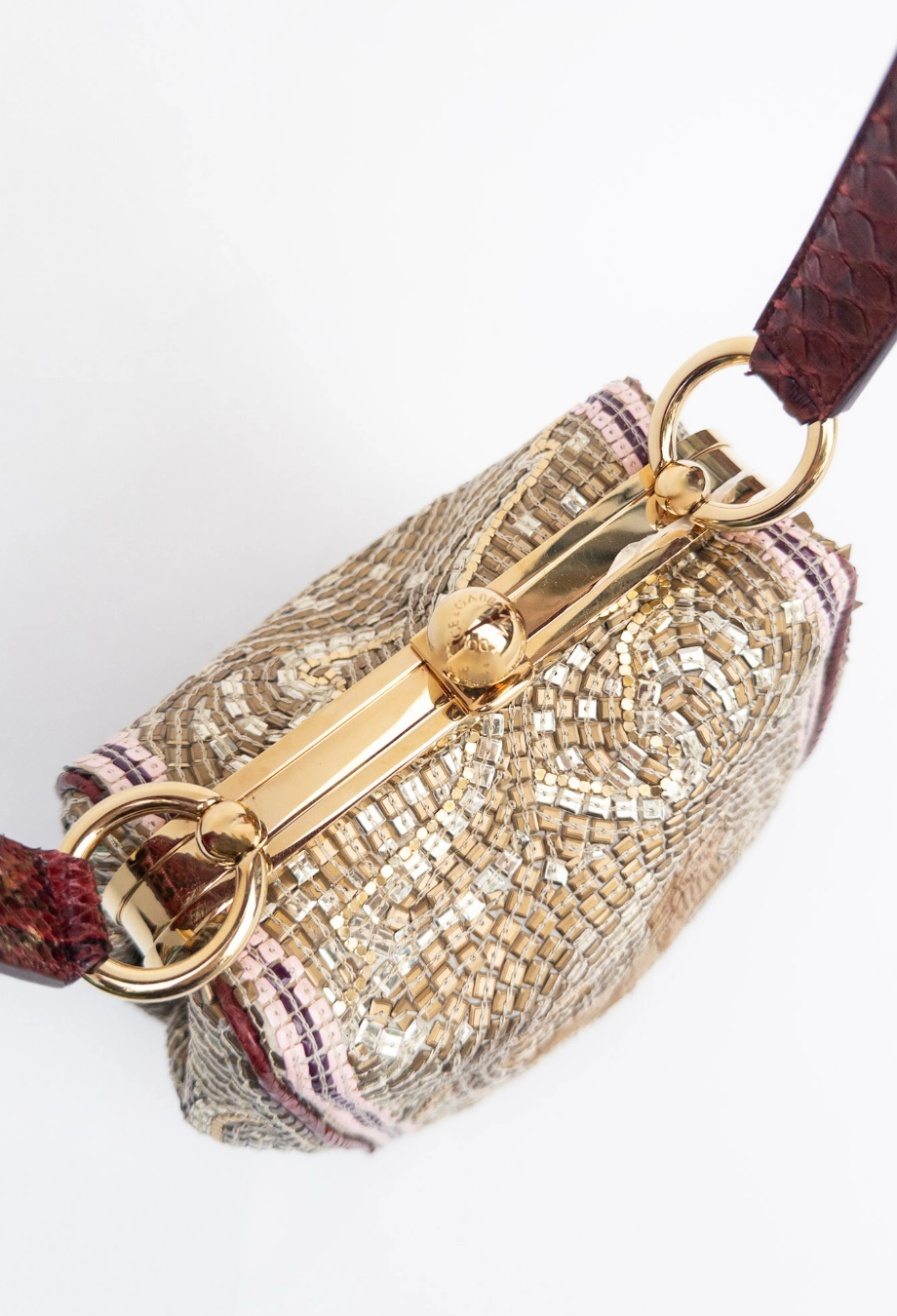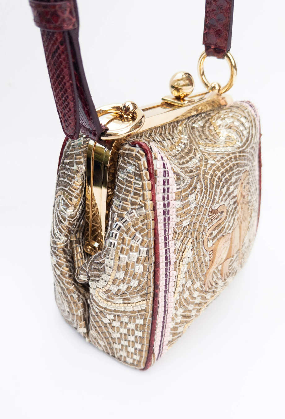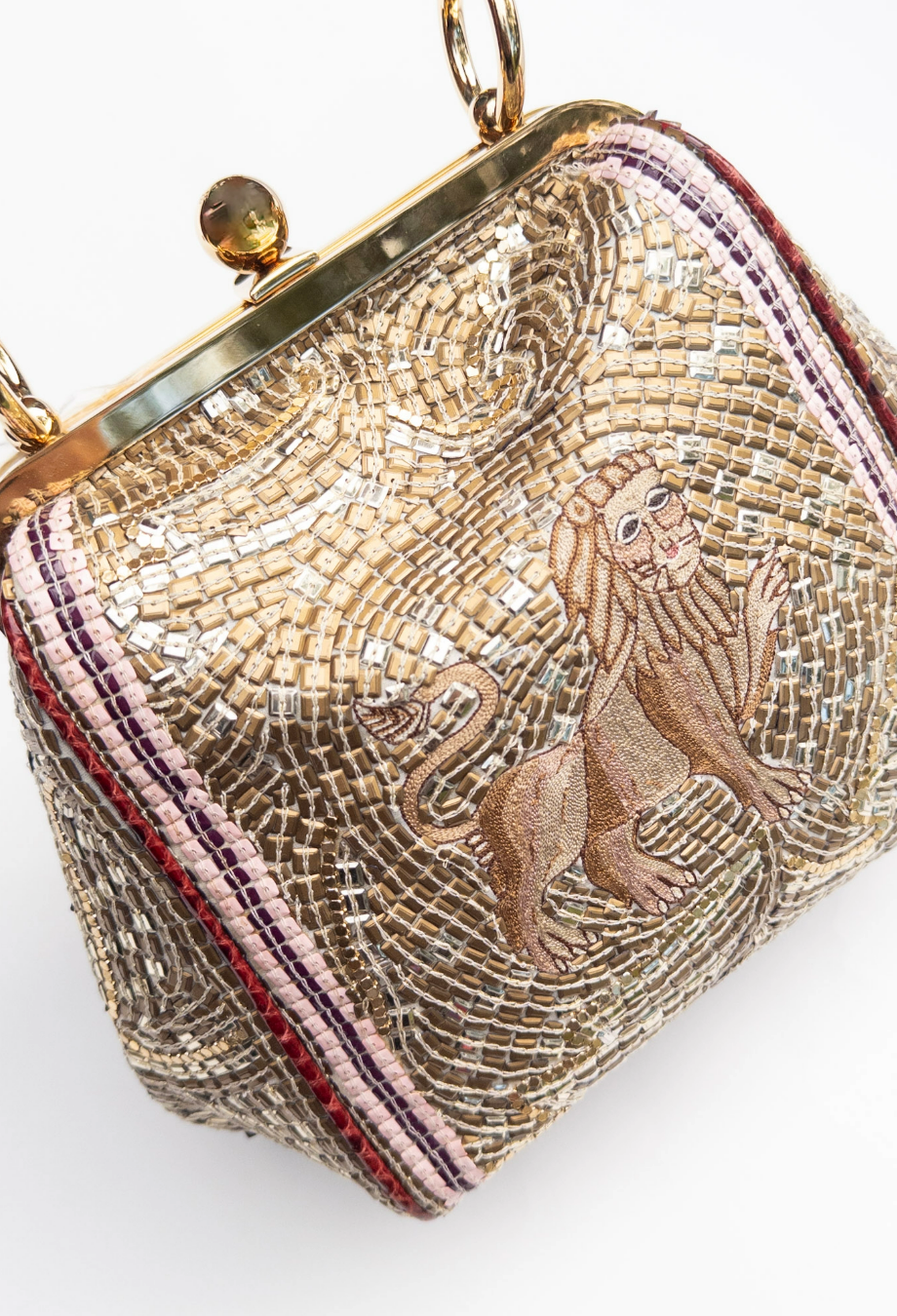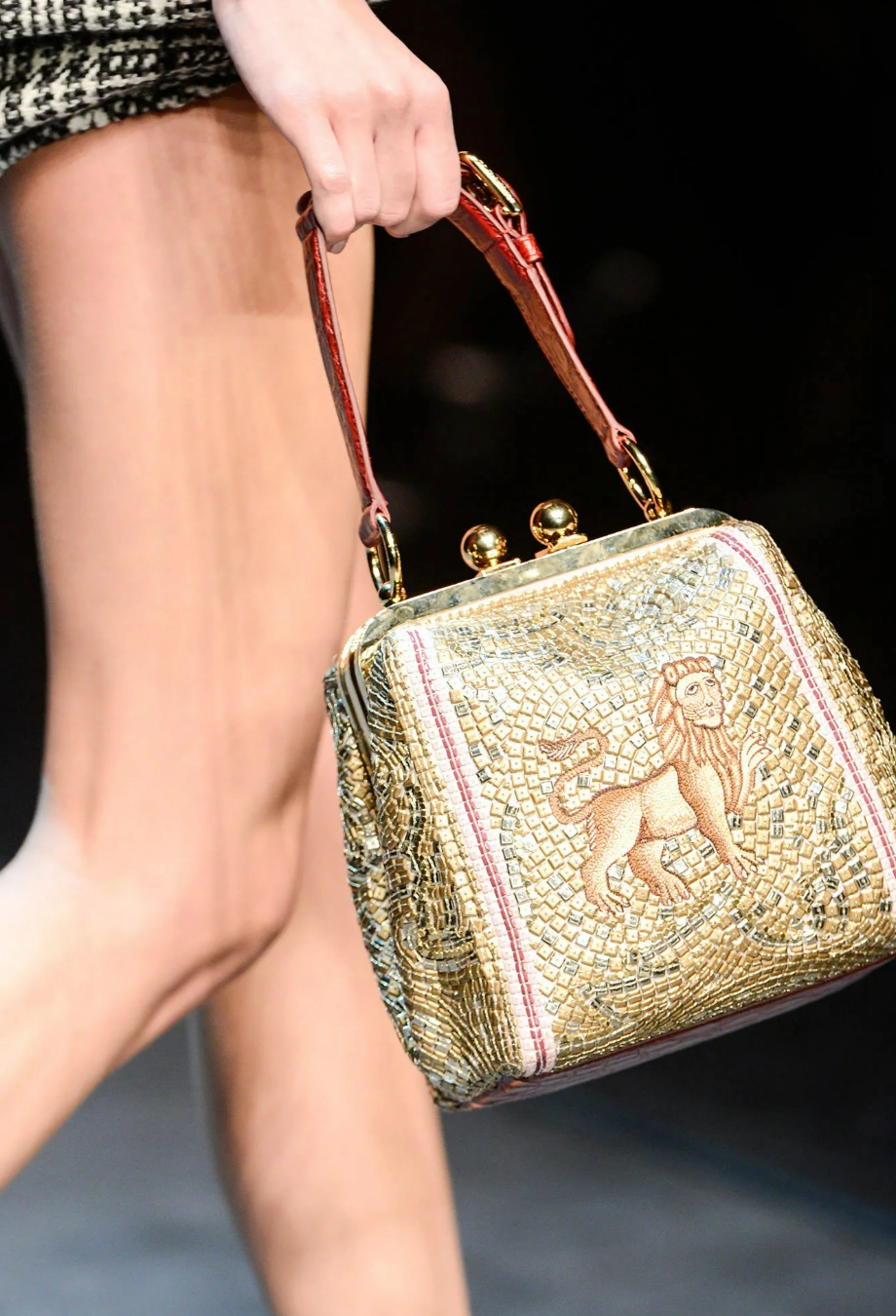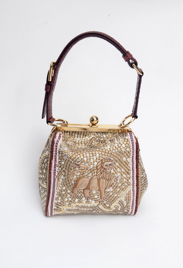 Dolce and Gabbana Runway Agata Embroidered Mosaic Lion Bag — debuted on the runway, this structured frame bag is meticulously embroidered to resemble a mosaic, with hand-applied beads and sequins forming a swirling gold backdrop. At its centre, an intricately stitched lion recalls ancient Sicilian artistry. Framed in polished gold-tone metal, the structured silhouette is finished with a vintage-inspired kiss-lock clasp and a burgundy top handle. Carry yours and pair with tailored separates to bring a touch of runway drama to daytime styling.