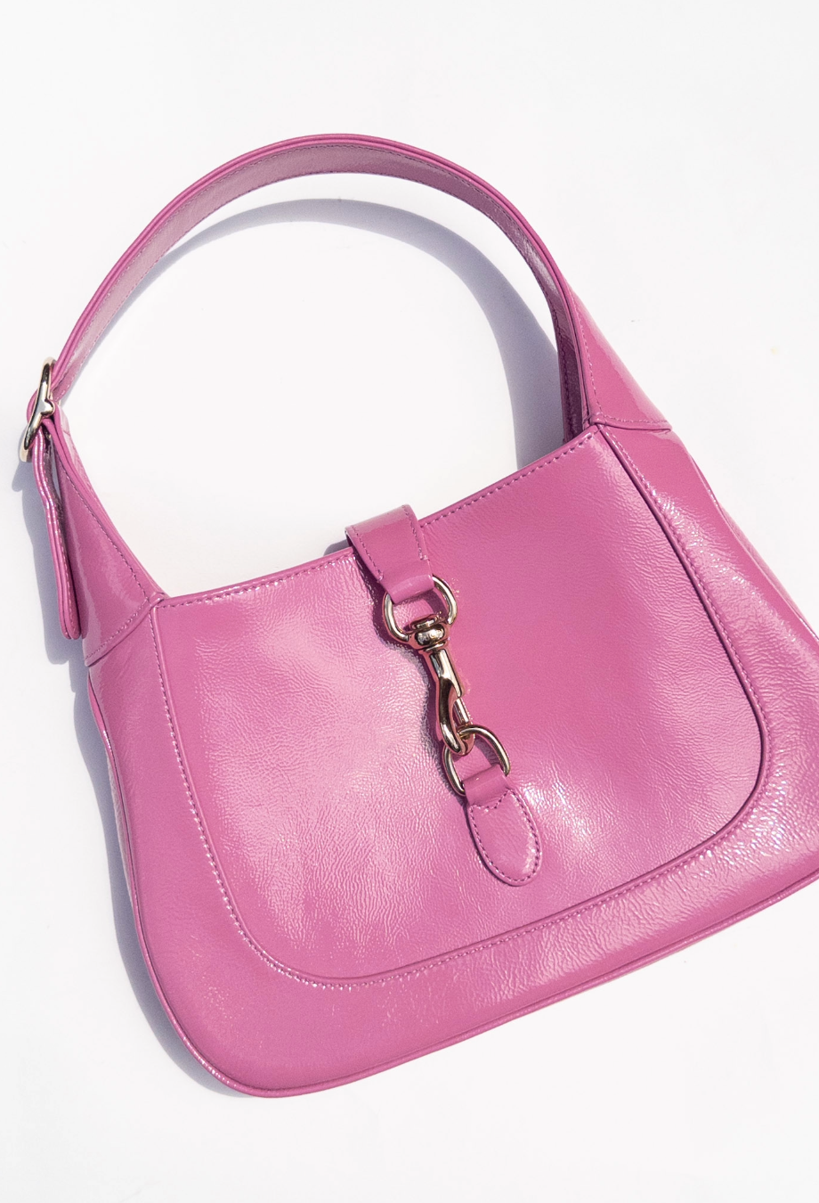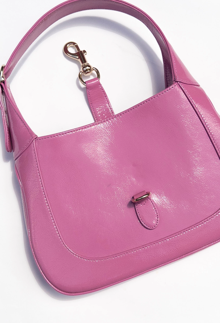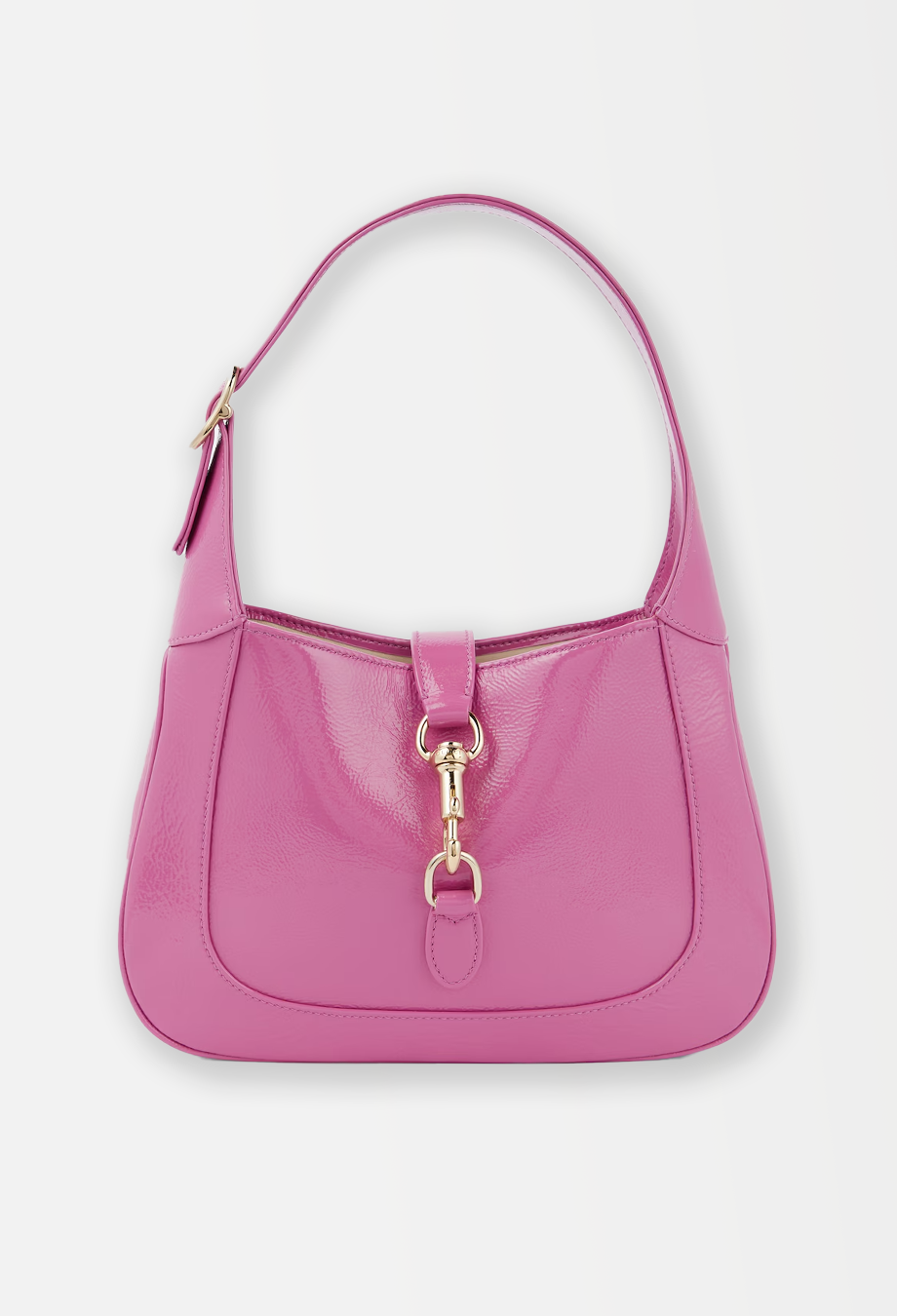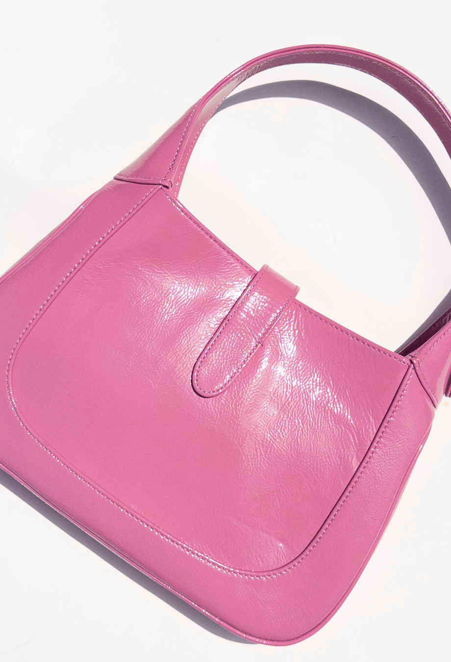 Gucci’s iconic Jackie bag is reimagined in a bold, playful mood with this glossy pink patent-leather edition. Its structured, softly curved silhouette highlights the house’s signature archival piston closure in polished gold-tone hardware. The high-shine patent finish gives the classic Jackie a contemporary edge, while the clean lines and minimal detailing ensure it remains effortlessly cool. Inside, the compact interior is perfectly sized for daily essentials, making it an ideal piece for both day and evening. Style it with denim or tailoring to bring a vibrant pop of colour to any look.