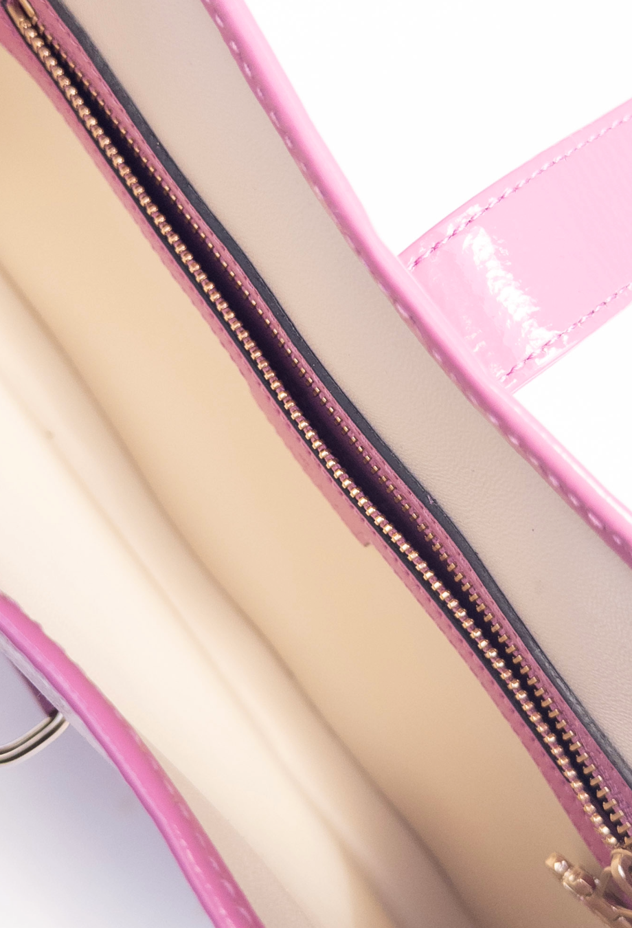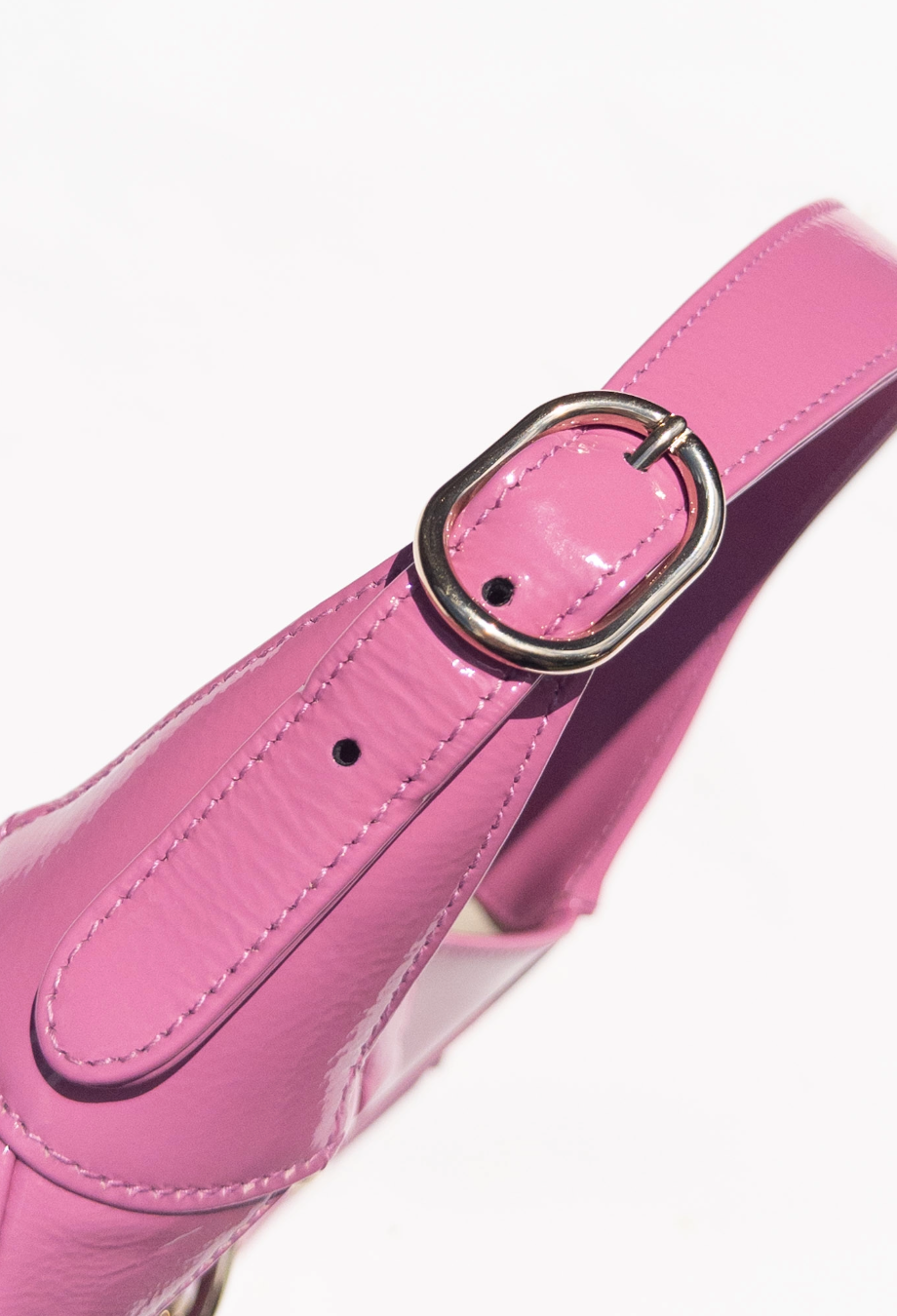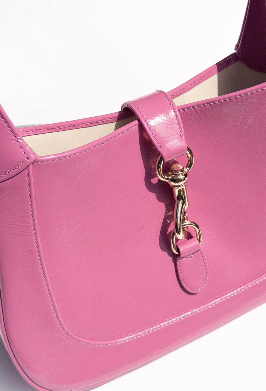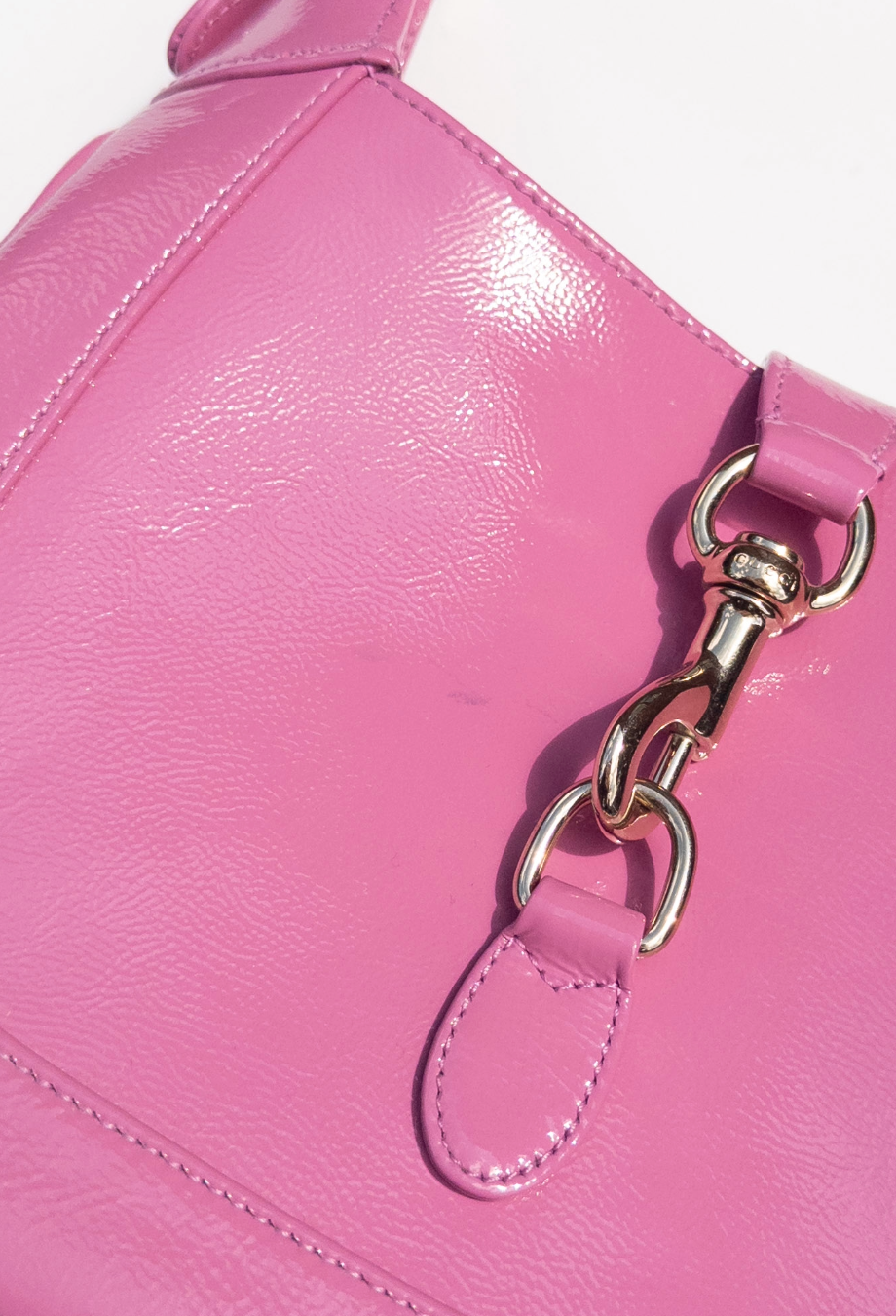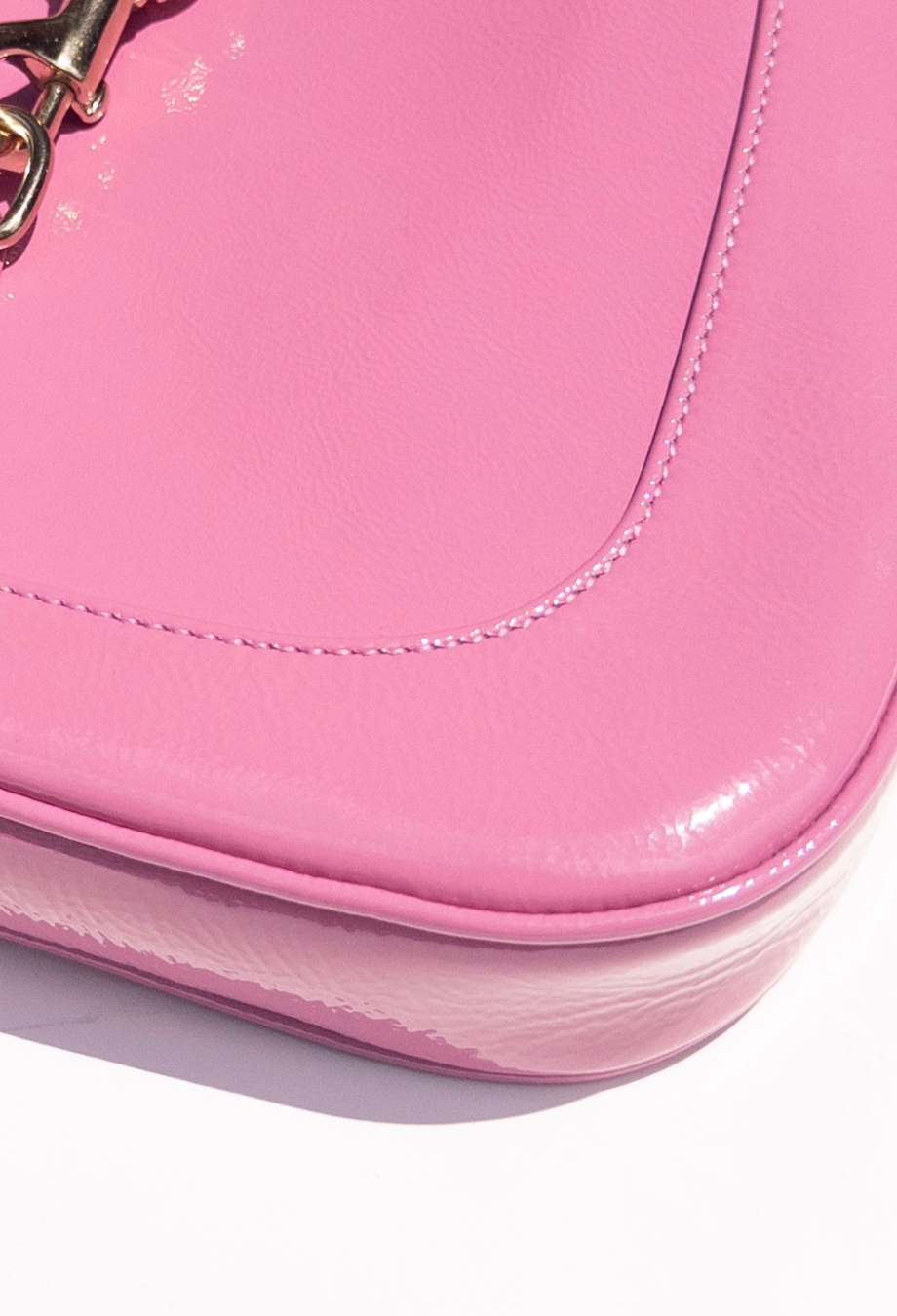 Gucci’s iconic Jackie bag is reimagined in a bold, playful mood with this glossy pink patent-leather edition. Its structured, softly curved silhouette highlights the house’s signature archival piston closure in polished gold-tone hardware. The high-shine patent finish gives the classic Jackie a contemporary edge, while the clean lines and minimal detailing ensure it remains effortlessly cool. Inside, the compact interior is perfectly sized for daily essentials, making it an ideal piece for both day and evening. Style it with denim or tailoring to bring a vibrant pop of colour to any look.