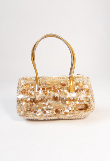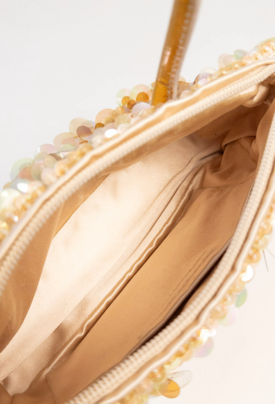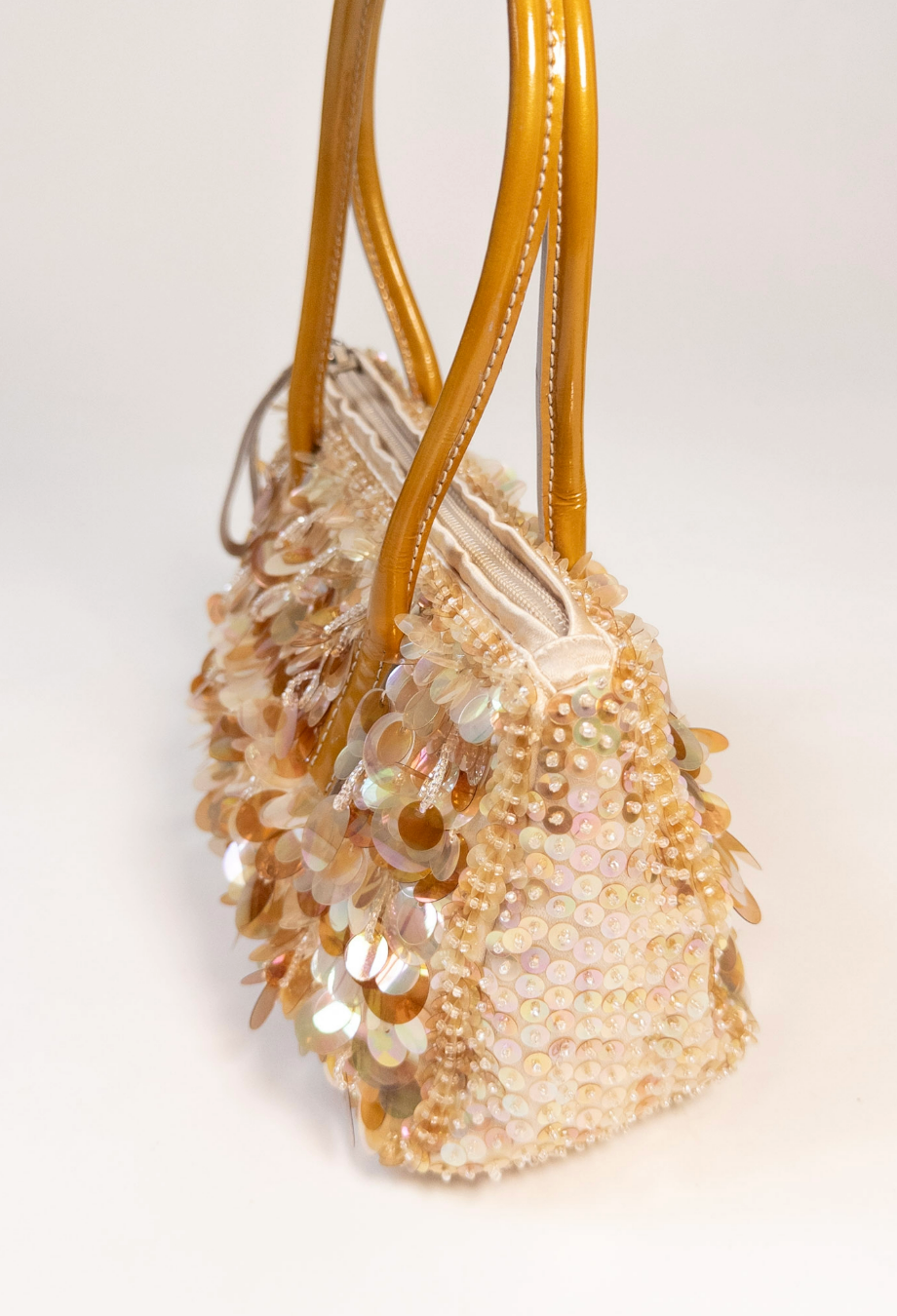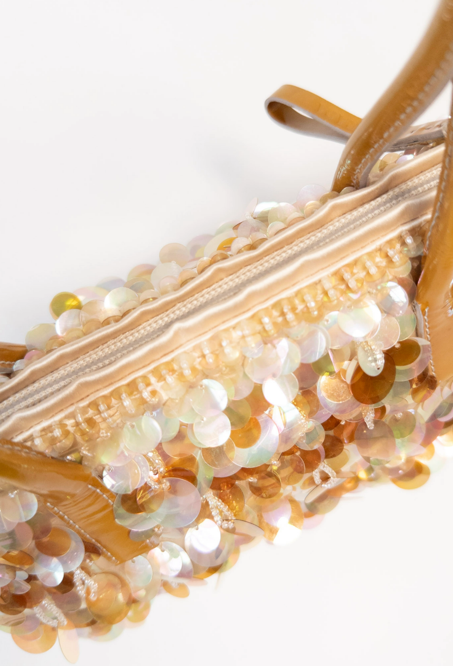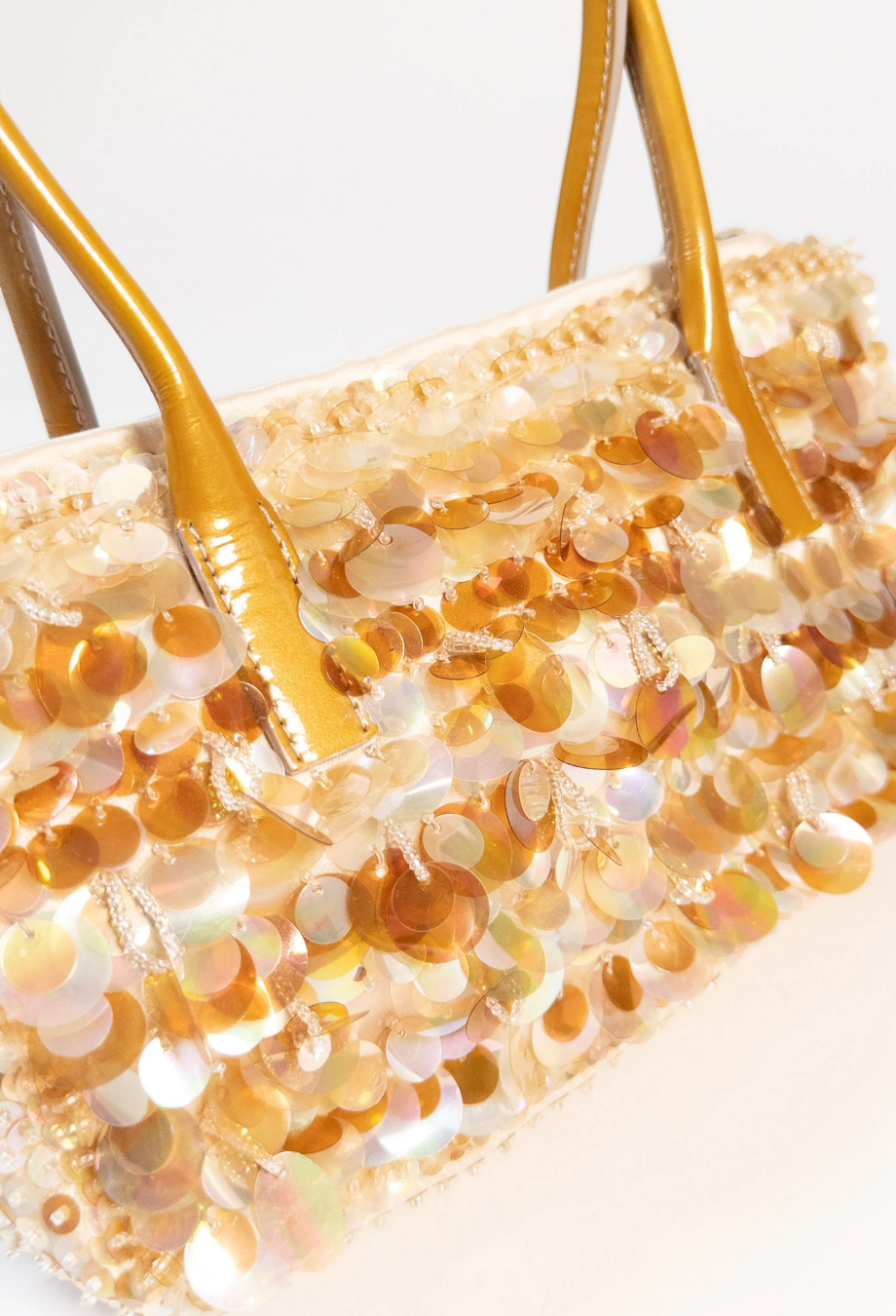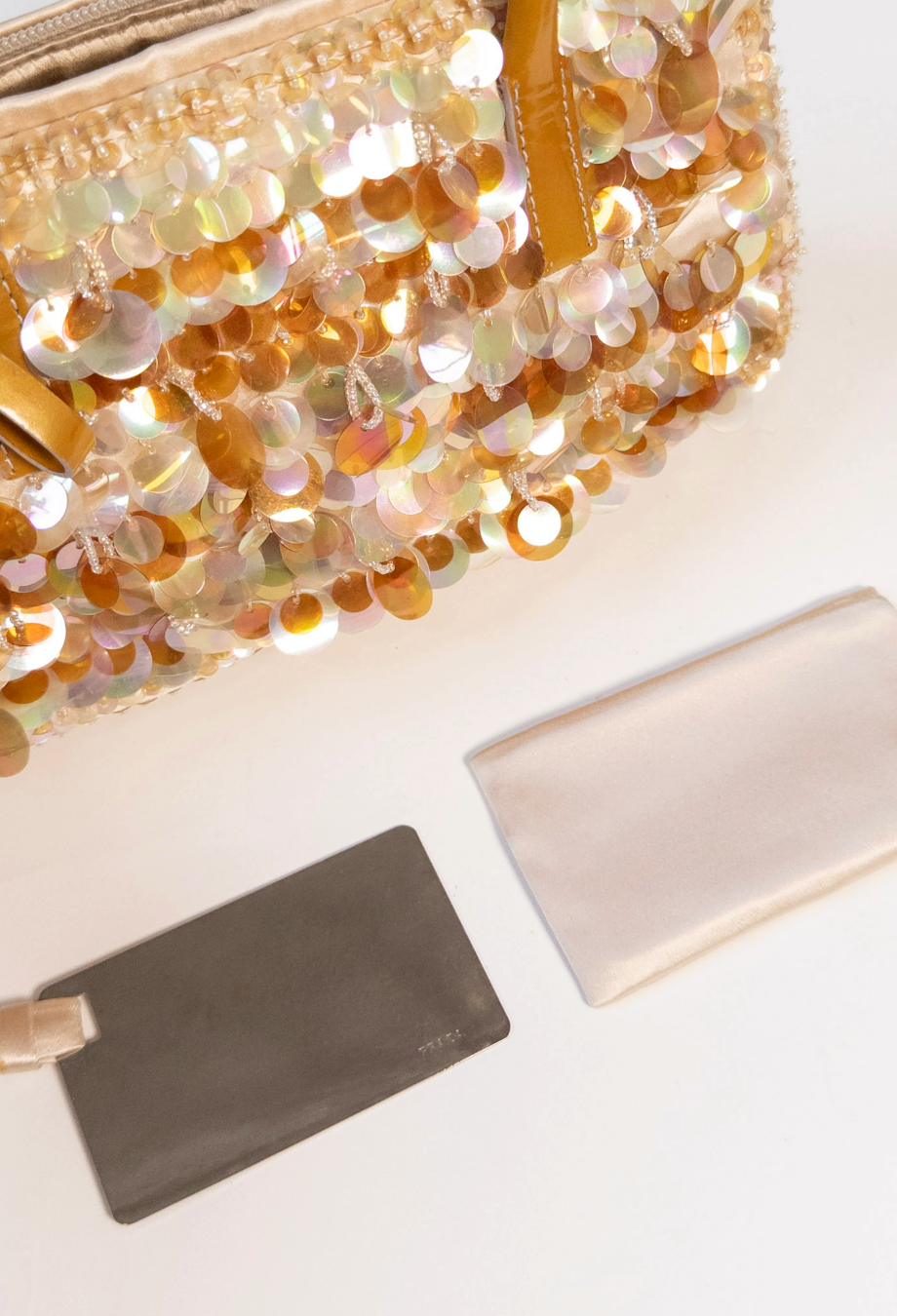 A dazzling nod to early 2000s charm, Prada’s mini pochette bag is reimagined in a cascade of light-catching sequins that shimmer with every movement. Rendered in a warm champagne hue with tonal beading, this compact silhouette captures the house’s knack for playful elegance and precise Italian craftsmanship. The soft satin body is adorned with oversized iridescent paillettes, delicately hand-sewn to catch the light from every angle. Golden mustard patent leather top handles and a matching zipper pull add structure and shine, while the satin-lined interior offers just enough space for your evening essentials. Whether paired with denim for a flash of contrast or worn with a silk slip at night, this archival piece is a celebration of texture, light, and unmistakable Prada glamour.