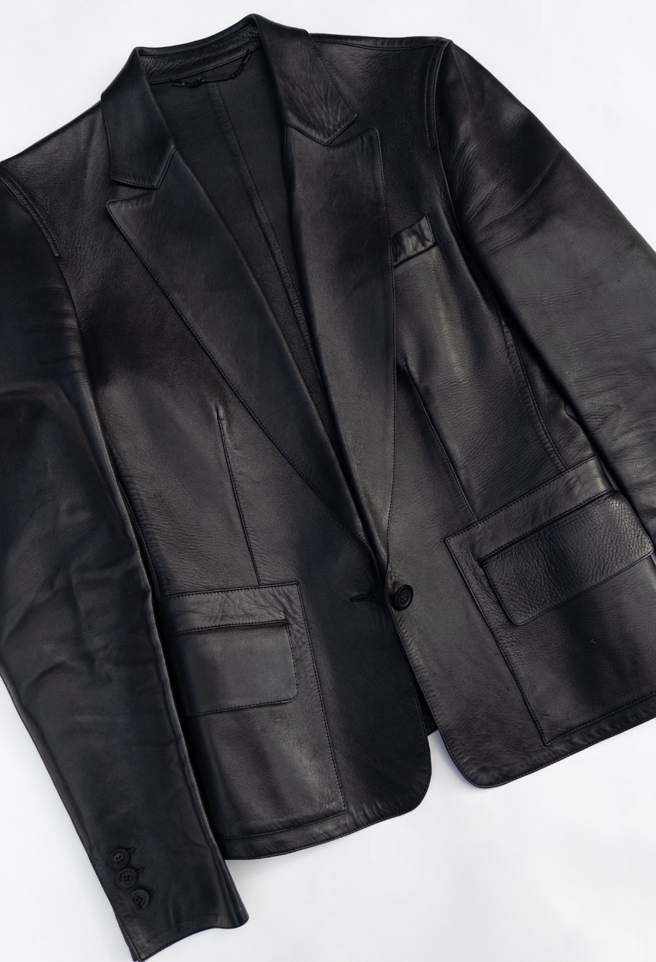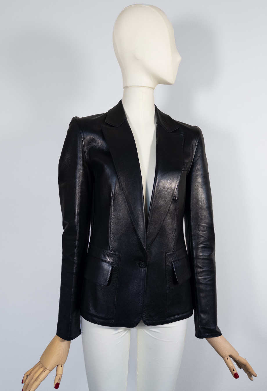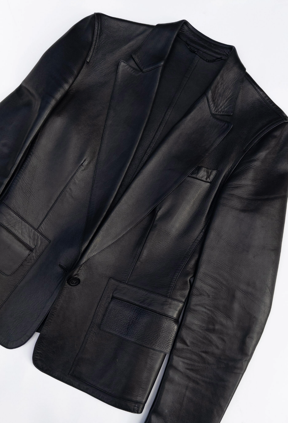 Gucci x Tom Ford Black Leather Blazer Jacket became more than a wardrobe staple—it was a declaration. This sharply tailored piece, crafted in Italy from supple black leather, exemplifies the sensual minimalism Ford championed throughout his transformative tenure in the late '90s and early 2000s. Structured shoulders and peak lapels frame the body with precision, while the single-button closure and patch pockets nod to classic menswear tailoring. Fully lined and cut for a close silhouette, this piece is just as classic 20 years later. Style it over bare skin, as seen on the runway, or wear it on a cold day with a simple tee and your favourite pair of jeans.