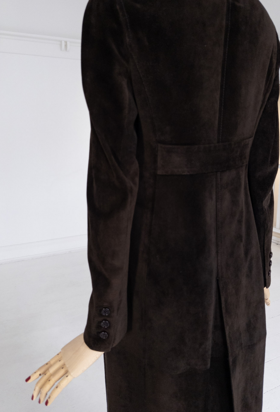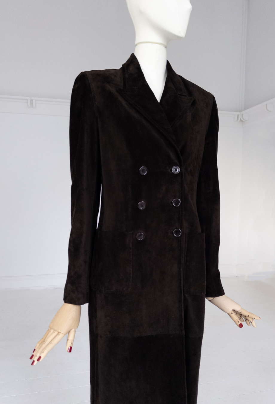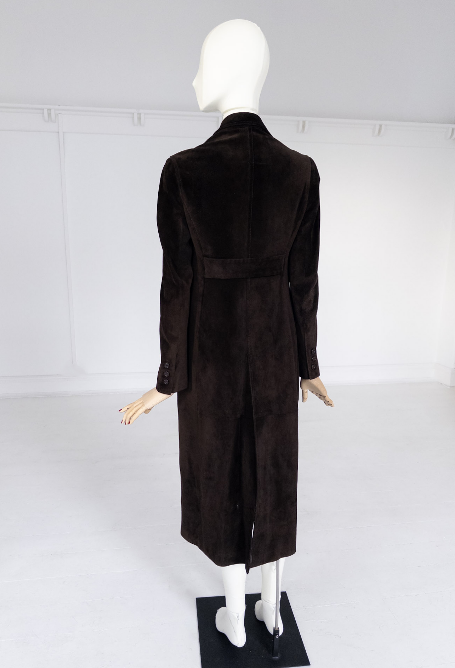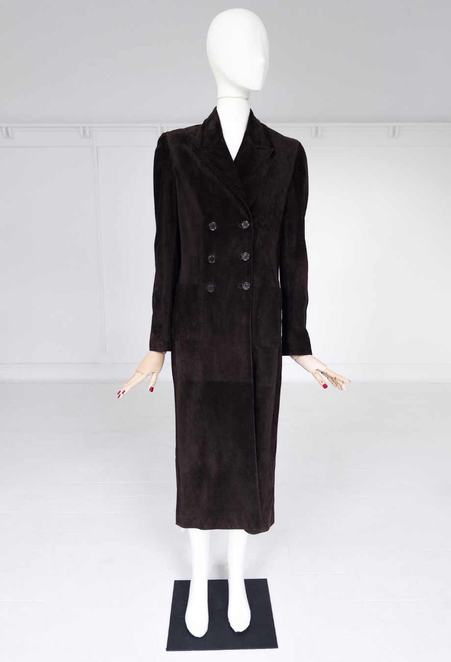 Prada’s vintage brown suede coat is a masterclass in understated luxury, exuding the effortless sophistication synonymous with the brand’s early designs. Cut for a structured yet fluid silhouette, the double-breasted shape is softened by its sumptuously smooth suede, which drapes elegantly over the body. A sharply tailored waist panel enhances the feminine form, while peak lapels and tonal buttons lend a refined finish. Lined for a seamless fit, it moves with a subtle fluidity, making it as practical as it is polished. Layer yours over knitwear and boots for a timeless take on cool-weather dressing.