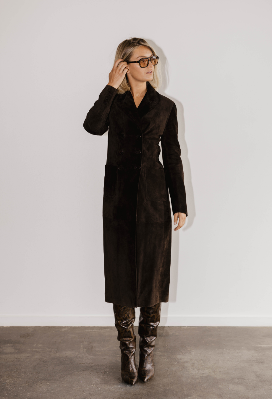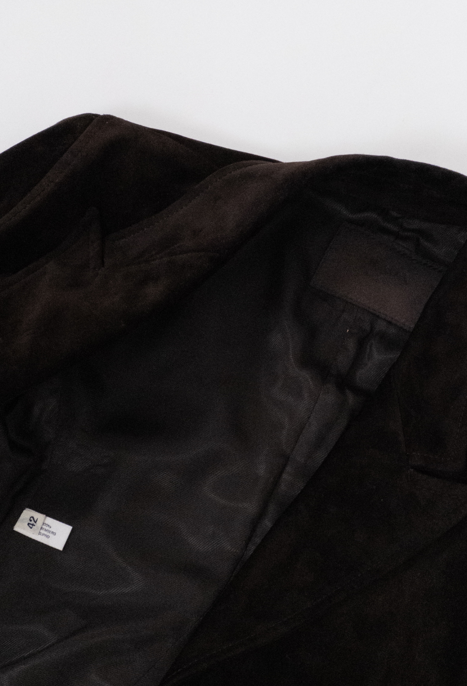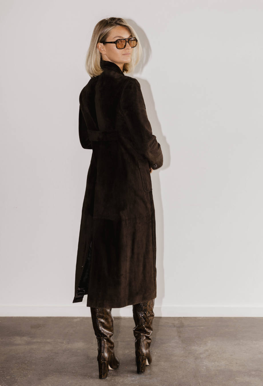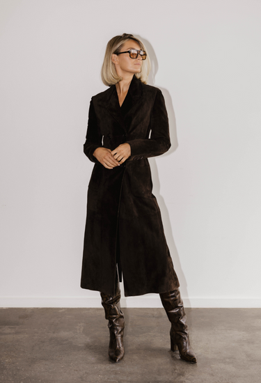 Prada’s vintage brown suede coat is a masterclass in understated luxury, exuding the effortless sophistication synonymous with the brand’s early designs. Cut for a structured yet fluid silhouette, the double-breasted shape is softened by its sumptuously smooth suede, which drapes elegantly over the body. A sharply tailored waist panel enhances the feminine form, while peak lapels and tonal buttons lend a refined finish. Lined for a seamless fit, it moves with a subtle fluidity, making it as practical as it is polished. Layer yours over knitwear and boots for a timeless take on cool-weather dressing.