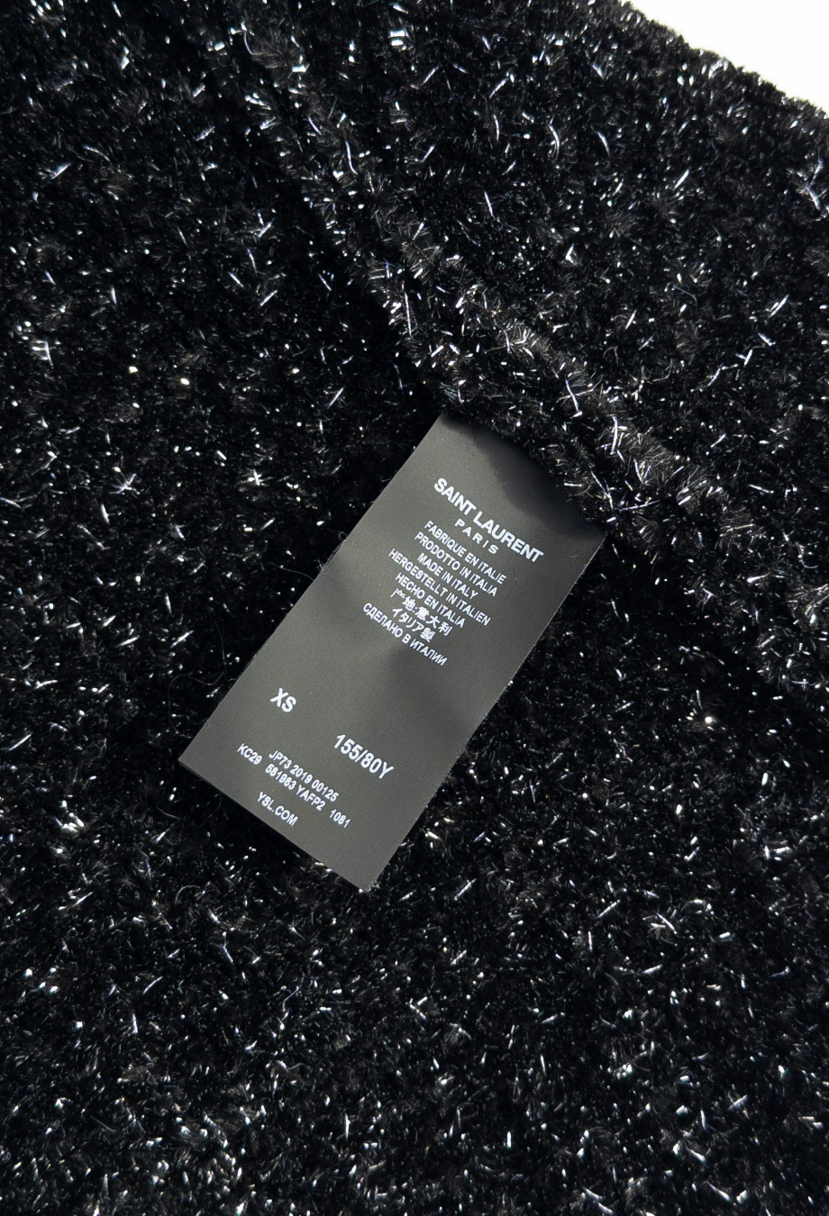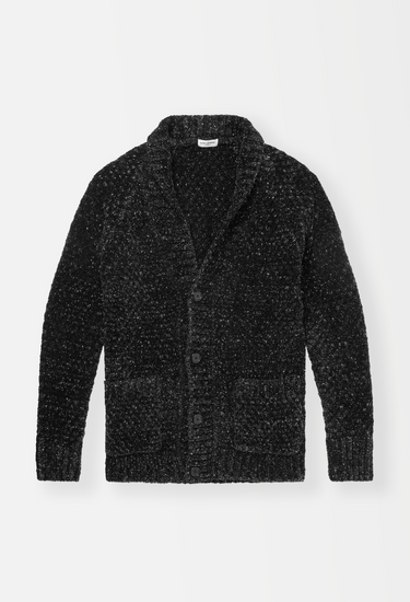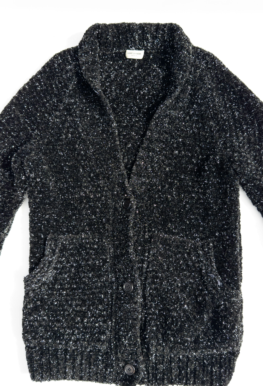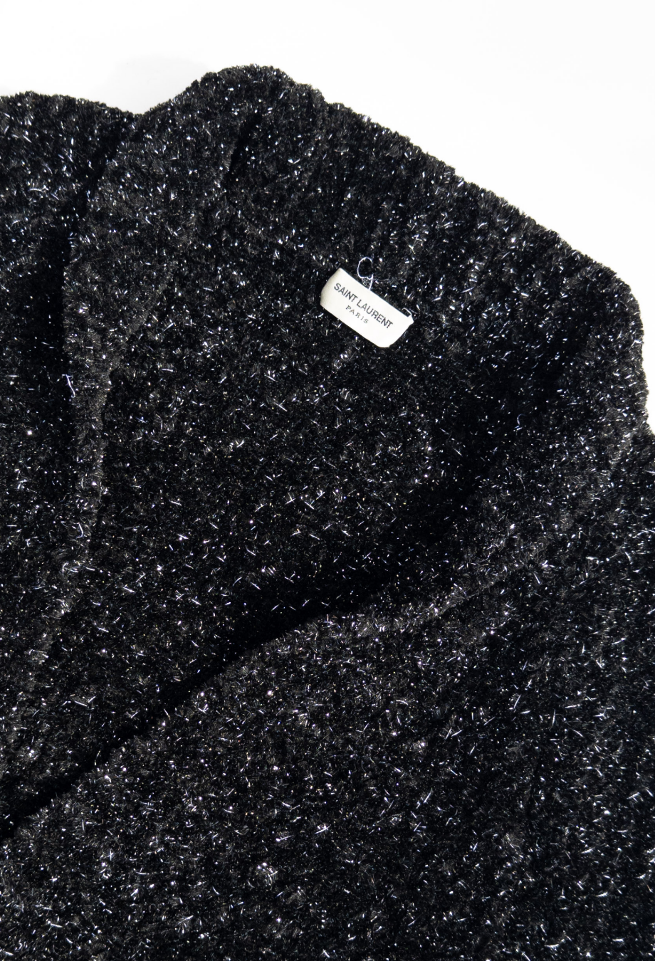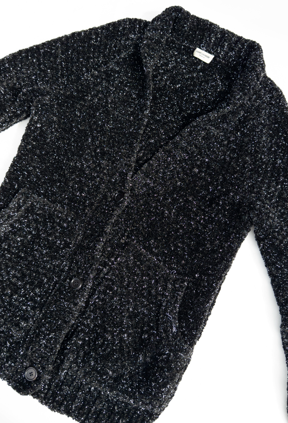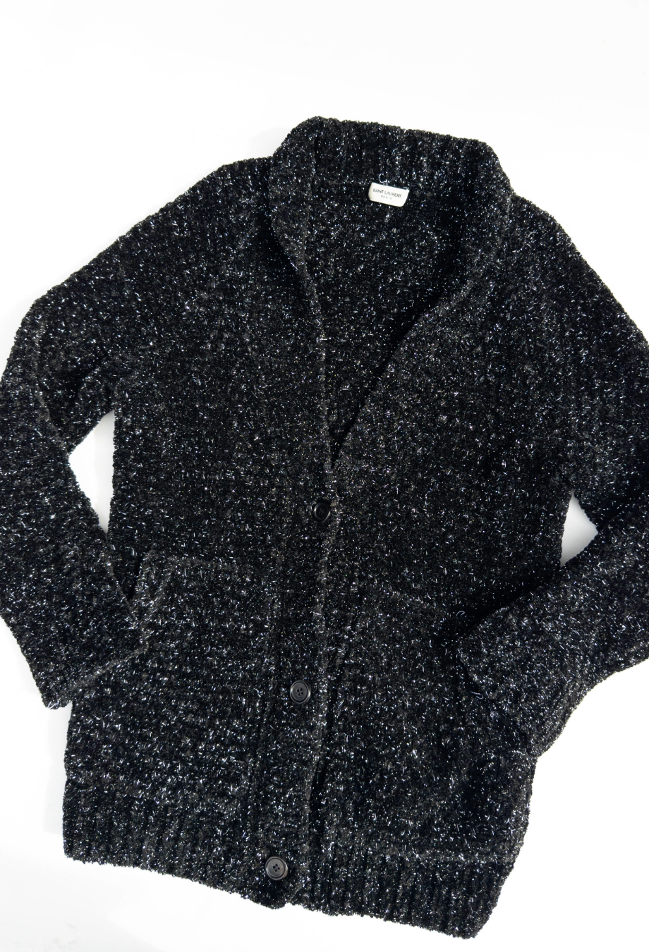 Saint Laurent’s Lurex Chenille Cardigan transforms a wardrobe classic into a quietly decadent statement. Knitted in Italy from plush chenille yarns infused with metallic lurex, the textured finish glistens subtly with movement, lending a sense of modern glamour to its traditionally relaxed silhouette. Designed with a deep shawl collar, front patch pockets and tonal buttons, it channels the house’s signature Parisian ease with a tactile, high-shine twist. Drape it over evening wear for contrast or layer it with crisp shirting and tailored trousers for an off-duty polish.