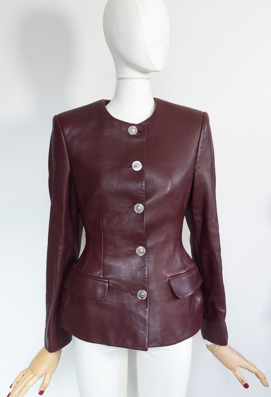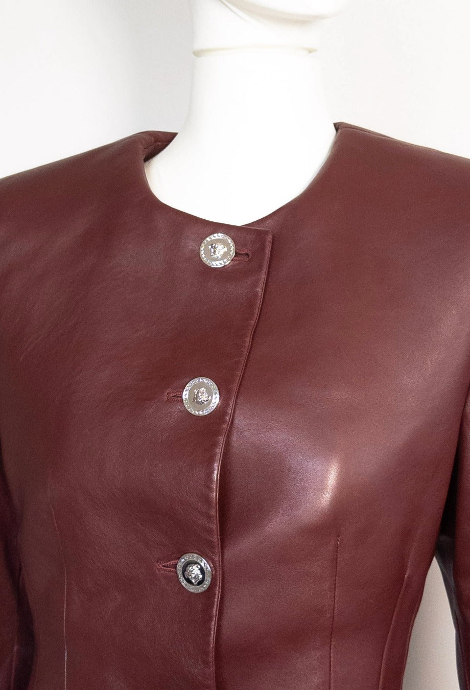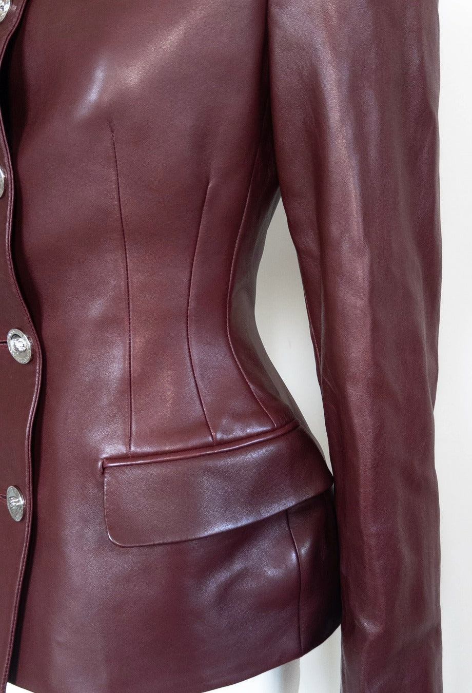 Expertly tailored in Italy from supple burgundy leather, this hourglass Versace jacket sculpts the waist with strong shoulders, precision darts, and a sharply cinched cut. A subtle-gloss finish enhances its richness, while signature silver-tone Medusa adorn the front. Style it with the coordinating leather mini or contrast with fluid silk trousers. Sold out and hard-to-find runway peace.