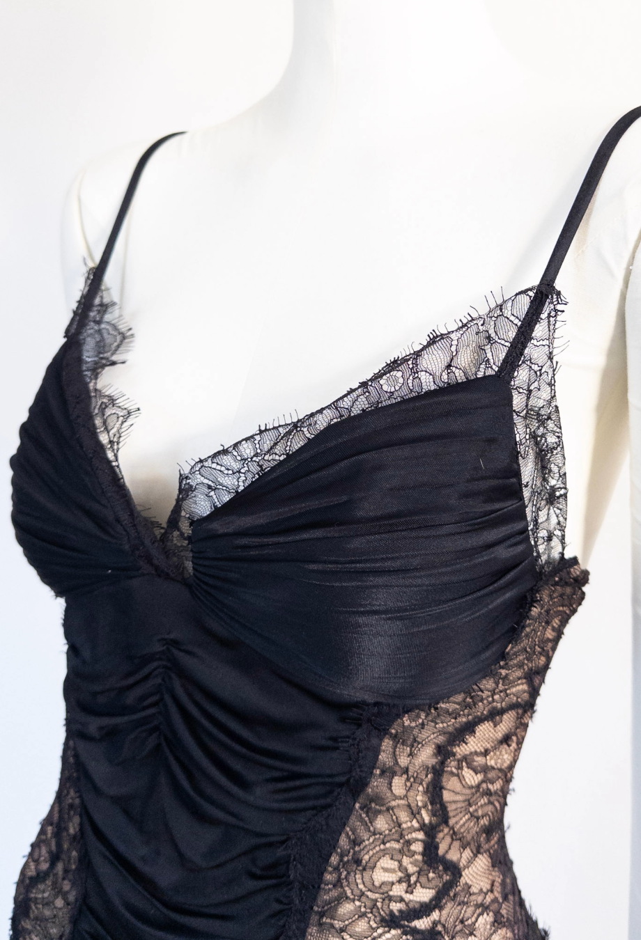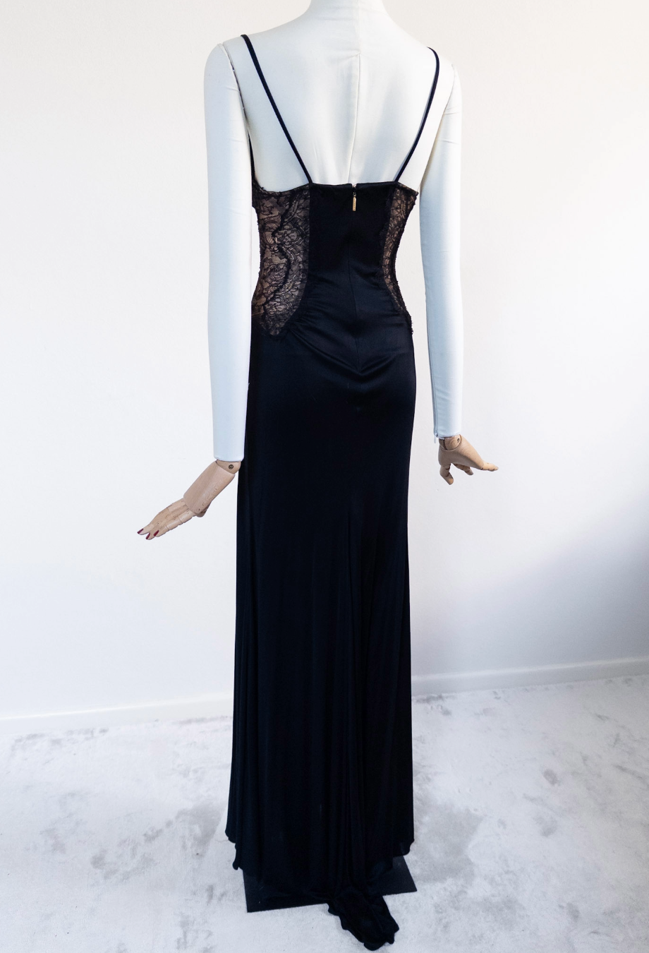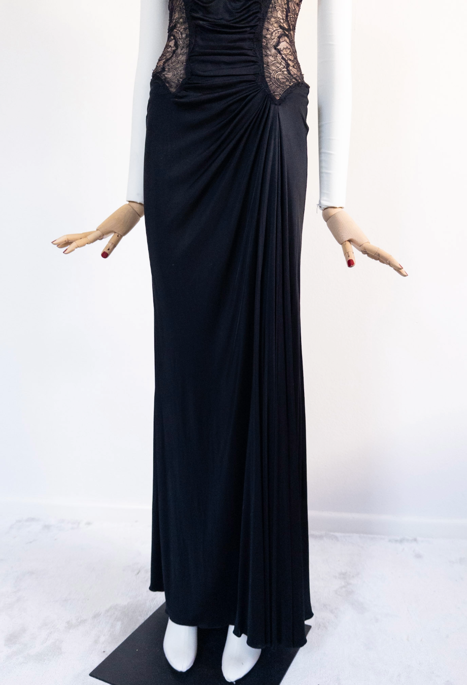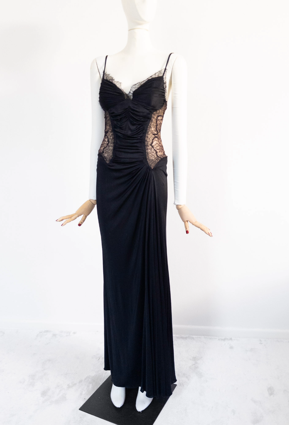 This Roberto Cavalli vintage side lace gown is a perfect black tie number. Crafted from fluid black stretch jersey, it contours the body with artful ruching through the bodice and hips, creating a beautifully sculpted silhouette. Nude lace panels trace the sides and neckline, revealing glimpses of skin in true Cavalli style. A timeless piece of Italian art, this gown is an incredible piece that will always be in style.