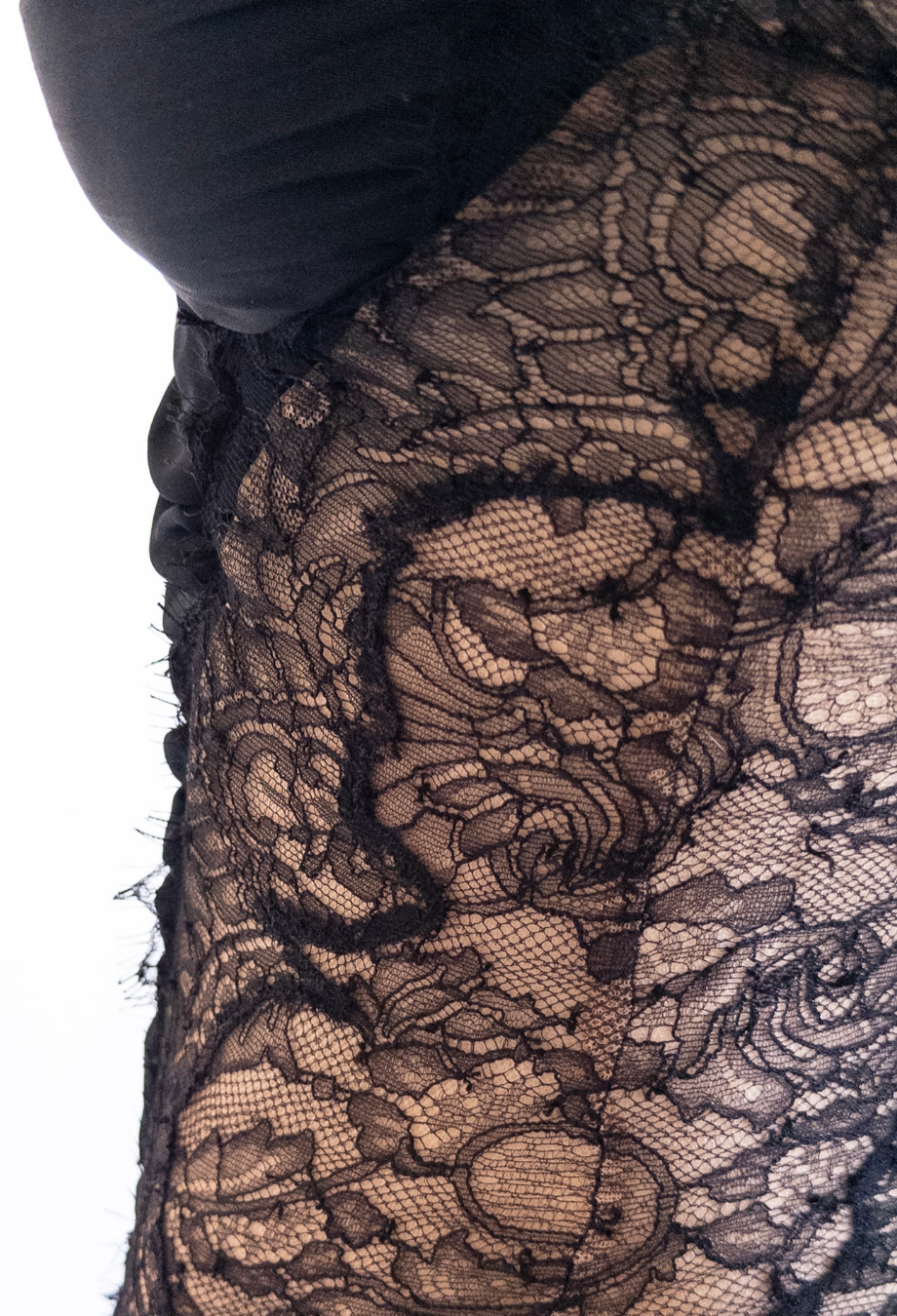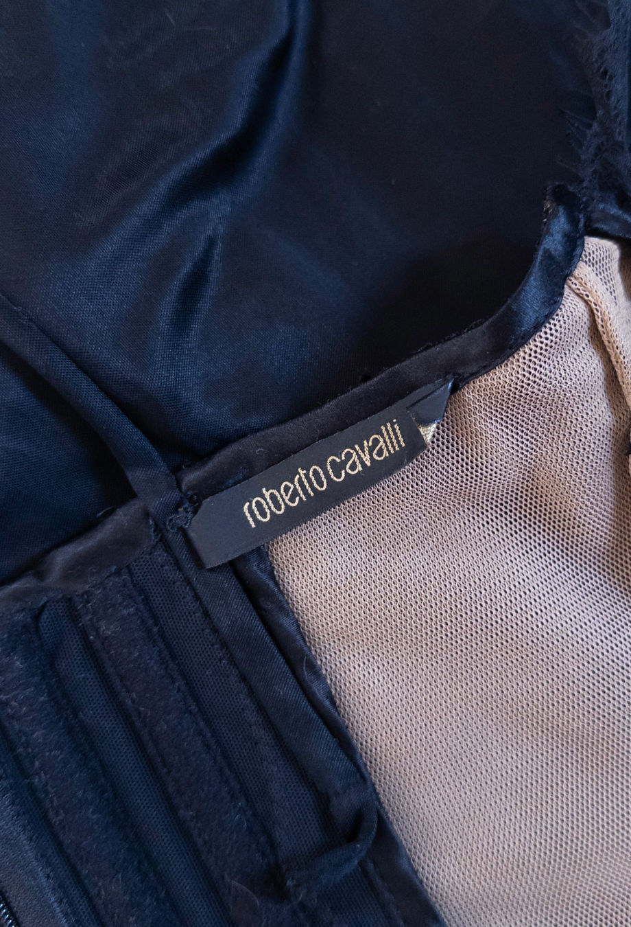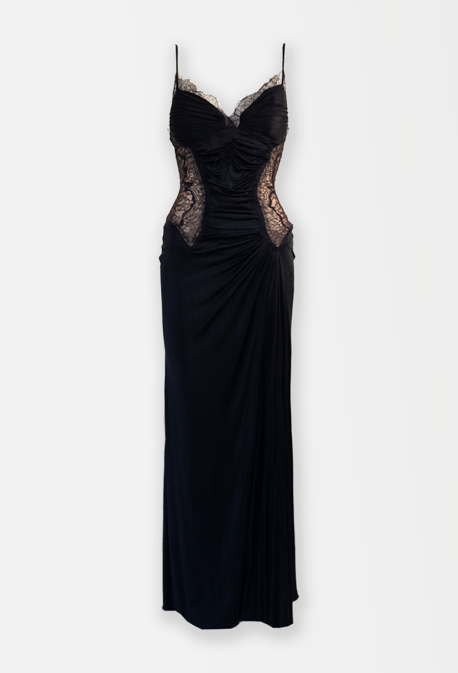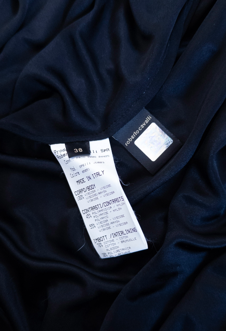 This Roberto Cavalli vintage side lace gown is a perfect black tie number. Crafted from fluid black stretch jersey, it contours the body with artful ruching through the bodice and hips, creating a beautifully sculpted silhouette. Nude lace panels trace the sides and neckline, revealing glimpses of skin in true Cavalli style. A timeless piece of Italian art, this gown is an incredible piece that will always be in style.