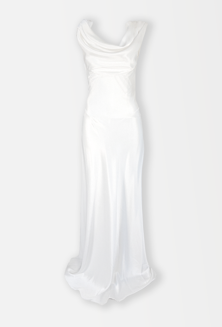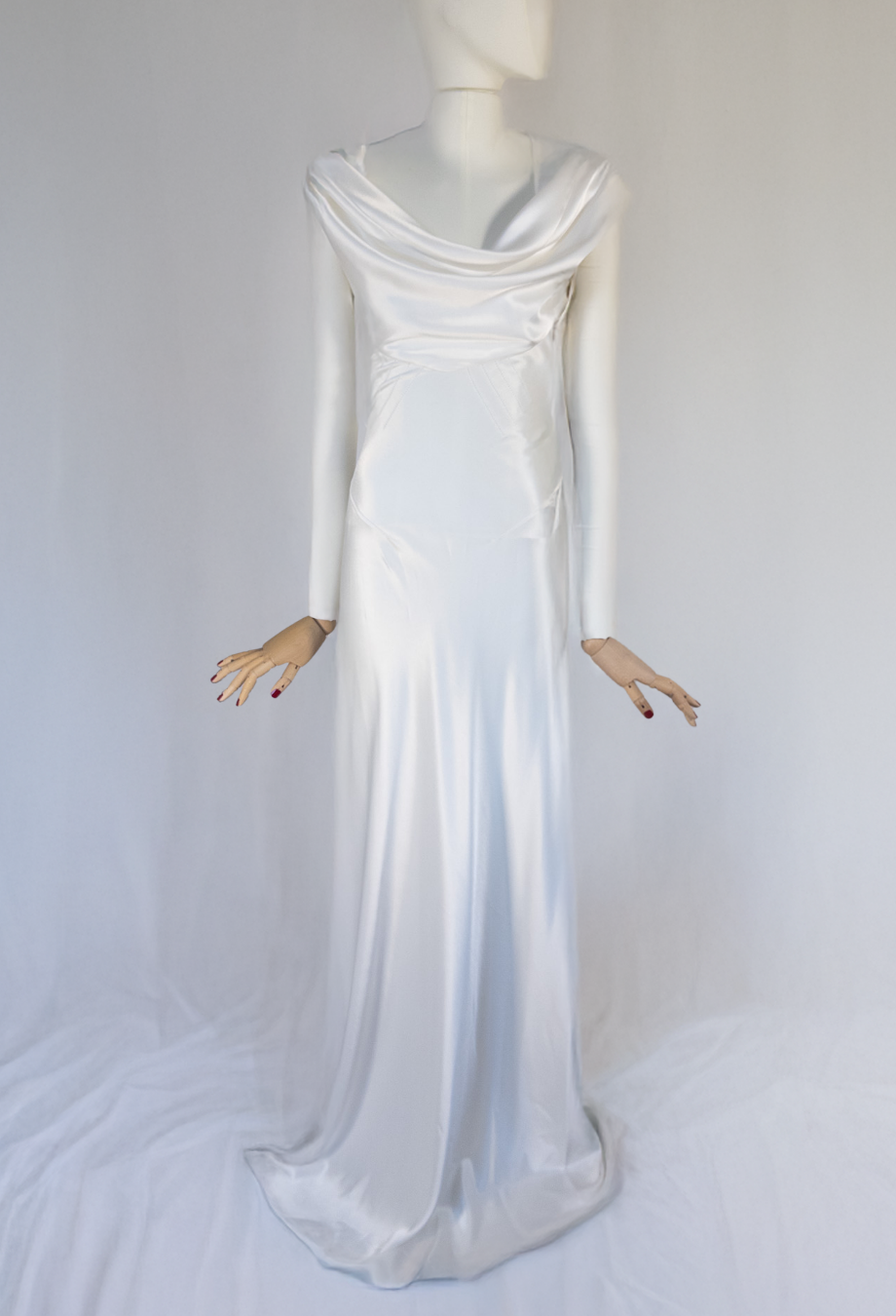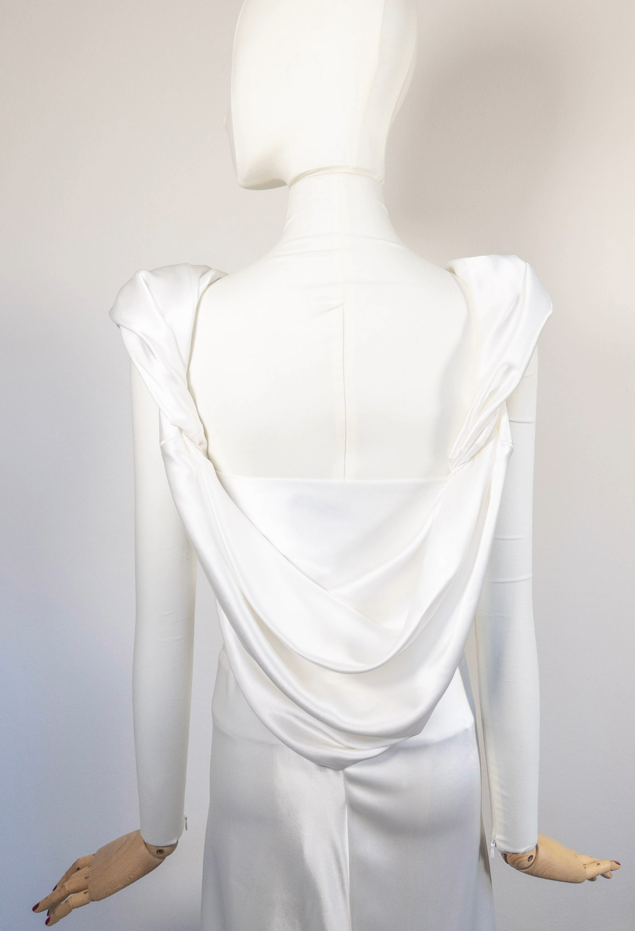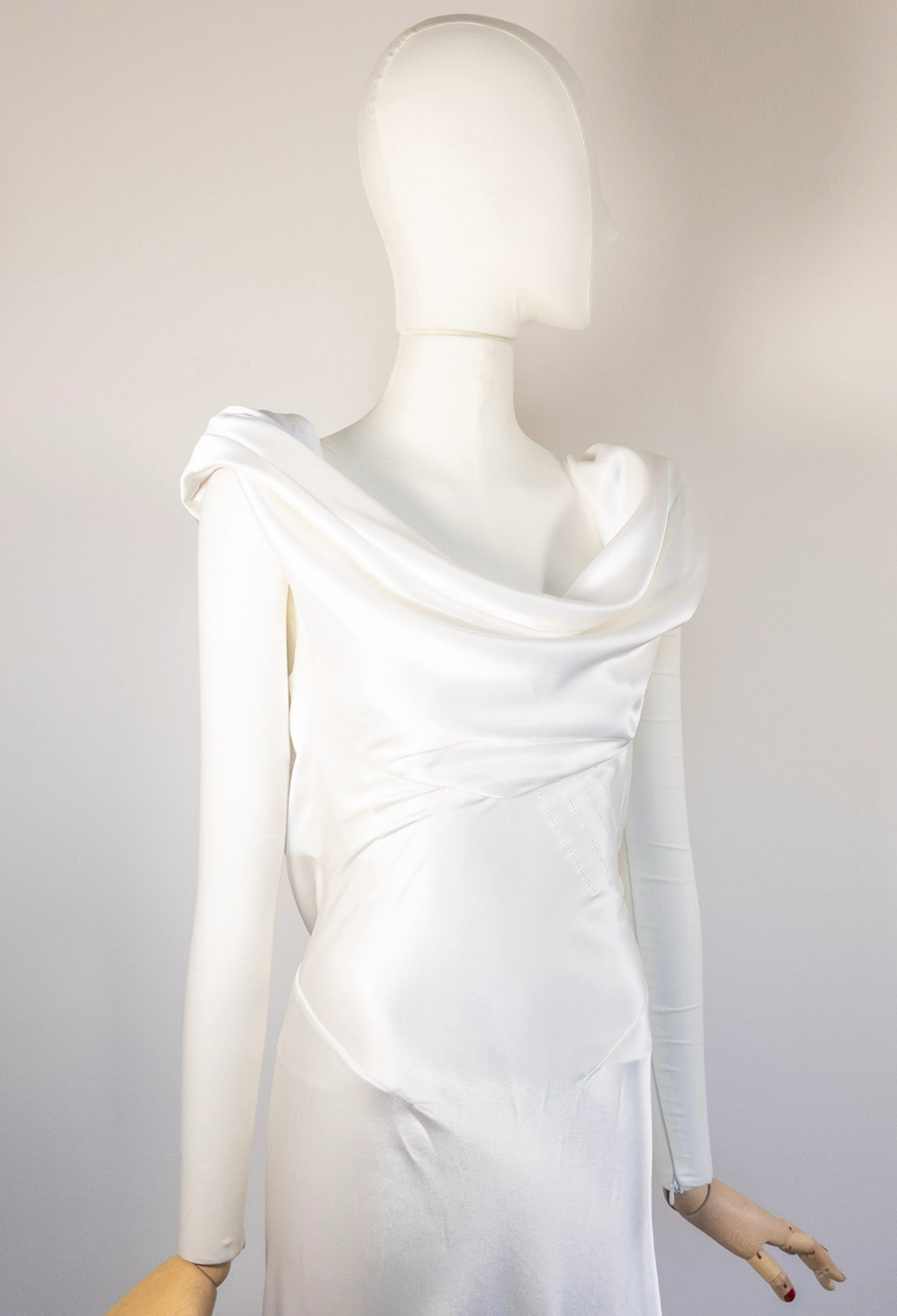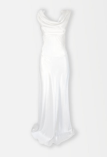 Ethereal, timeless, and imbued with haute couture heritage, this vintage Balenciaga bridal gown captures the maison’s reverence for structure and elegance. Cut from lustrous ivory satin, the gown drapes fluidly over the body, anchored by an artfully cowl-draped neckline that softly mirrors the same detail across the open back. A bias-cut silhouette flatters and elongates, pooling delicately into a floor-sweeping hem that moves with quiet grace. A masterclass in minimalism, this archival piece reflects Balenciaga’s legacy of sculptural tailoring fused with romantic restraint. Salma Hayek notably wore a near-identical version in black to a Vanity Fair gala, proving its red carpet and bridal allure alike. Understated yet unforgettable, it’s an heirloom-worthy choice for the modern bride drawn to old-world glamour and contemporary fluidity.