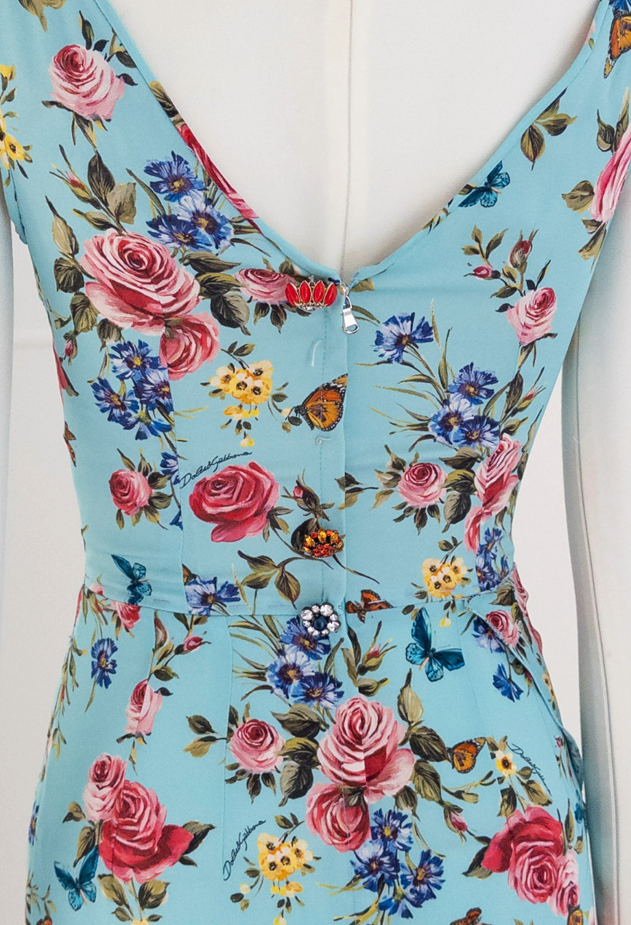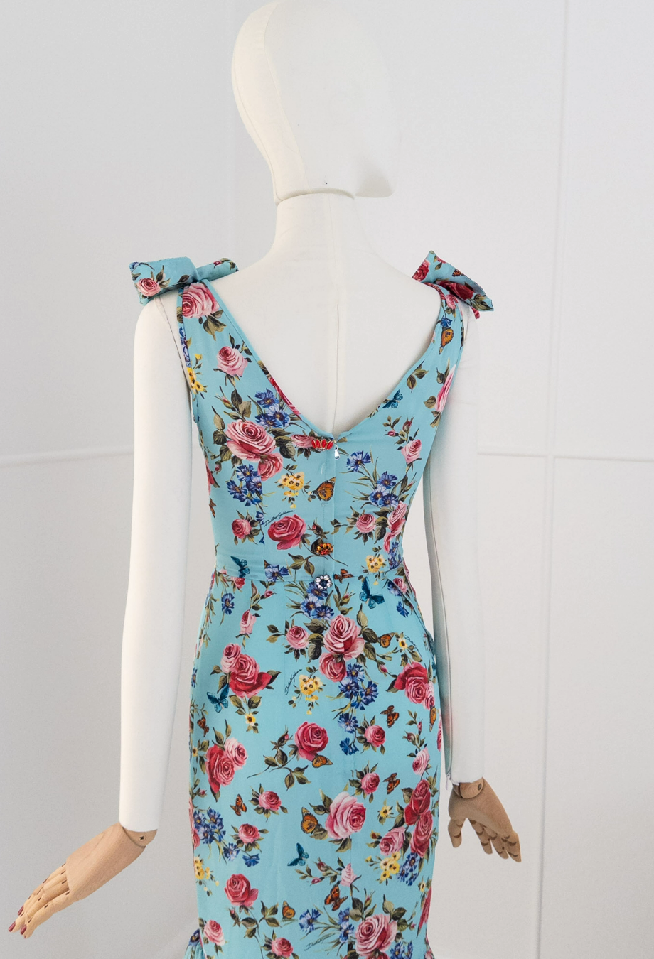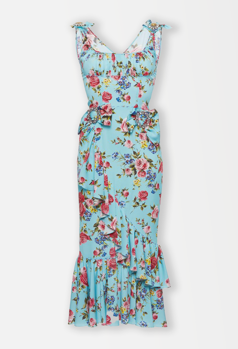 Dolce and Gabbana SS 2017 Runway Floral Midi Dress — this midi dress represents a celebration of Sicilian romance. Cut from a soft, structured stretch-silk blend, the figure-skimming silhouette is adorned with one of the house’s signature floral print - beautiful mix of blooming roses, delicate cornflowers, and butterflies set against a luminous aqua backdrop. Style it with statement earrings and barely-there heels for a fun European summer look.