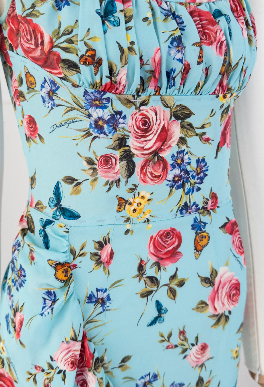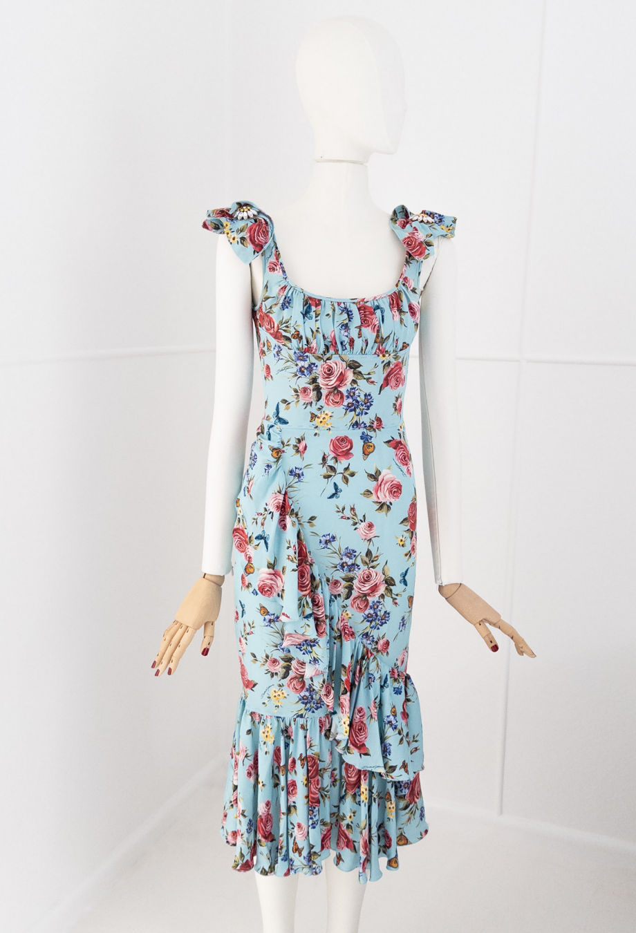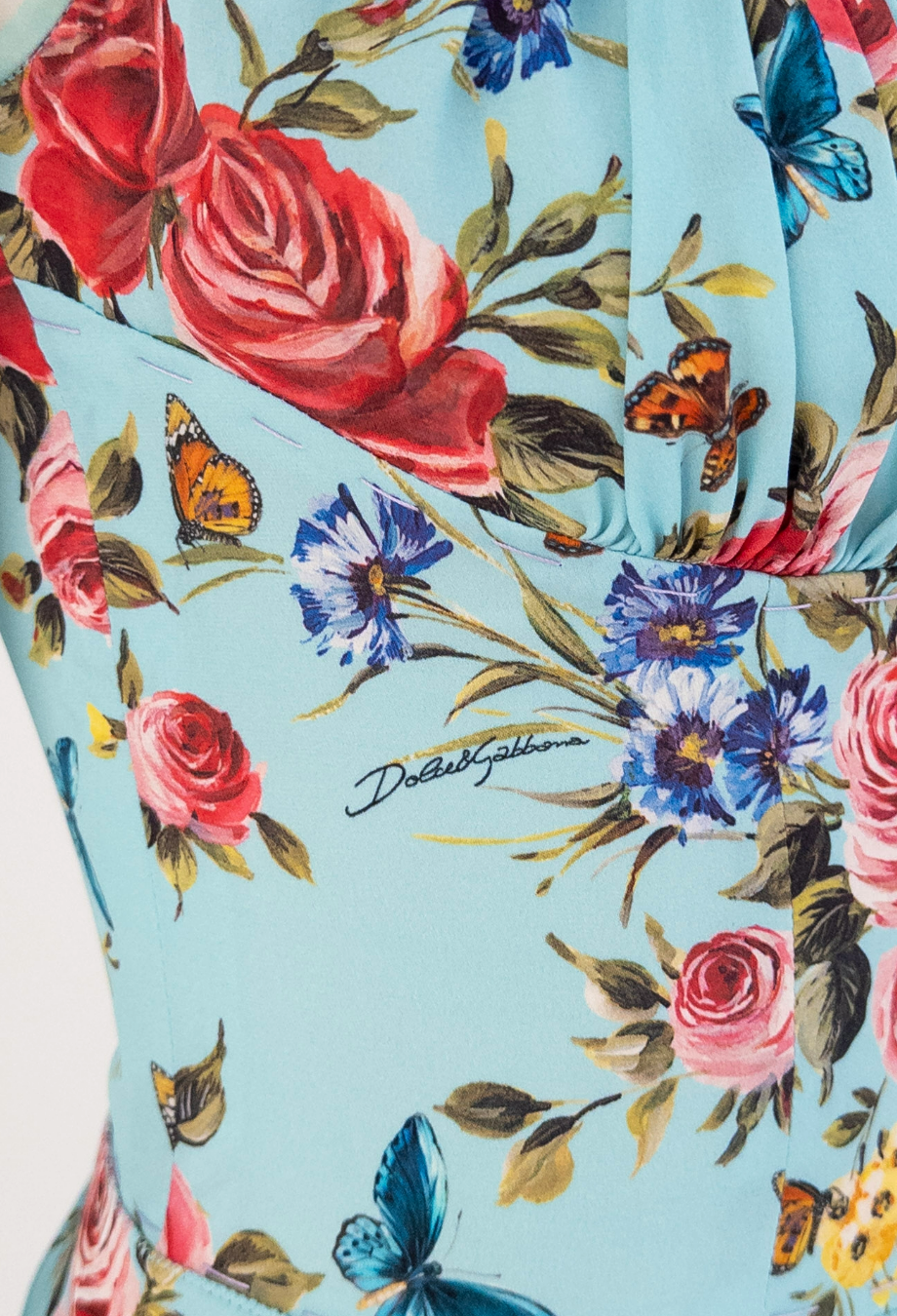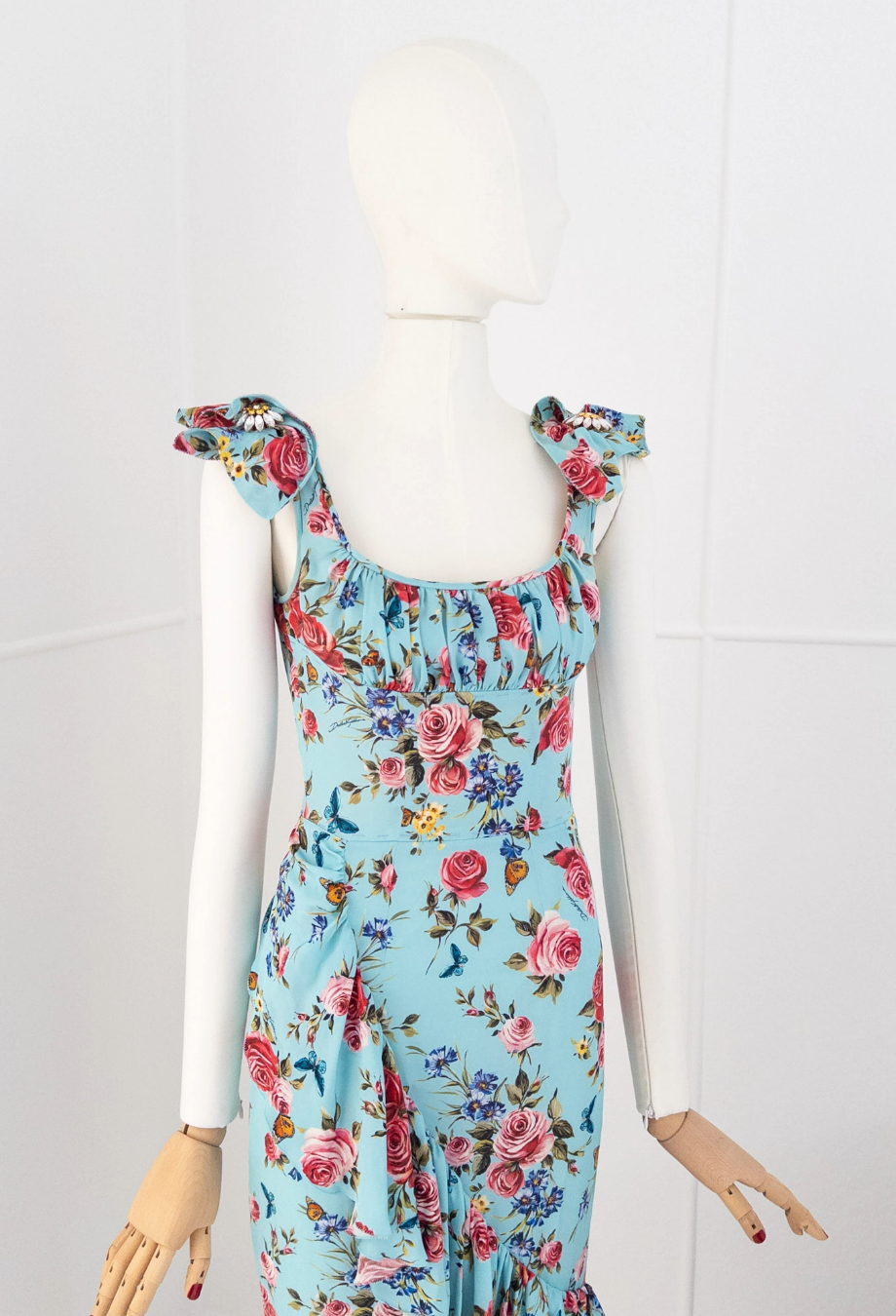 Dolce and Gabbana SS 2017 Runway Floral Midi Dress — this midi dress represents a celebration of Sicilian romance. Cut from a soft, structured stretch-silk blend, the figure-skimming silhouette is adorned with one of the house’s signature floral print - beautiful mix of blooming roses, delicate cornflowers, and butterflies set against a luminous aqua backdrop. Style it with statement earrings and barely-there heels for a fun European summer look.