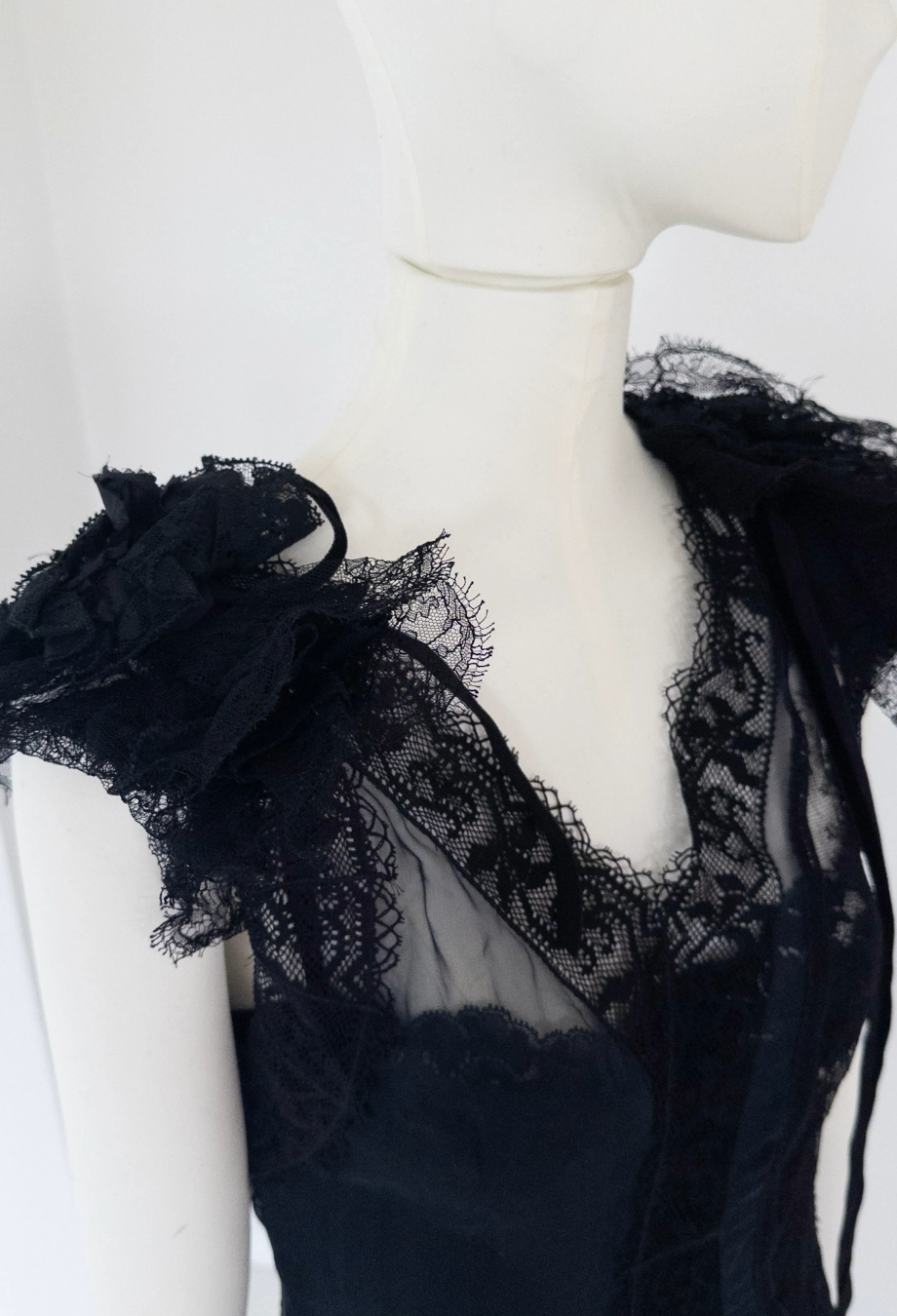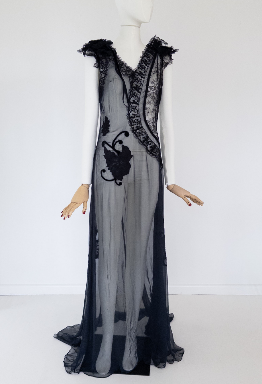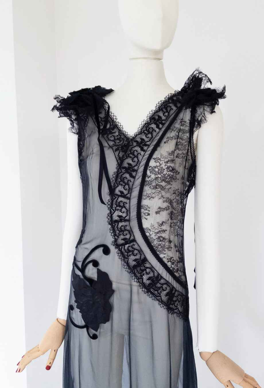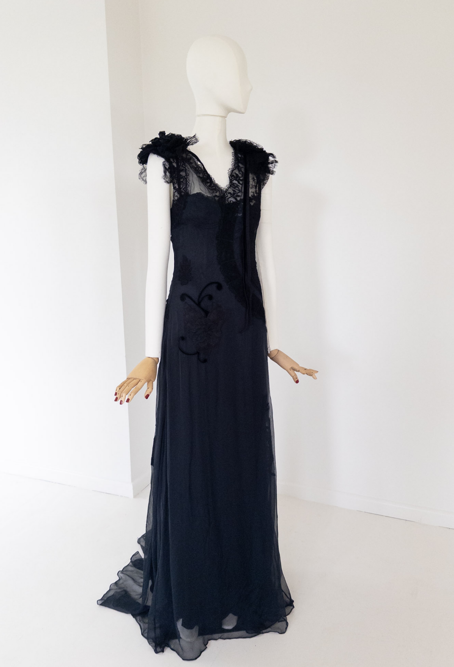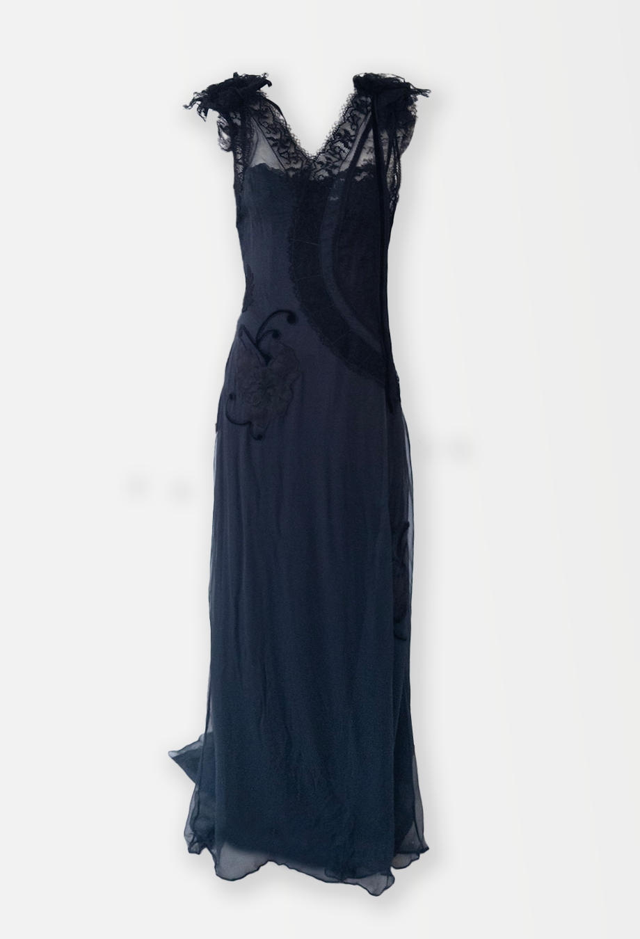Dolce and Gabbana Vintage Maxi Layered Gown — is a beautifully versatile piece and can be worn three ways - top chiffon piece, black satin under piece or layered together. The gown is richly detailed with delicate lace panels and floral appliqués that trace the neckline and shoulders, adding depth and texture. Voluminous ruffled lace blooms at the shoulders frame the décolletage and add a couture-like finish, while the sheer overlay hints at the sultry lingerie-inspired slip beneath. A rare archival piece, this gown embodies Dolce & Gabbana’s darkly romantic aesthetic.