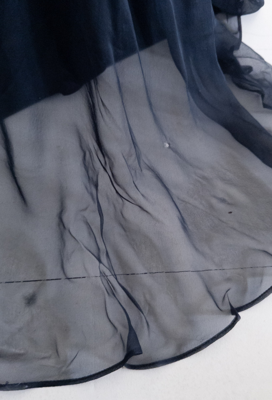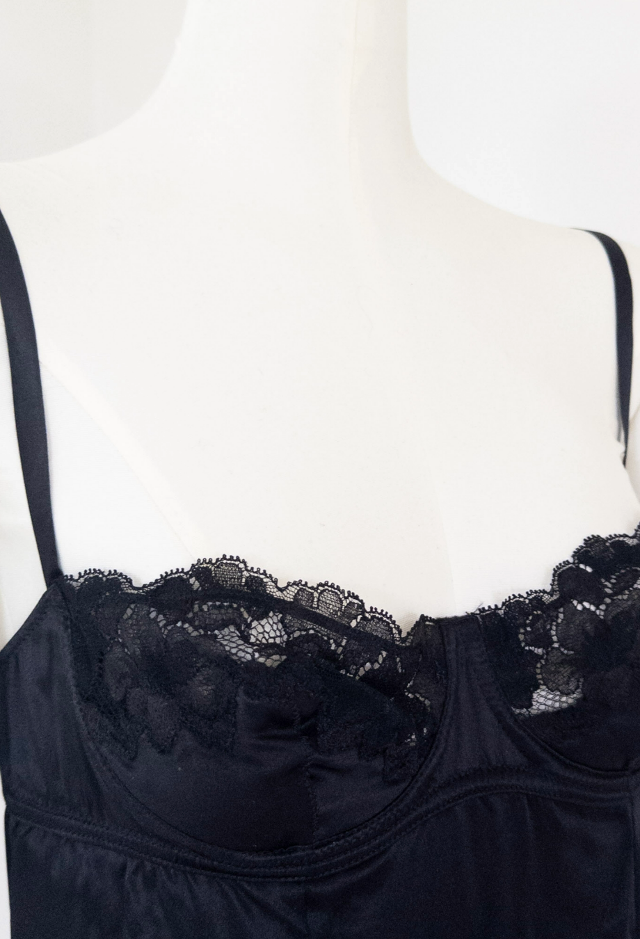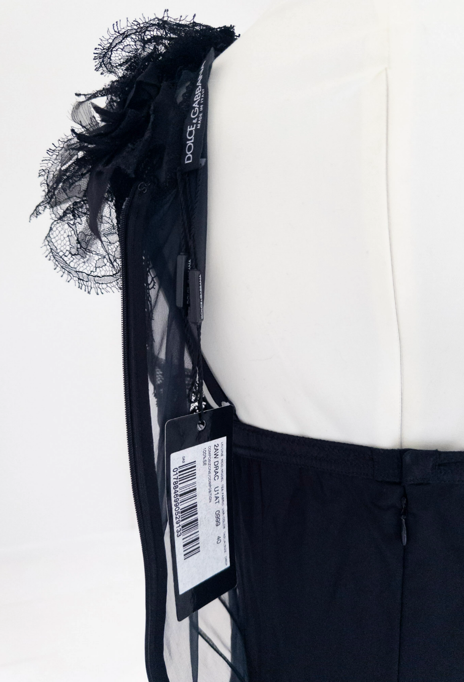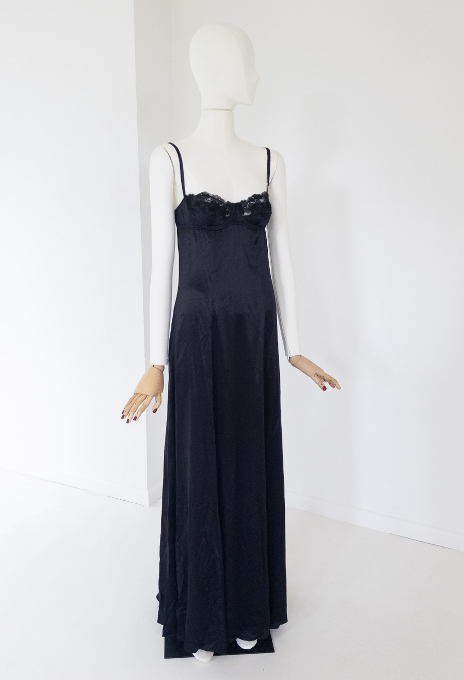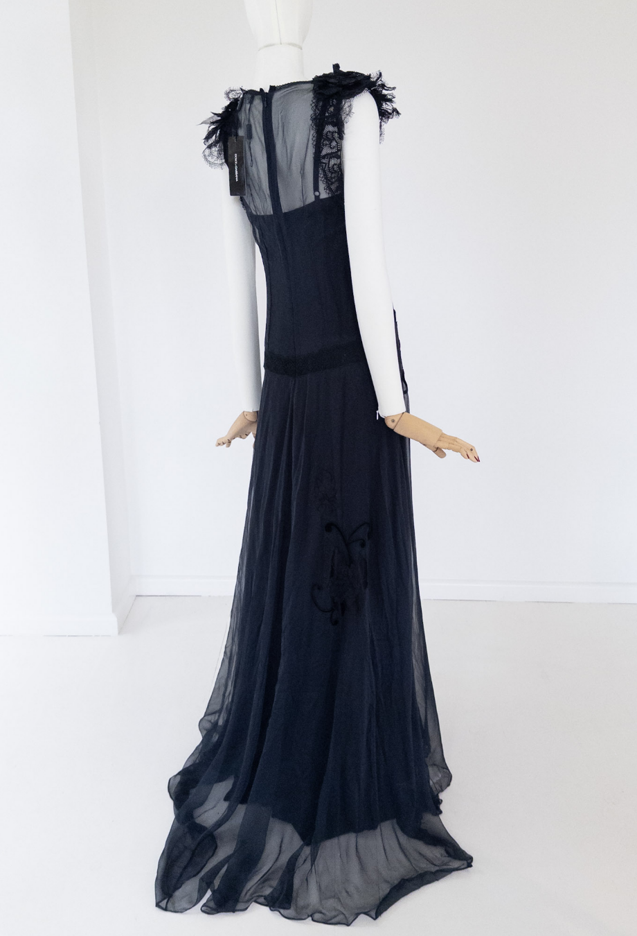 Dolce and Gabbana Vintage Maxi Layered Gown — is a beautifully versatile piece and can be worn three ways - top chiffon piece, black satin under piece or layered together. The gown is richly detailed with delicate lace panels and floral appliqués that trace the neckline and shoulders, adding depth and texture. Voluminous ruffled lace blooms at the shoulders frame the décolletage and add a couture-like finish, while the sheer overlay hints at the sultry lingerie-inspired slip beneath. A rare archival piece, this gown embodies Dolce & Gabbana’s darkly romantic aesthetic.