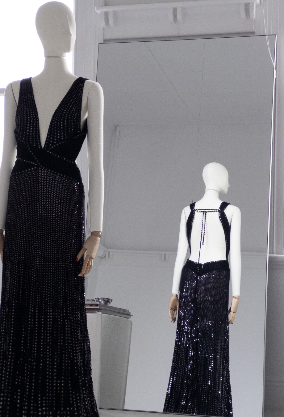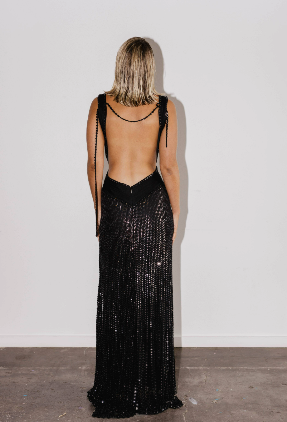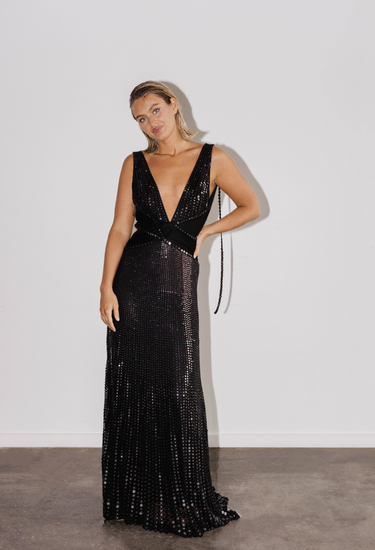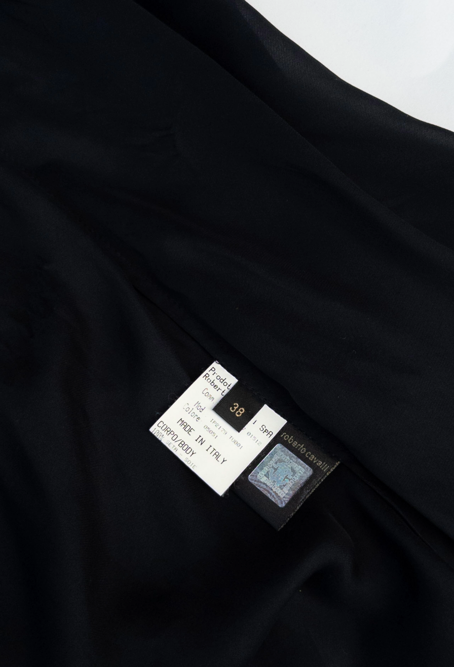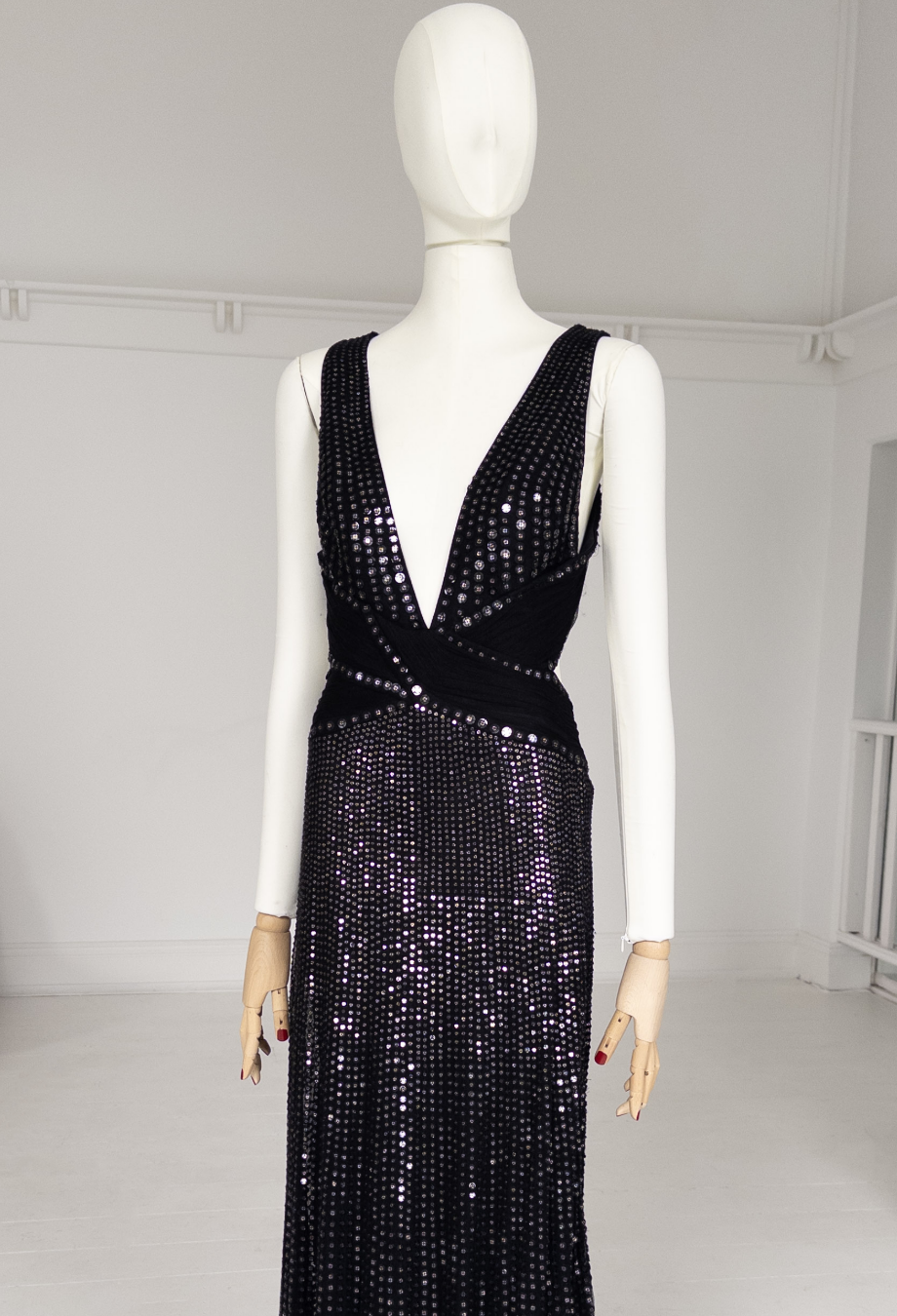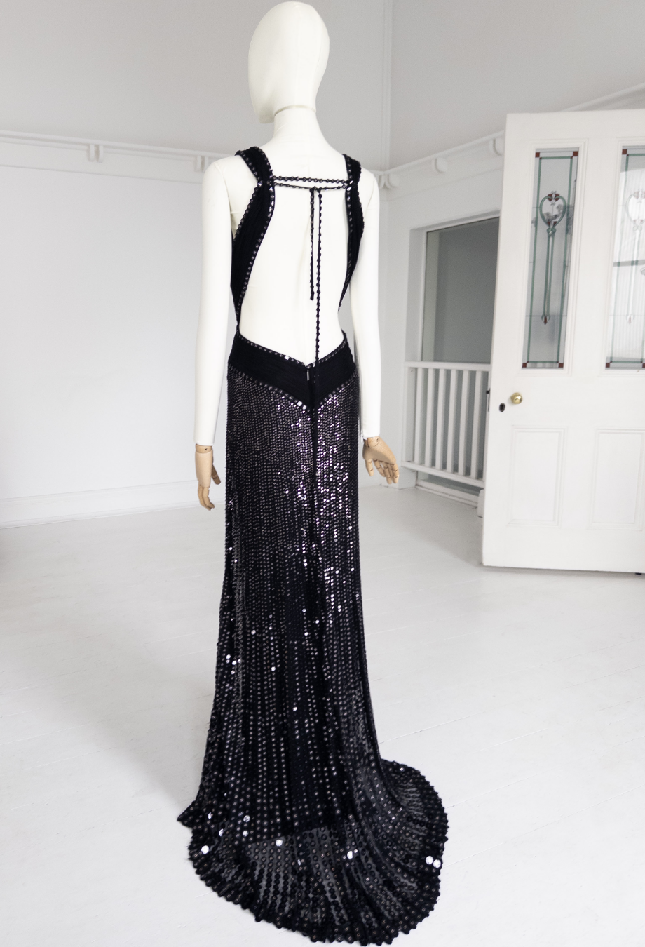 Roberto Cavalli’s Maxi Sequin Gown is an unforgettable showpiece from the designer’s 2007 collection, crafted to command attention. Cut from fluid silk fabric and densely embellished with paillettes, it creates a liquid-shine effect that cascades down the body in a mesmerising sweep. The plunging neckline is balanced by a figure-defining waistband, while the open back—with its intricate strap detailing and V-shaped waistband—adds a dose of signature Roberto Cavalli drama. Finished with a subtle train that trails behind effortlessly, it’s an archival red carpet treasure made for evenings of unapologetic glamour.