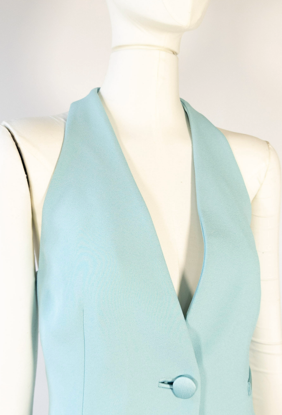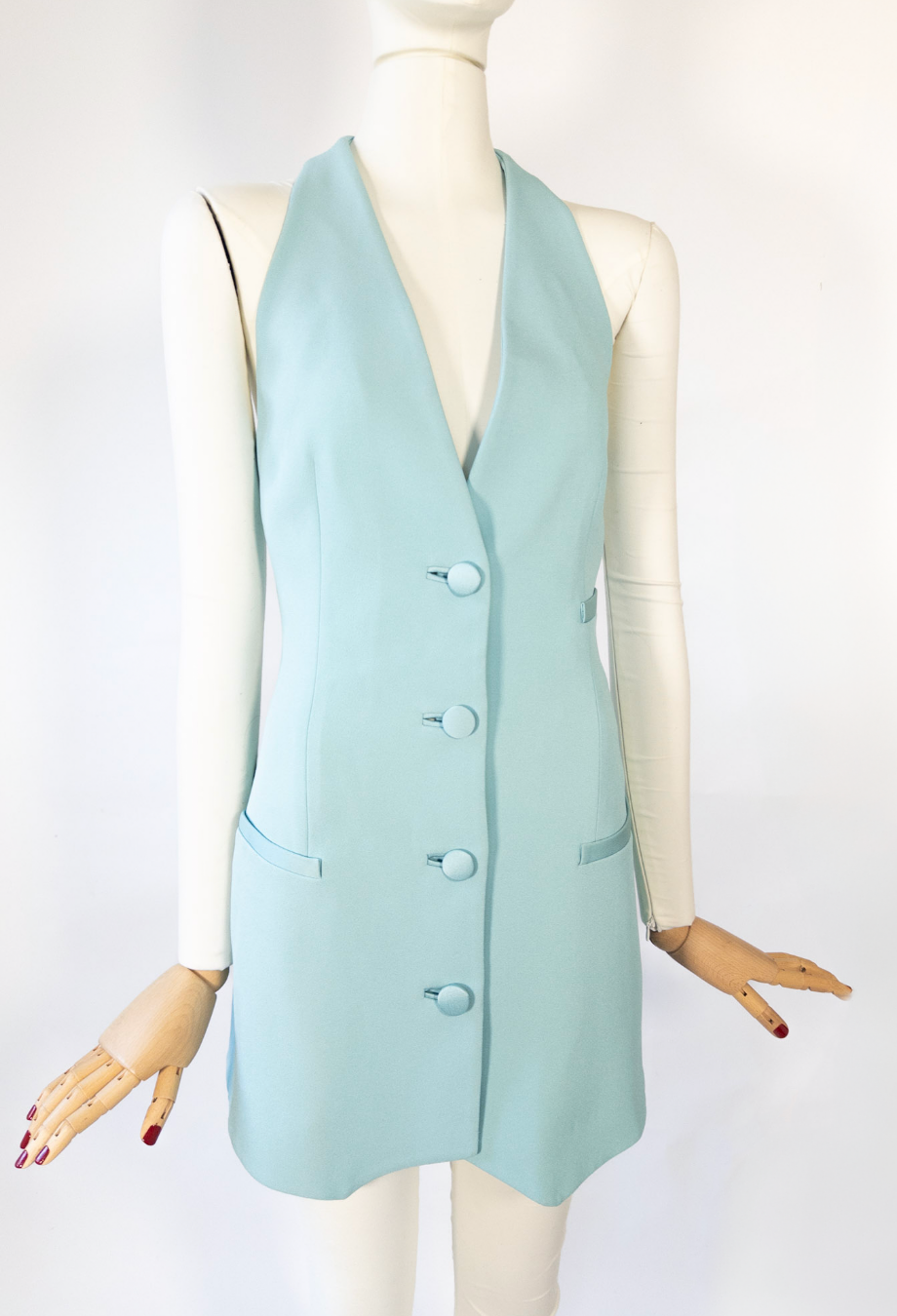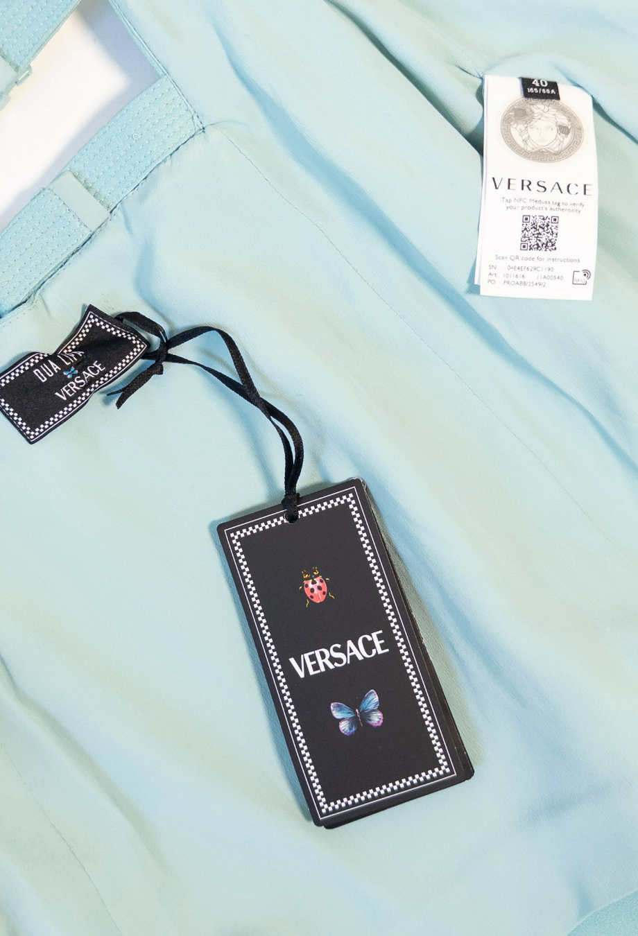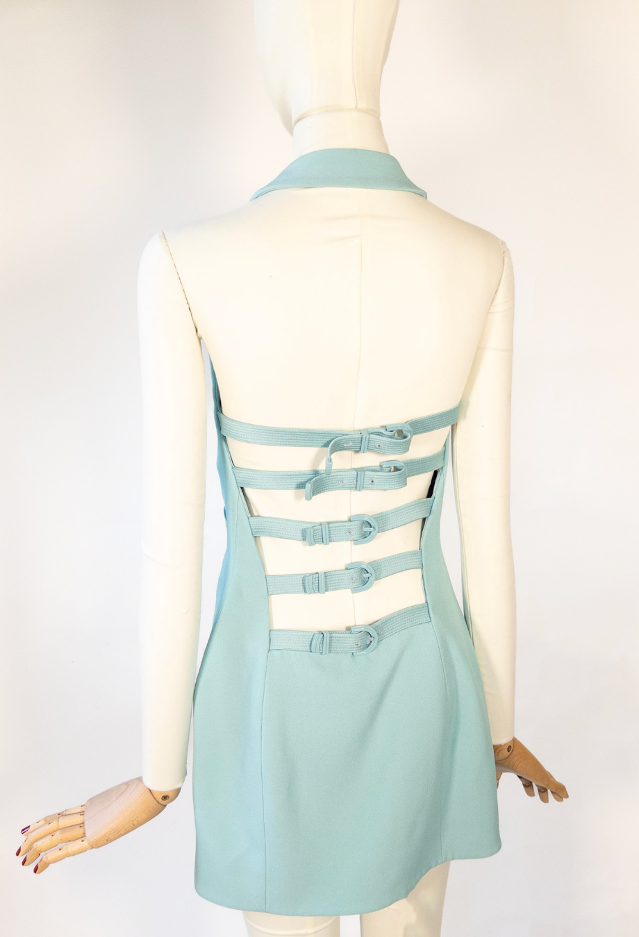 Versace’s collaboration with Dua Lipa channels a nostalgic spirit through a bold, contemporary lens—and this halter mini dress captures the intention perfectly. Tailored from structured crepe in a fresh pastel blue, it nods to the house’s signature blazer dress silhouette with a deep plunge neckline, sharply cut halter straps and tonal button fastenings through the front. The clean, minimal front is beautifully contrasted by an unexpected open back, defined by a series of adjustable belt straps - a beautiful homage to Gianni Versace designs. Style this dress with strappy heels or layer under a blazer for a fun evening look.
