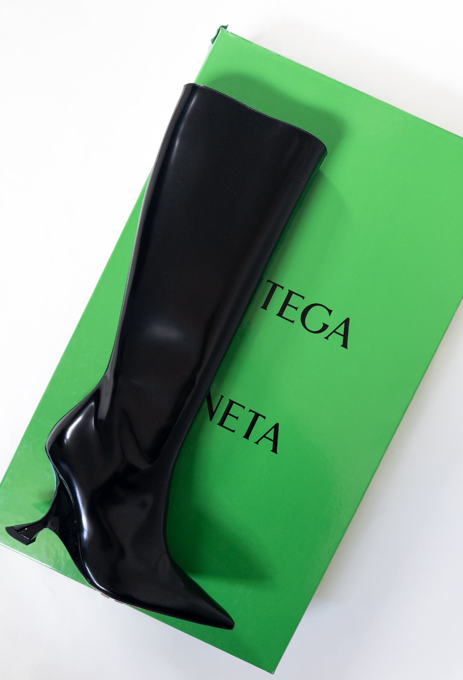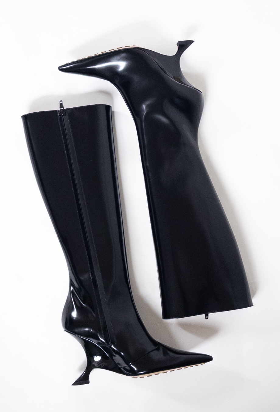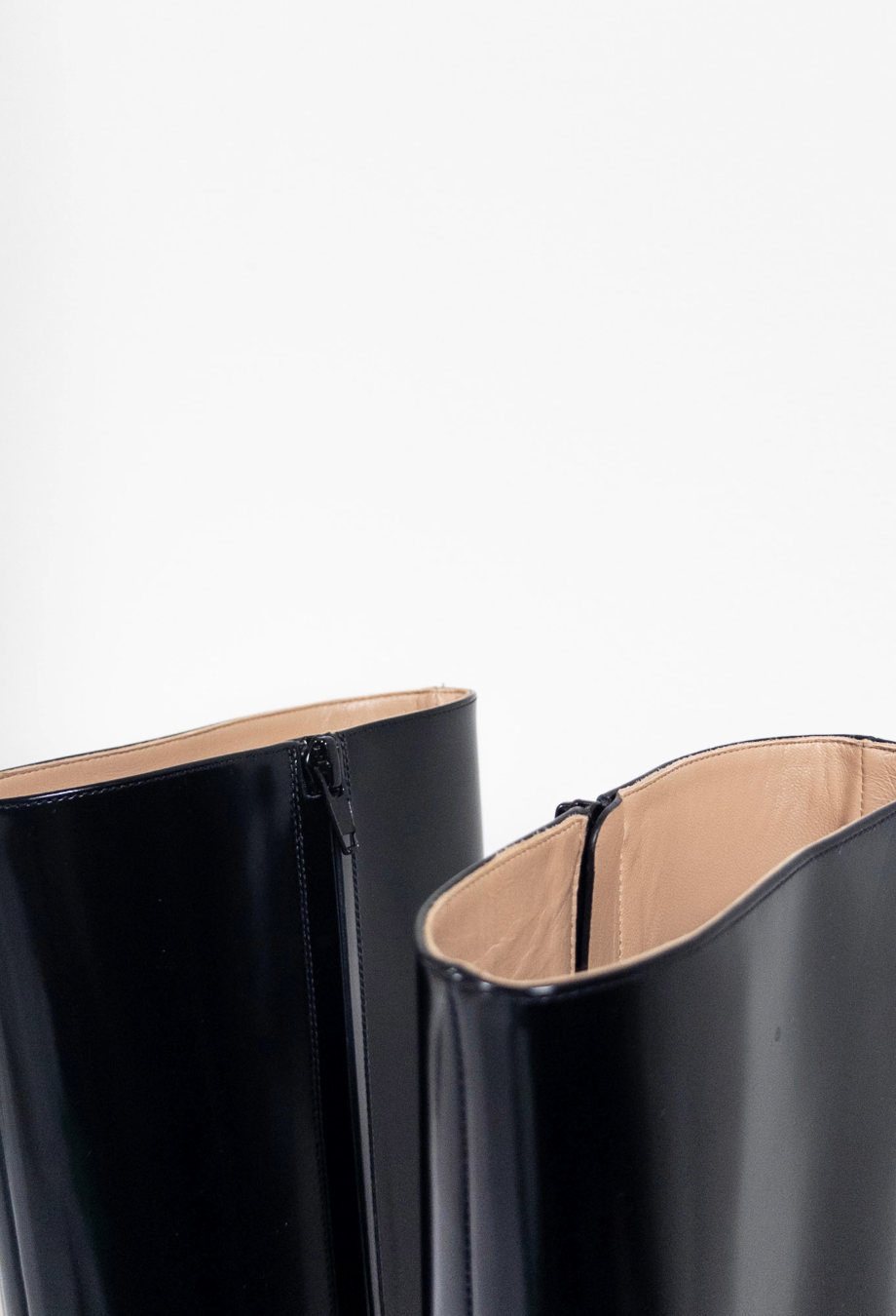 Sleek and sculptural, Bottega Veneta’s Rocket boots are a modern icon of the house’s architectural approach to design. Crafted in Italy from high-shine black patent leather, the knee-high silhouette is sharp, set on a uniquely shaped platform. Finished with a side zip for ease and smooth leather lining, they transition effortlessly from day to evening. Style them with tailored mini dresses or a skirt suit for a perfectly sharp look.