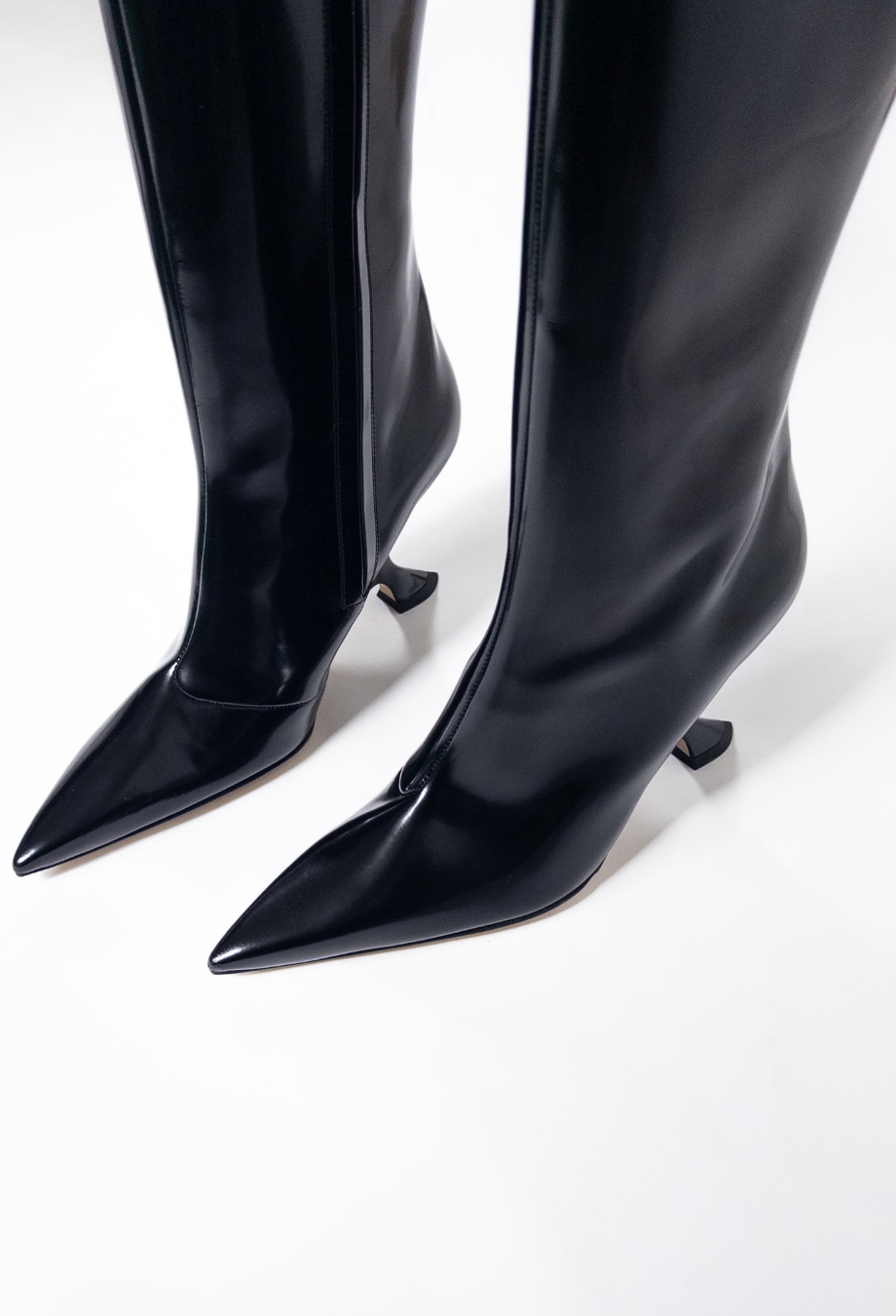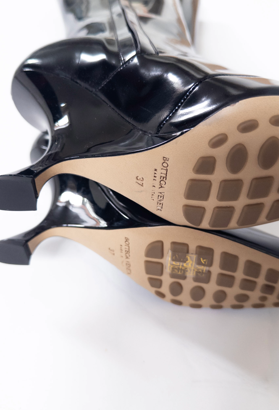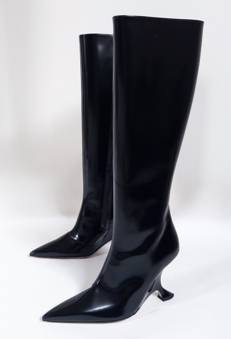 Sleek and sculptural, Bottega Veneta’s Rocket boots are a modern icon of the house’s architectural approach to design. Crafted in Italy from high-shine black patent leather, the knee-high silhouette is sharp, set on a uniquely shaped platform. Finished with a side zip for ease and smooth leather lining, they transition effortlessly from day to evening. Style them with tailored mini dresses or a skirt suit for a perfectly sharp look.