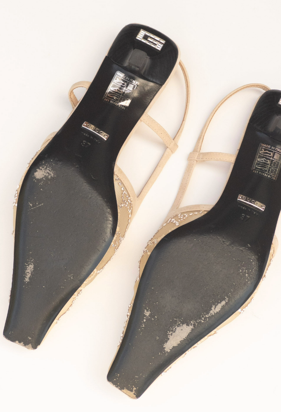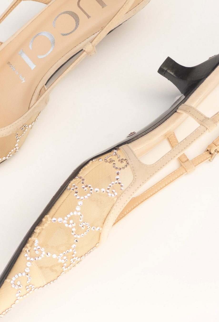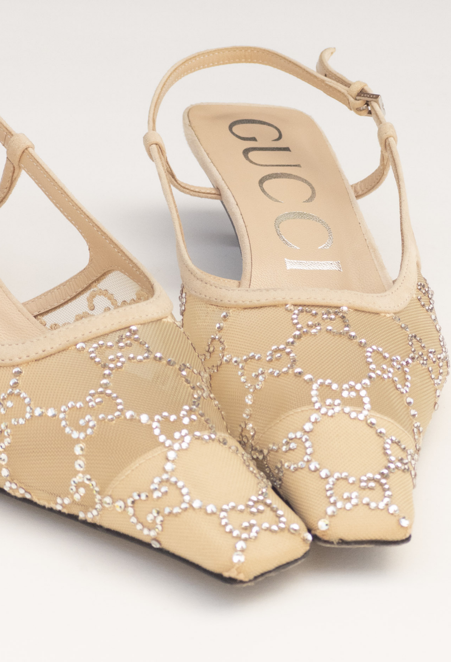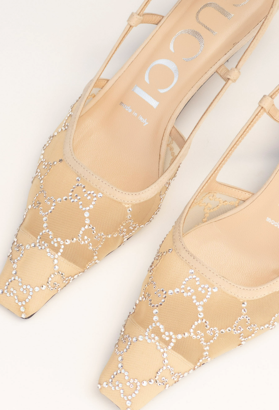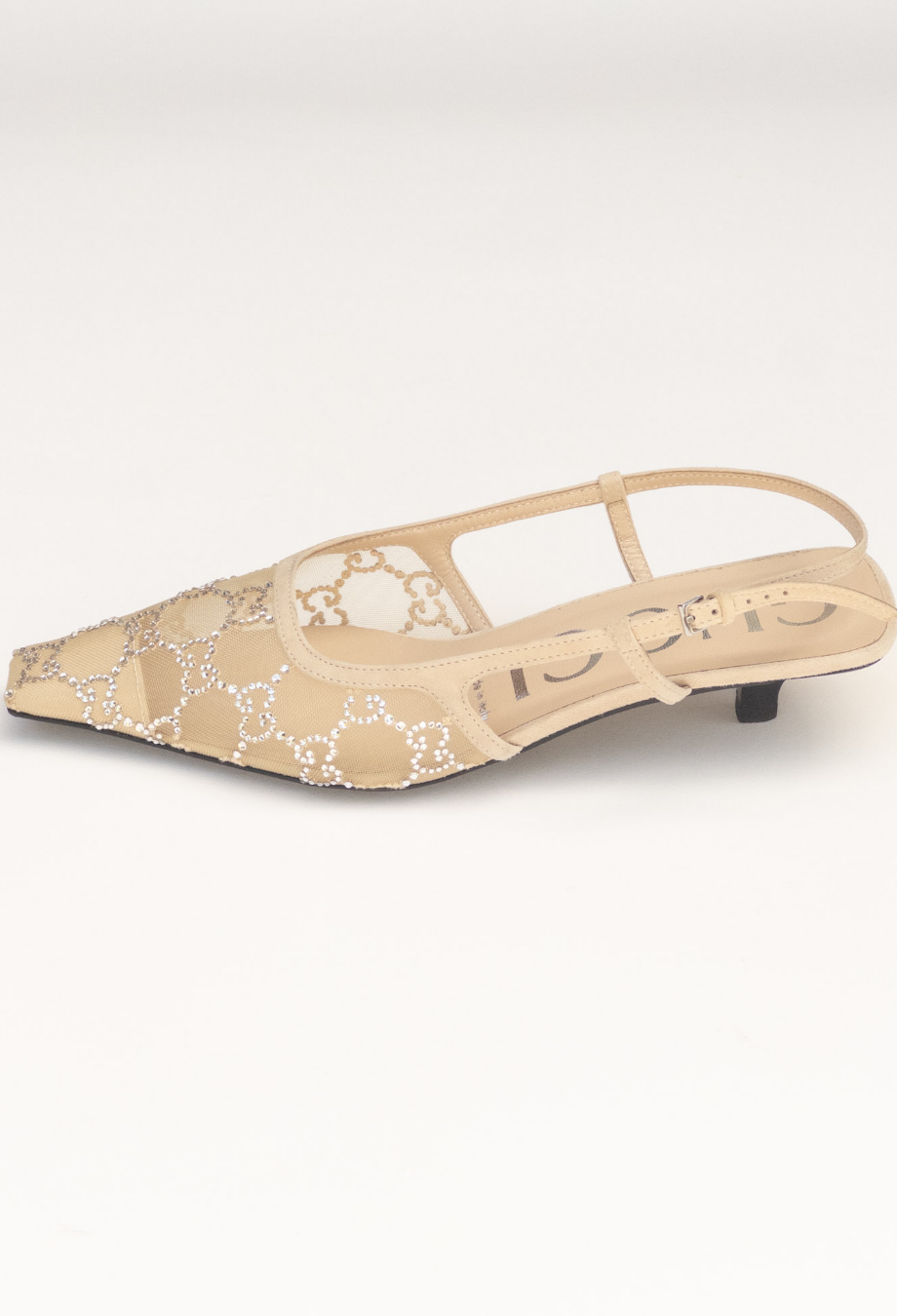 Gucci GG Embellished Slingback Heels embody the house’s signature blend of timeless elegance and modern opulence. Crafted in Italy from supple leather, the sleek pointed-toe silhouette is adorned with the iconic GG hardware, shimmering with crystal embellishments that catch the light beautifully with every step. A delicate slingback strap, finished with an adjustable buckle, ensures the perfect fit, while the sculptural kitten heel adds a touch of effortless sophistication. Wear yours with everything from sharp tailoring to fluid midi dresses for a look that exudes refined glamour.