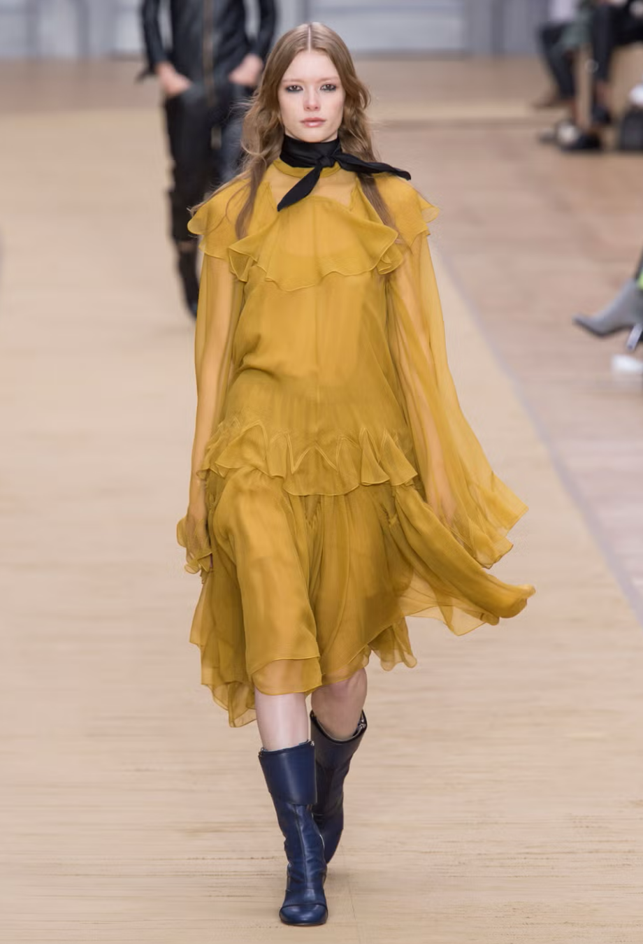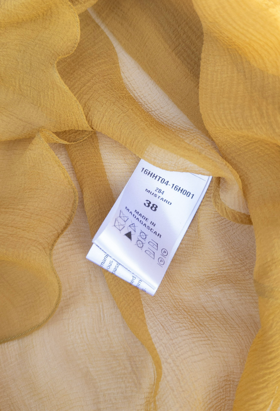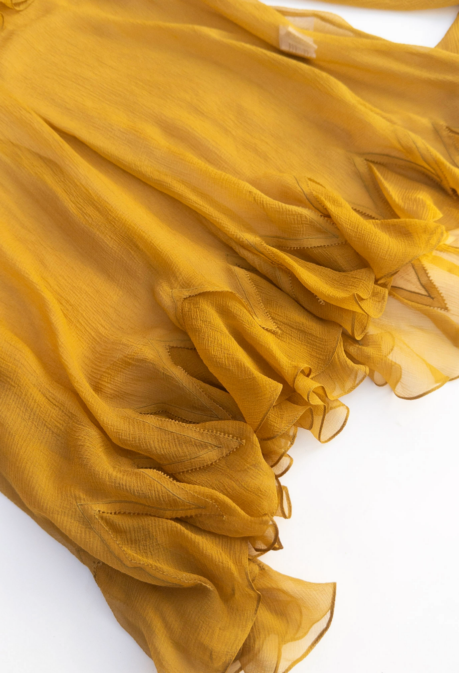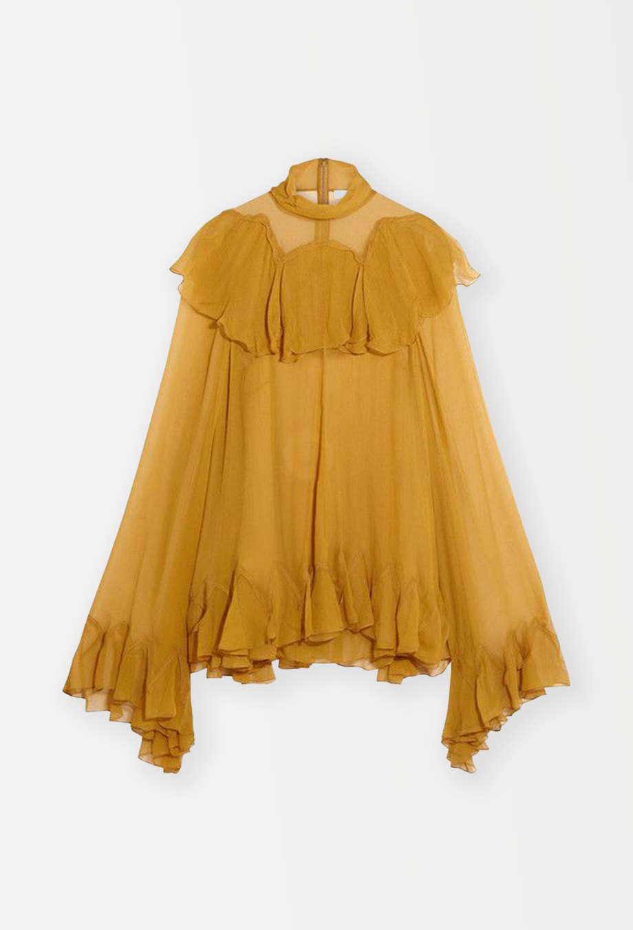 Chloé’s bohemian spirit take centre stage in this floaty mustard blouse, a diaphanous ode to the house’s 1970s-inflected heritage. Cut from featherlight crinkled silk, the semi-sheer silhouette falls with ethereal ease, detailed with cascading ruffles that frame the hem, and dramatically flared cuffs. The high neckline and gently puffed sleeves add a romantic, vintage-inspired air, while the asymmetric hem enhances its sense of fluid movement. Let it billow over tailored trousers or anchor it with tonal suede for an effortlessly undone Parisian mood.
