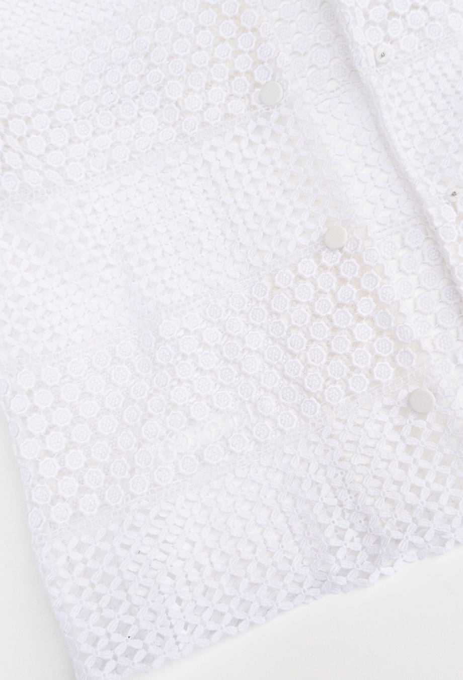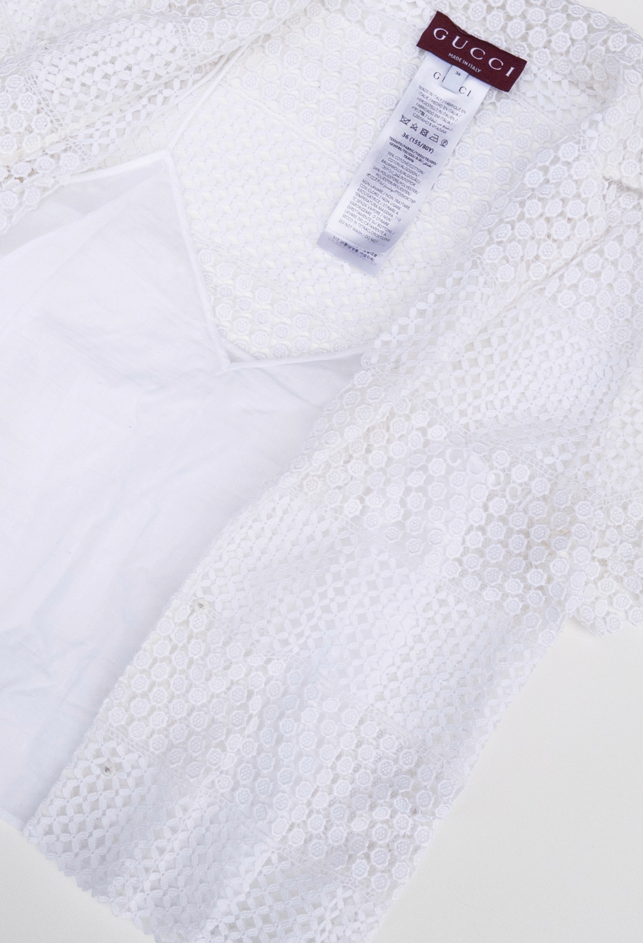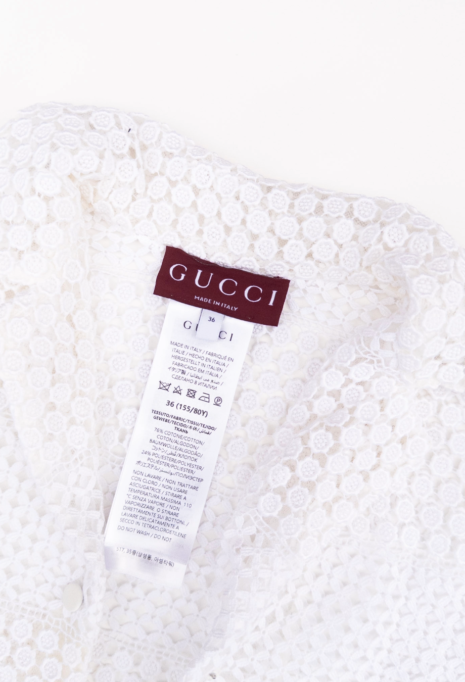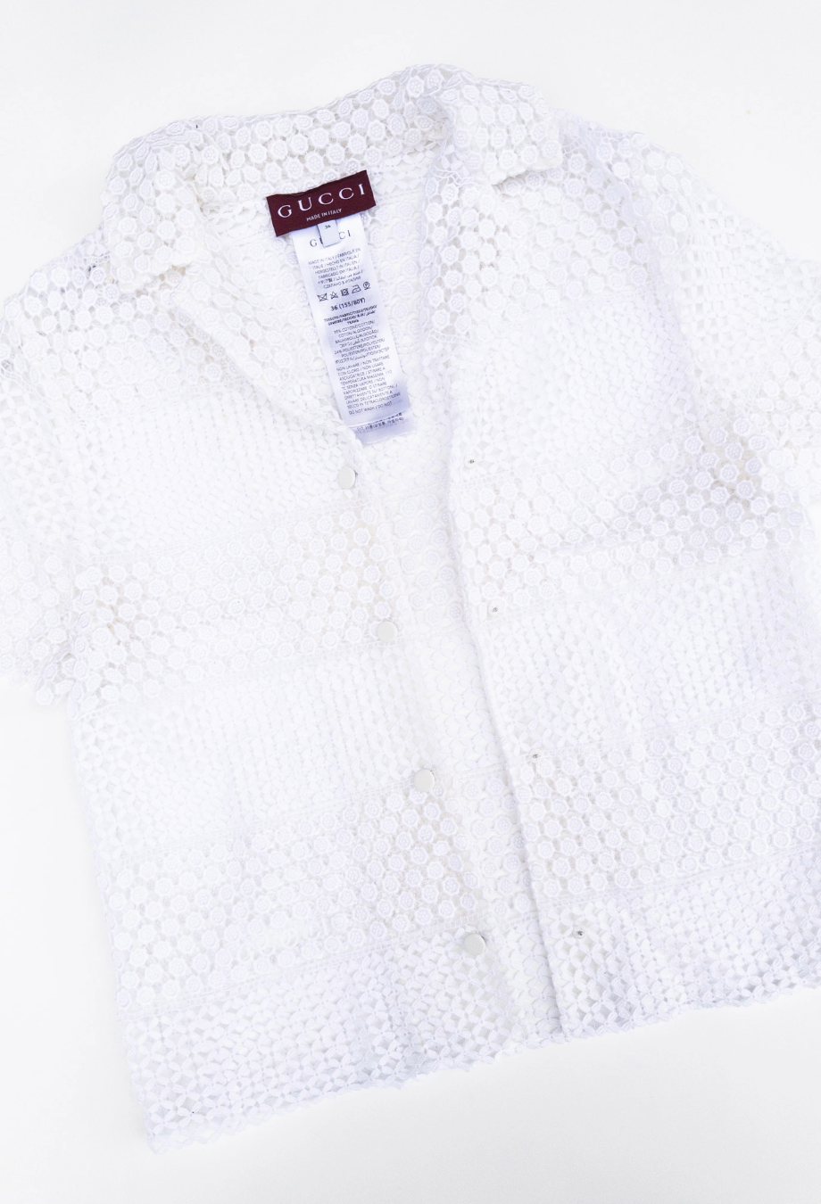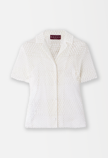 Gucci Cruise 2025 collection embraces delicate craftsmanship with a contemporary spirit, and this macramé shirt is a beautiful expression of both. Made in Italy from a soft cotton-blend, it’s constructed in alternating bands of floral and geometric lacework that play with transparency and texture in an intricate way. The silhouette is gently structured with short sleeves, a camp collar and a concealed snap front, allowing the artisanal fabric to take centre stage. Can be worn with or without detachable cotton camisole.