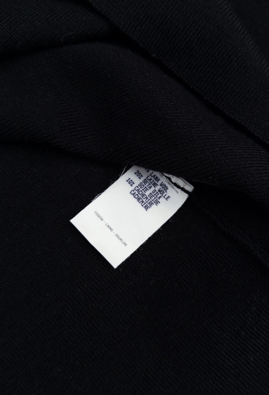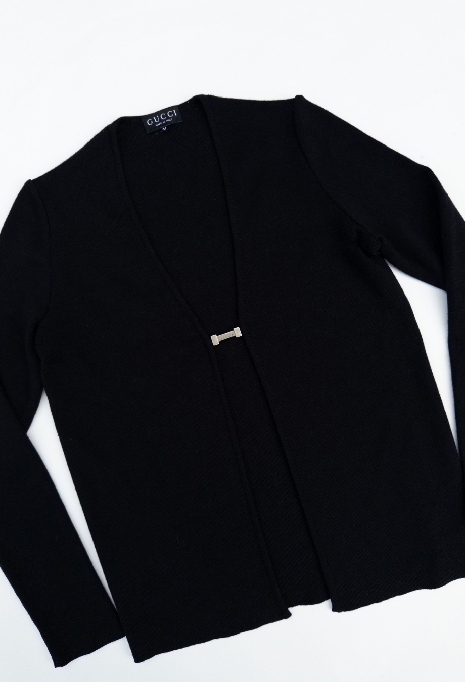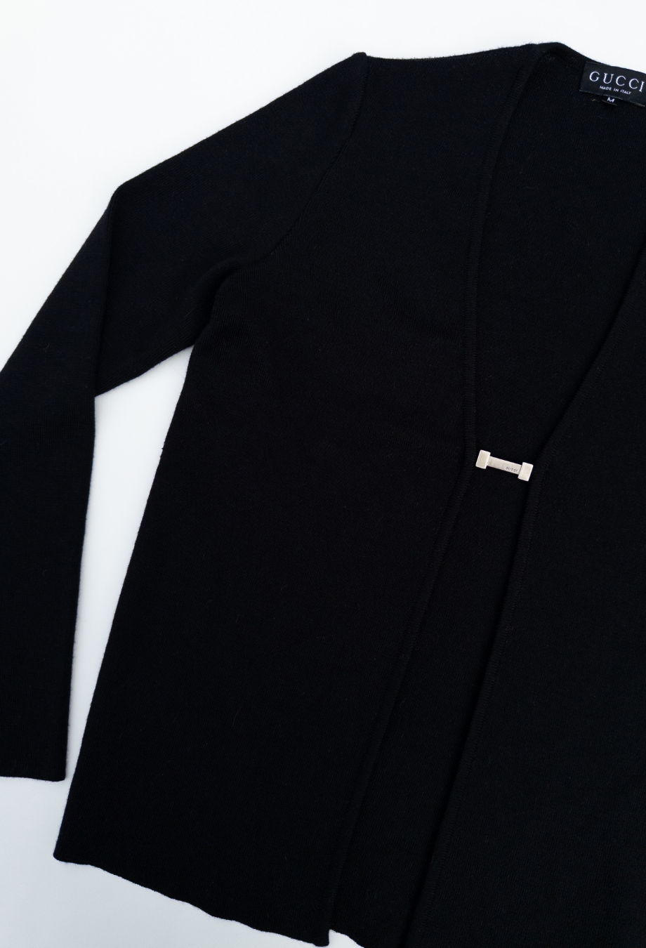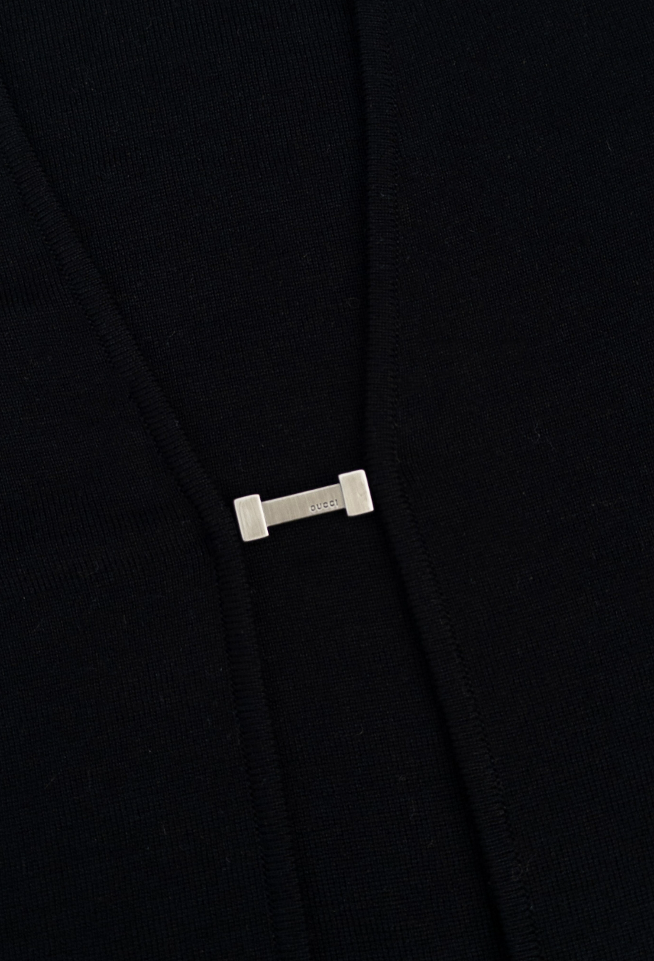 Gucci x Tom Ford SS 1997 Silver Tab Cardigan — made in Italy from a fine-gauge knit blend of wool, silk and cashmere, the design hugs the frame with soft structure and an almost fluid drape. The defining detail — a brushed silver-tone bar subtly engraved with the house’s logo — fastens the open front, creating a sleek, barely-there closure that draws the eye. Pair this rare collector's piece with other Gucci x Tom Ford pieces from our store.