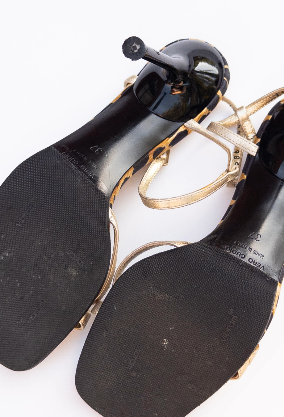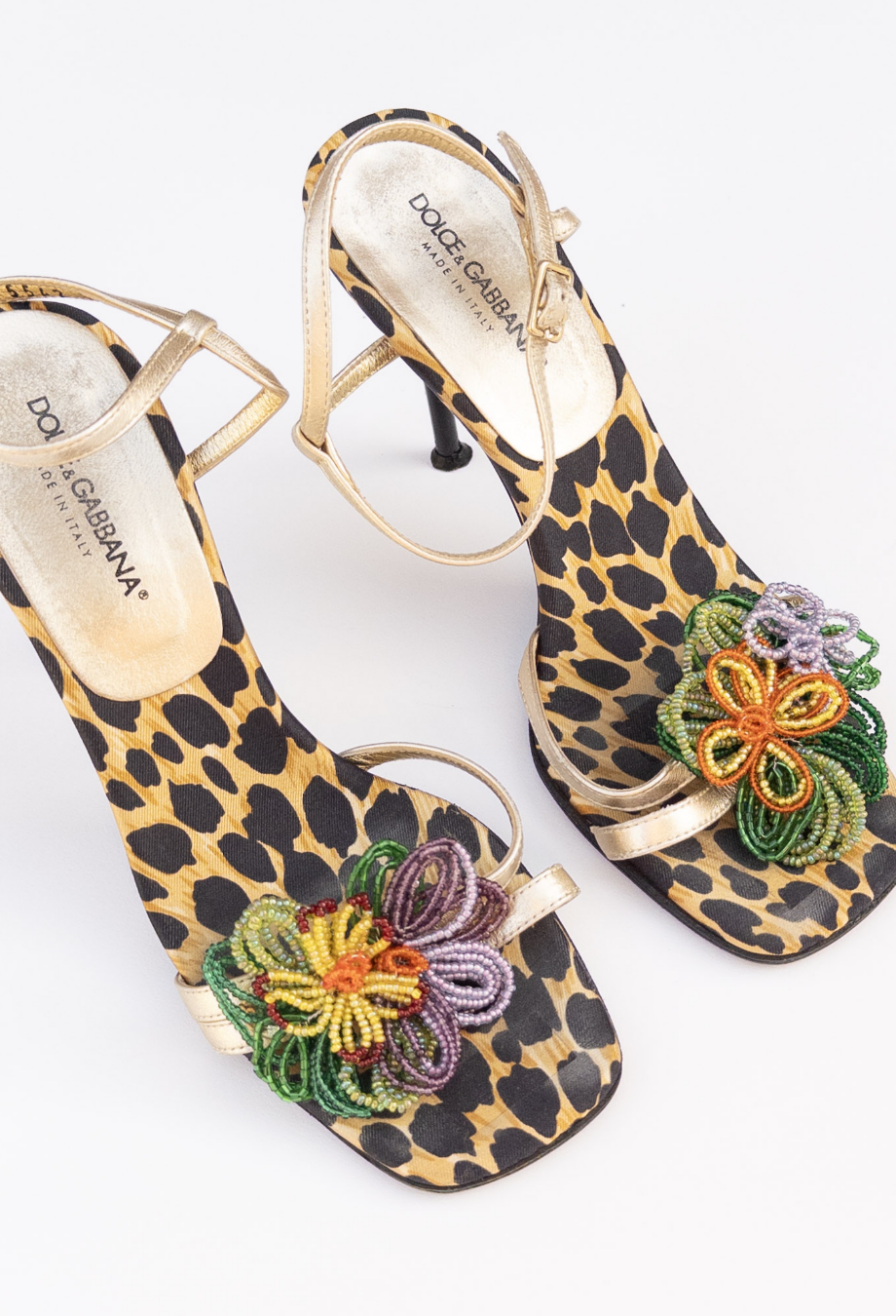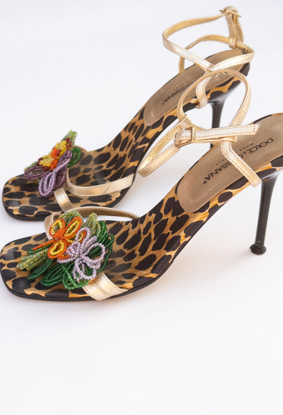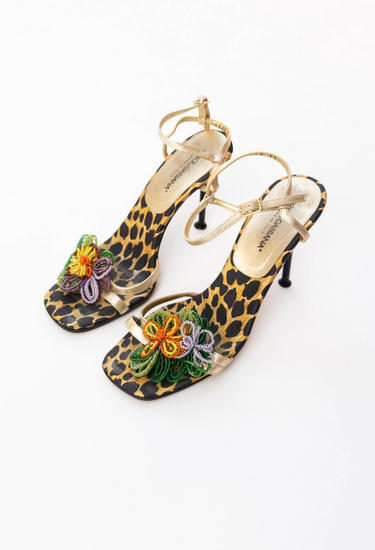 Rich with archival opulence, these vintage Dolce and Gabbana heels are a celebration of the house’s unmistakable flair for bold prints and embellishments. Set on a stiletto heel, the silhouette is covered in signature leopard-print satin and adorned with hand-beaded floral appliqués in vivid jewel tones — a nod to the label’s Sicilian exuberance and ornate craftsmanship. Metallic gold leather straps wind elegantly across the foot and ankle, providing a sculptural contrast to the lush textile base. Every element, from the square toe to the lacquered heel, speaks to an era when glamour was maximal and unapologetically theatrical. A rare collector’s piece from Dolce & Gabbana’s embellished archives.