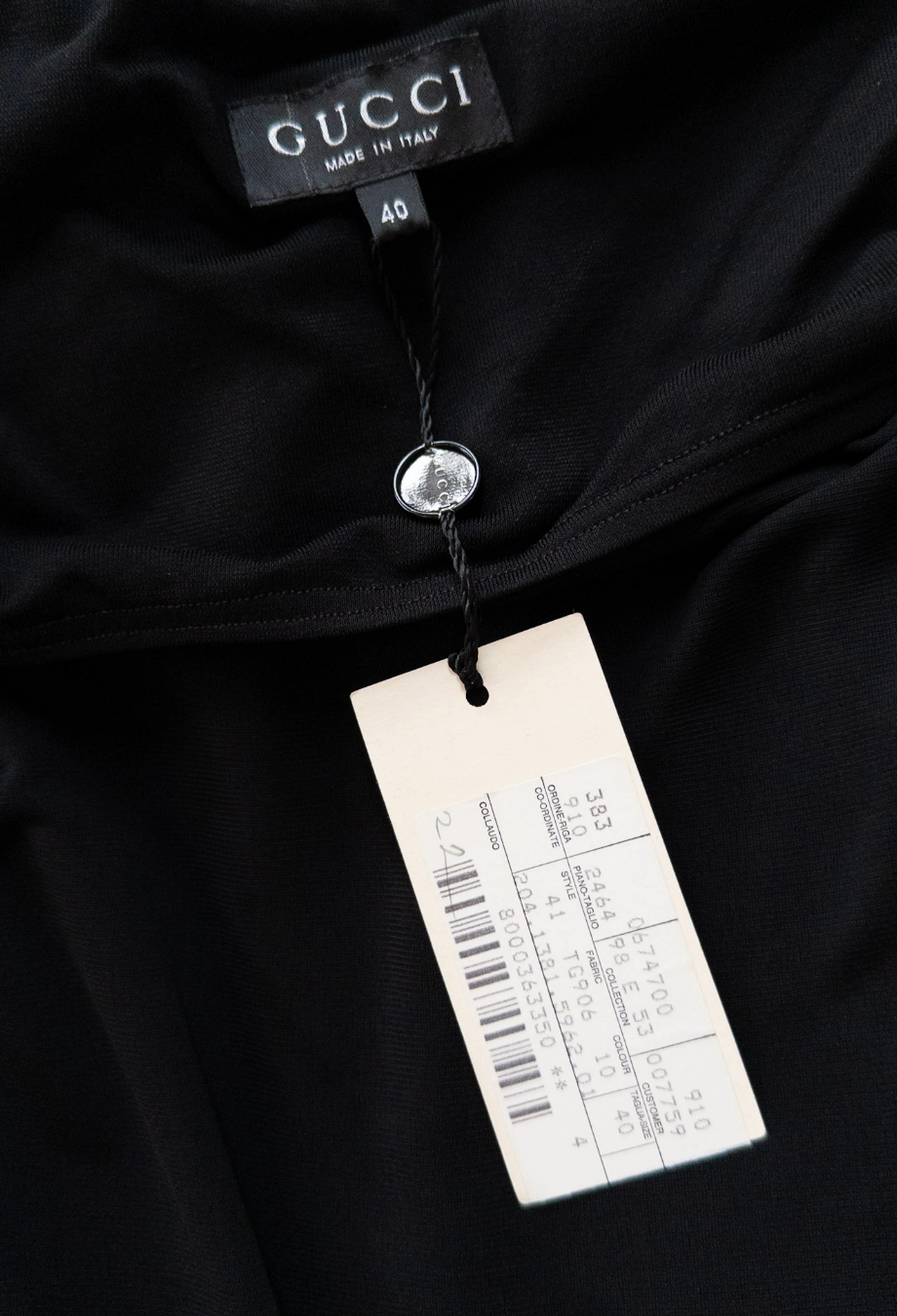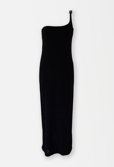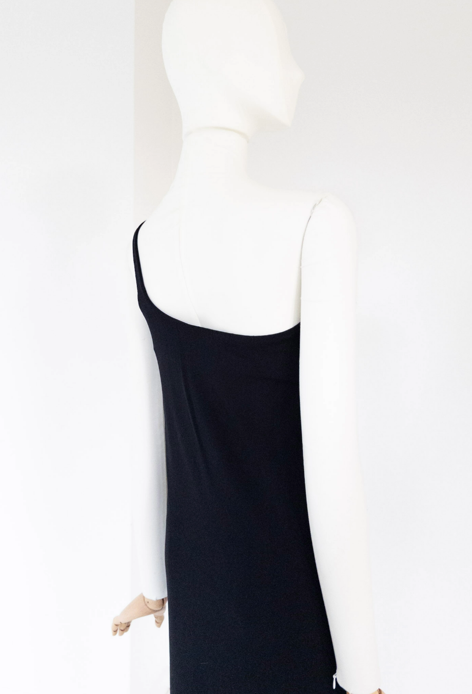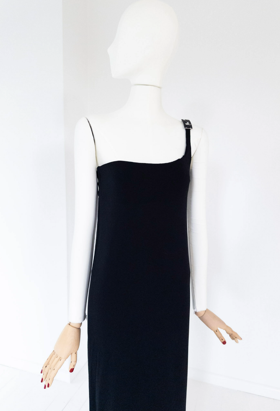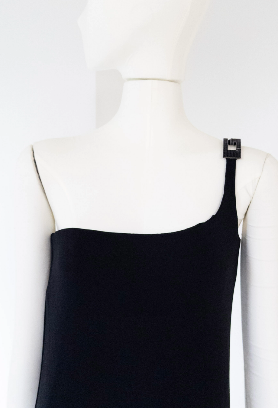 Gucci x Tom Ford 1998 G Crystal One Shoulder Dress — This dress encapsulates the designer’s vision of minimalist chic. Cut from a fluid black fabric, the floor-skimming silhouette clings to the body with an almost liquid drape. The focal point is a single shoulder strap fastened with an oversized black crystal-encrusted ‘G’ hardware - an archival emblem of the Ford era. Rare and collectable item.