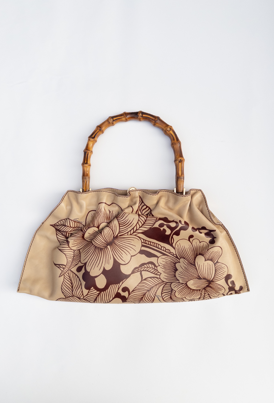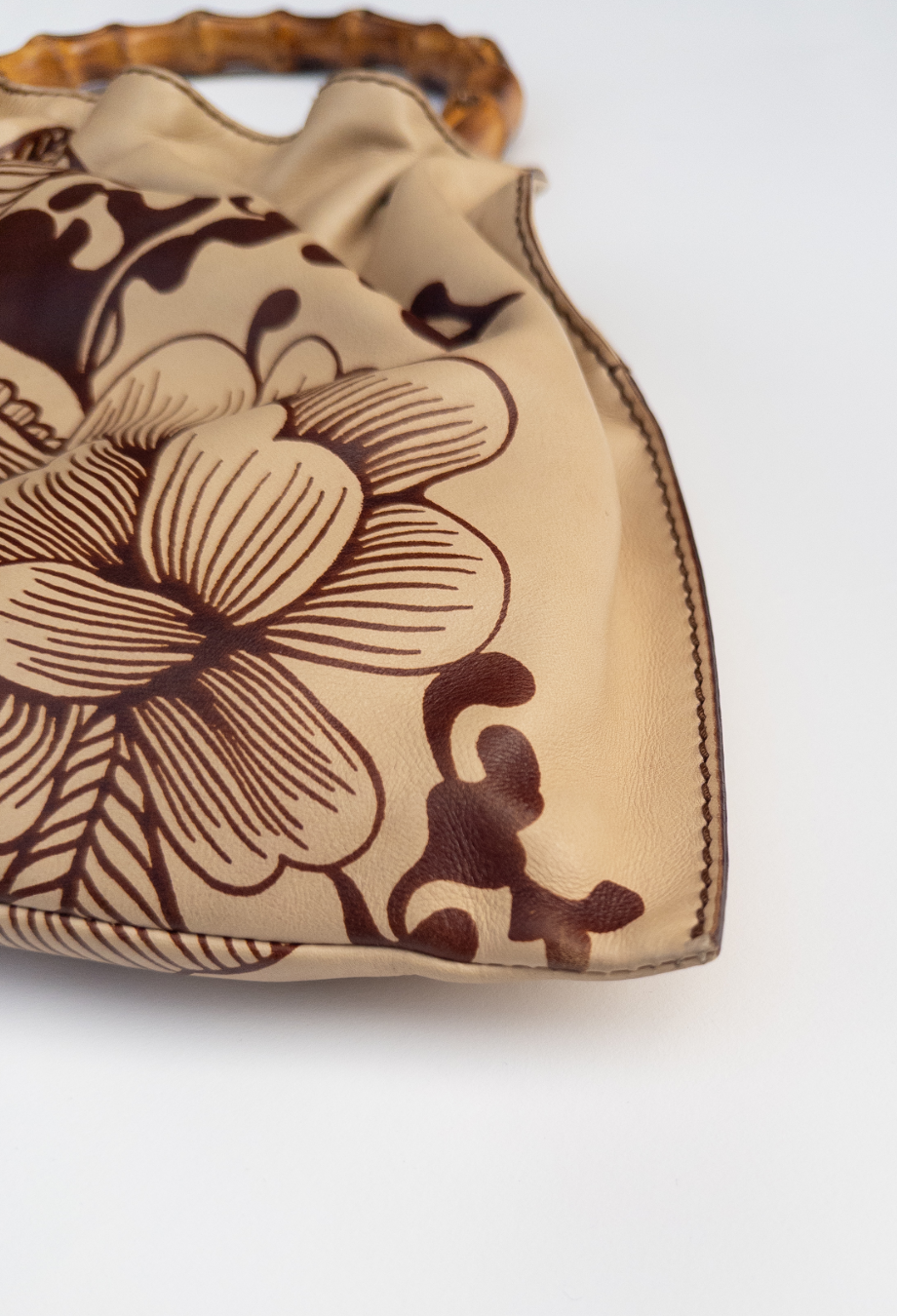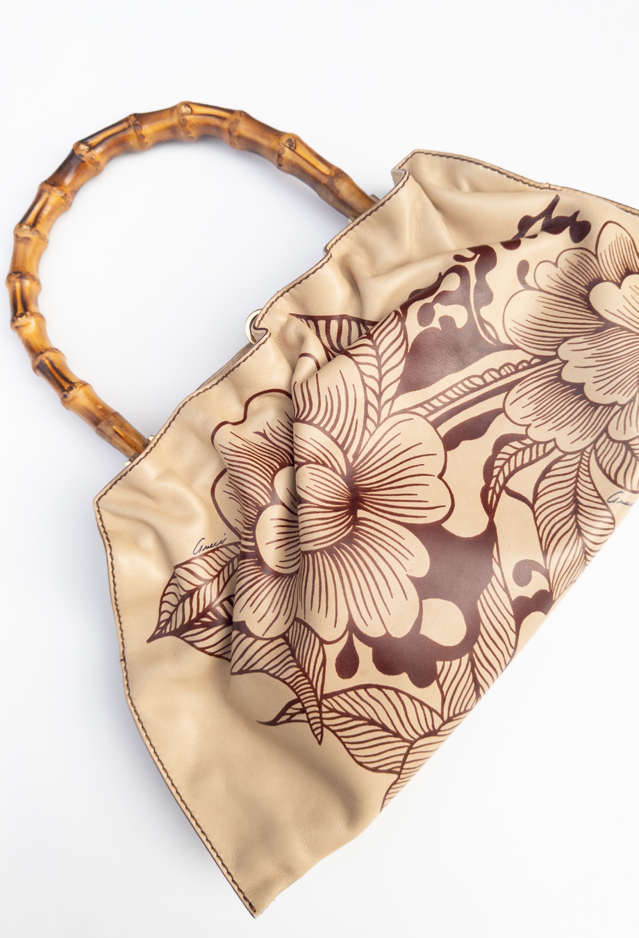 A true archival gem from Tom Ford’s unforgettable reign at Gucci, this Tattoo Bag from the Spring/Summer 2003 collection is one of only 350 units made. Crafted in Italy from supple beige leather, the softly structured silhouette is adorned with an intricate, oversized floral motif rendered in deep brown - a direct reference to classic tattoo art.The bag’s fluid, organic form is framed by Gucci’s signature bamboo top handles - a house icon reinterpreted here with Ford’s signature touch. This piece is a must for collectors of Ford-era Gucci.