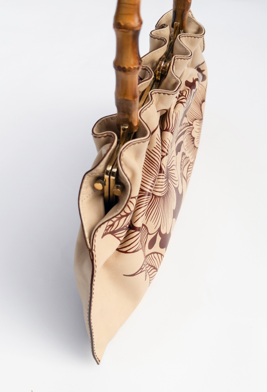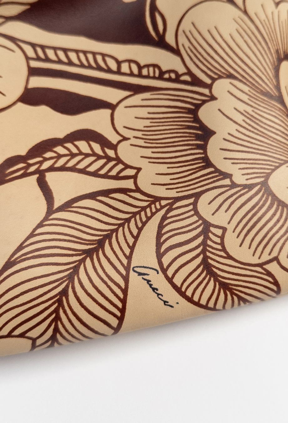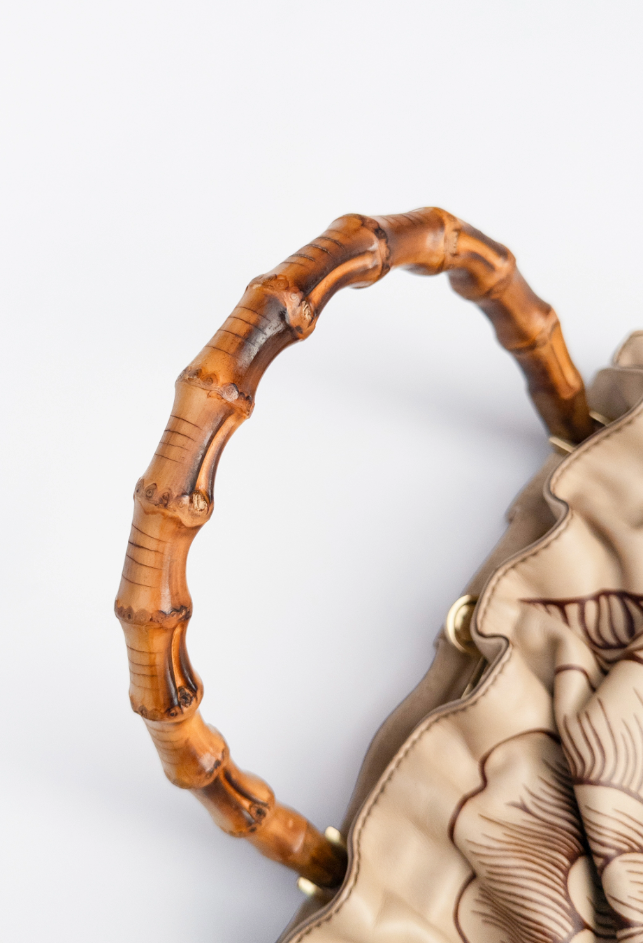 A true archival gem from Tom Ford’s unforgettable reign at Gucci, this Tattoo Bag from the Spring/Summer 2003 collection is one of only 350 units made. Crafted in Italy from supple beige leather, the softly structured silhouette is adorned with an intricate, oversized floral motif rendered in deep brown - a direct reference to classic tattoo art.The bag’s fluid, organic form is framed by Gucci’s signature bamboo top handles - a house icon reinterpreted here with Ford’s signature touch. This piece is a must for collectors of Ford-era Gucci.