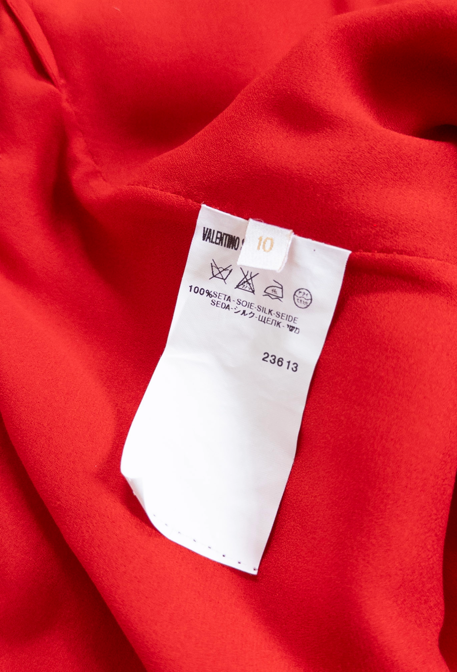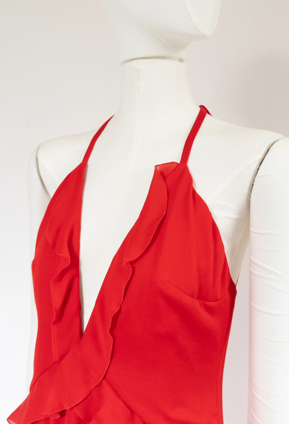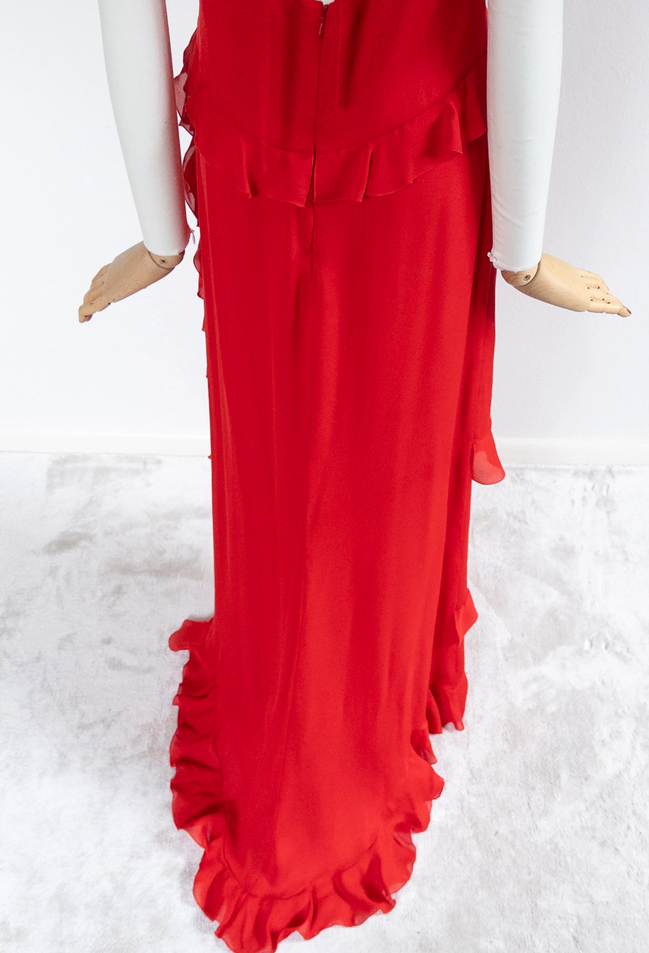 This ruffled gown from Valentino’s late 1990s captures the house’s romantic essence. Crafted from weightless silk chiffon, the gown cascades effortlessly along the body, its bias-cut form moving with an ethereal lightness. The halterneck design frames the shoulders and décolletage with a deep, plunging neckline trimmed in delicate ruffles that continue to trace the waist and hemline, creating a soft sense of movement with every step. Rendered in the maison’s signature shade of red, this piece embodies classic Valentino moment - an unforgettable statement for formal occasions or red-carpet moments alike. Style with strappy heels and a sleek updo to showcase its sculptural lines.