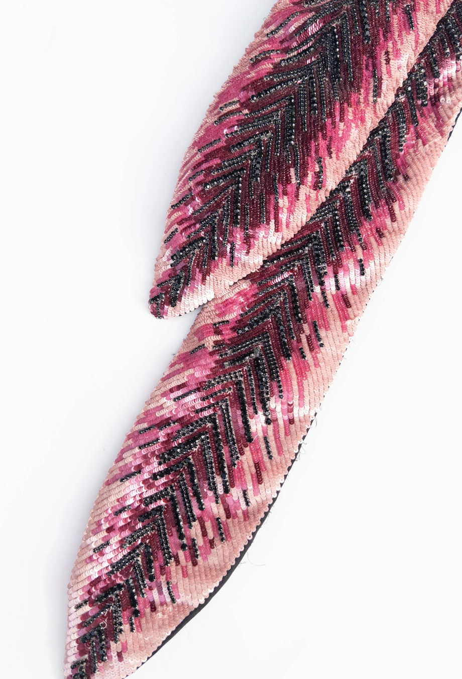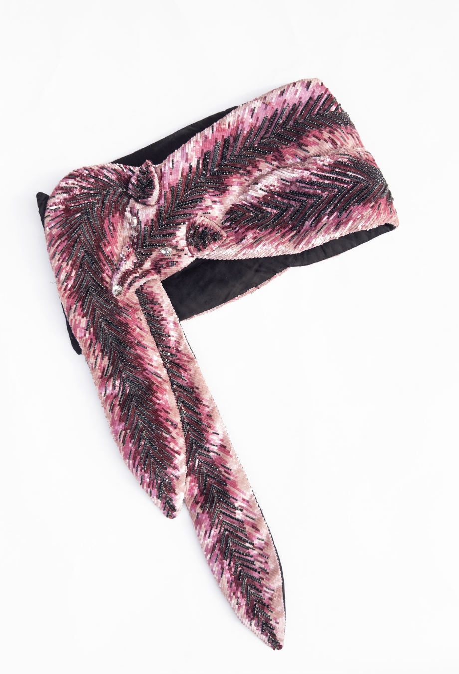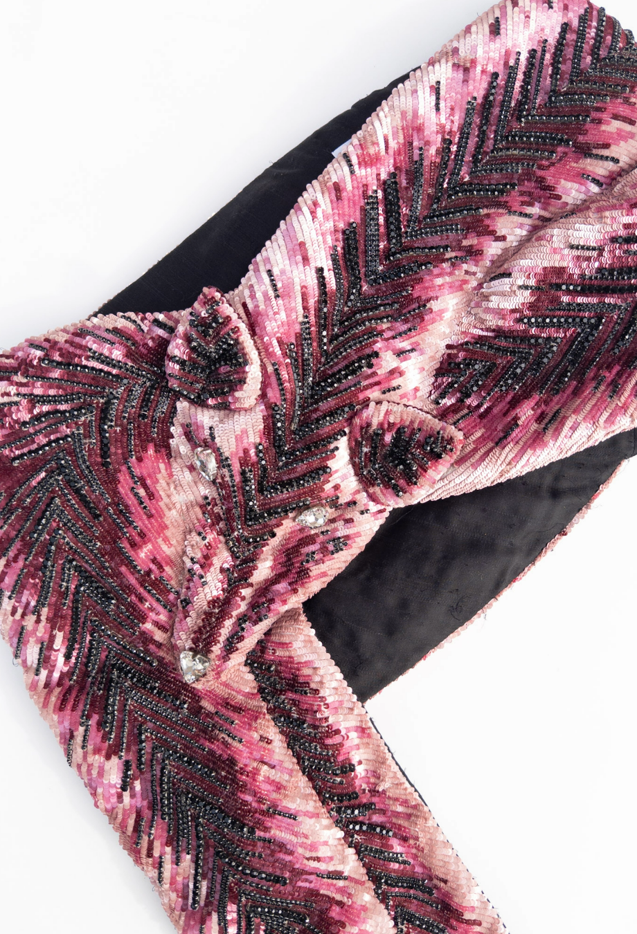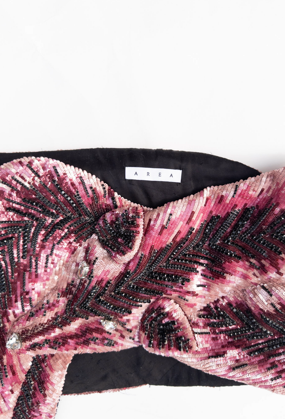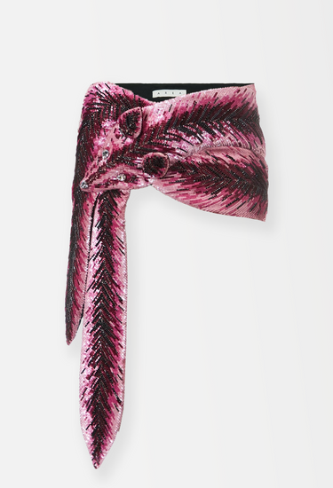 AREA’s couture creations often blur the line between surrealism and feminitniy, and this embroidered mini skirt is no exception. Area NYC Couture Embroidered Fox Skirt - a longer version of this piece was worn on the Area Fall Couture 2023 runway, highlighting its transformative drama in motion. Sculpted in a trompe l’oeil fox motif, the piece is brought to life through dense, hand-applied sequins in tonal shades of fuchsia, burgundy and jet black, meticulously arranged in directional herringbone patterns to mimic the texture of fur. The pointed hem and crystal-encrusted face nod to couture-level costume artistry, while the sharp asymmetry creates dynamic movement when worn. Designed to sit low on the waist, it pairs best with a minimal top and thigh-high boots.